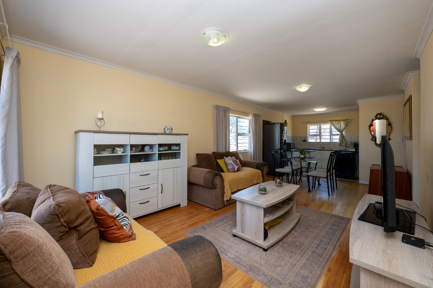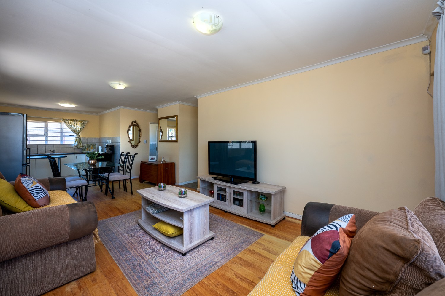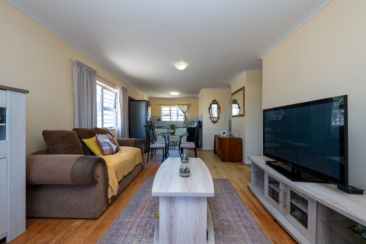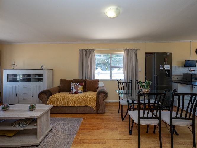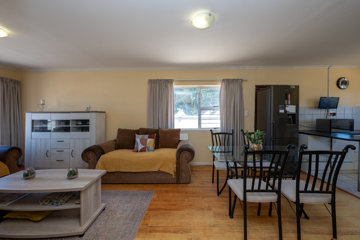 Step inside to an open-plan lounge, dining room, and kitchen, creating a welcoming flow throughout the home. The lounge features beautiful flooring and large windows that fill the space with natural sunlight. The kitchen is fitted with light wood cupboards, ample countertop space and includes space for a fridge, making it both functional and inviting.