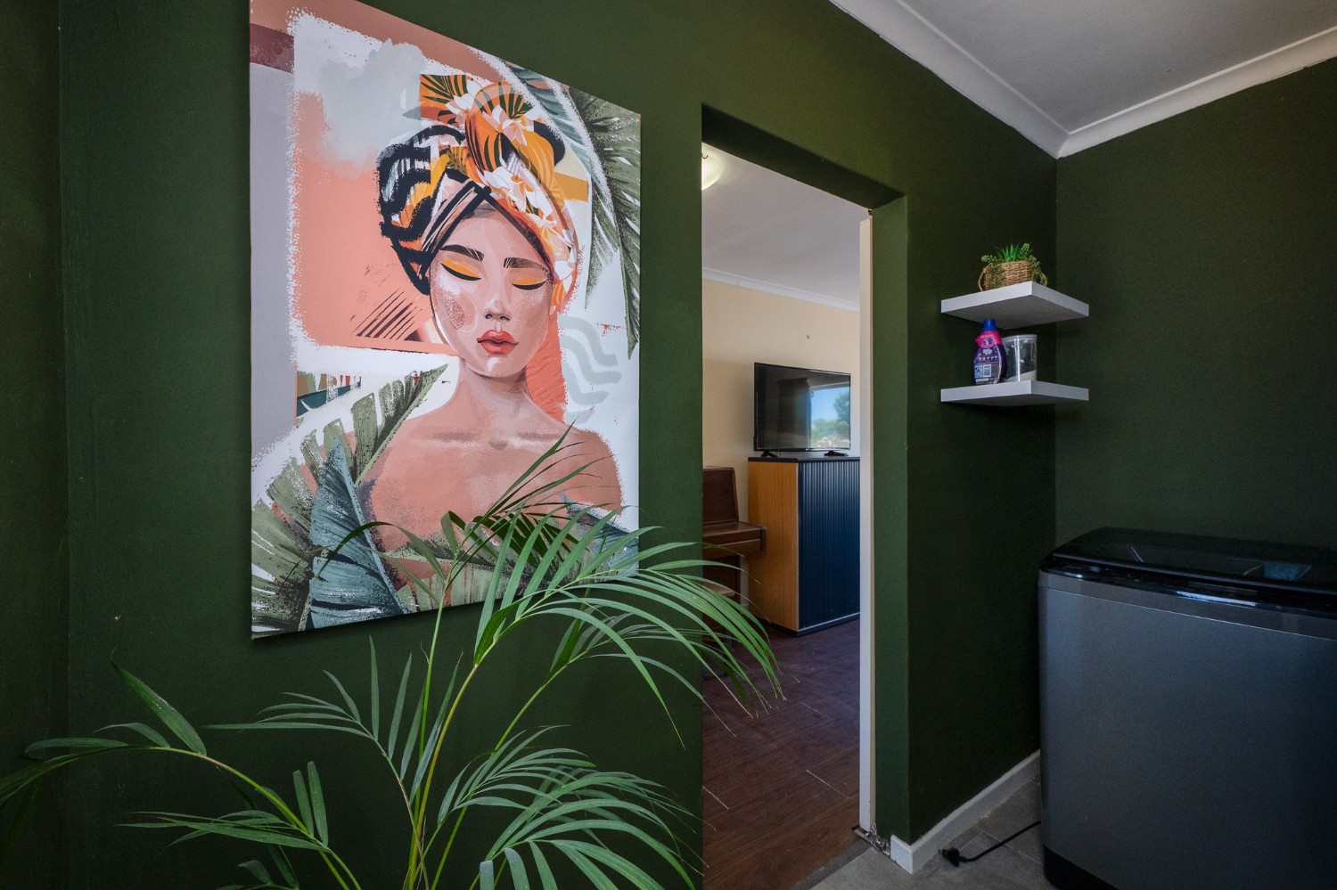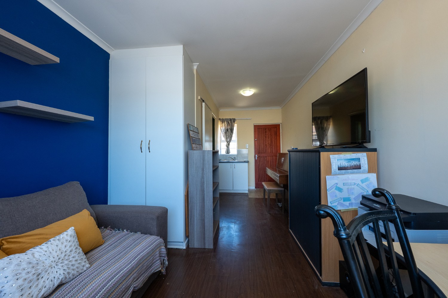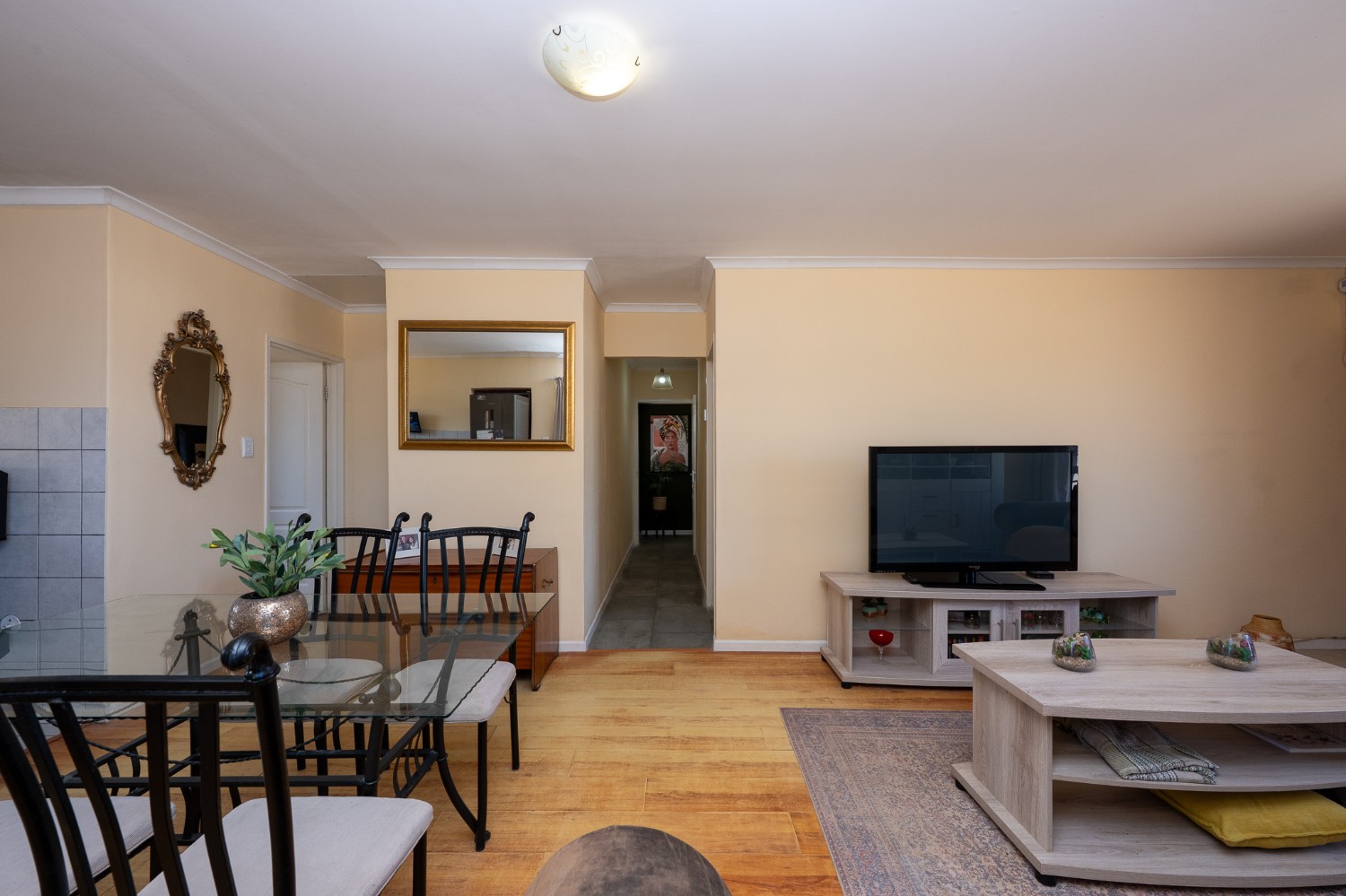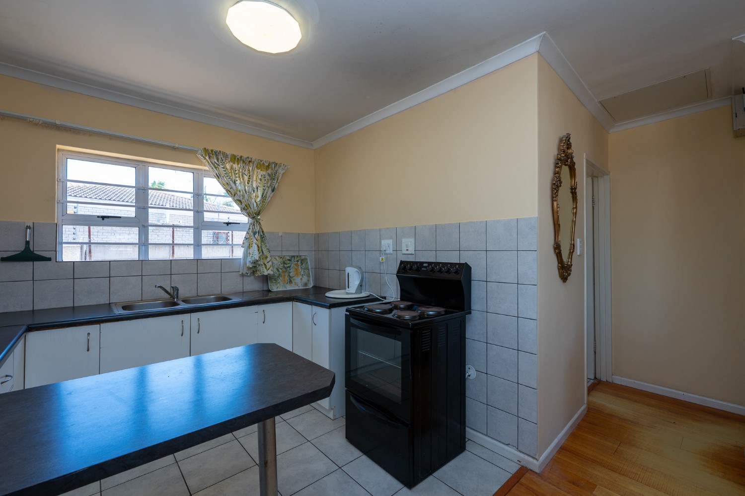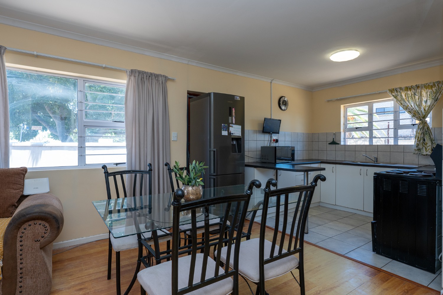 Step inside to an open-plan lounge, dining room, and kitchen, creating a welcoming flow throughout the home. The lounge features beautiful flooring and large windows that fill the space with natural sunlight. The kitchen is fitted with light wood cupboards, ample countertop space and includes space for a fridge, making it both functional and inviting.