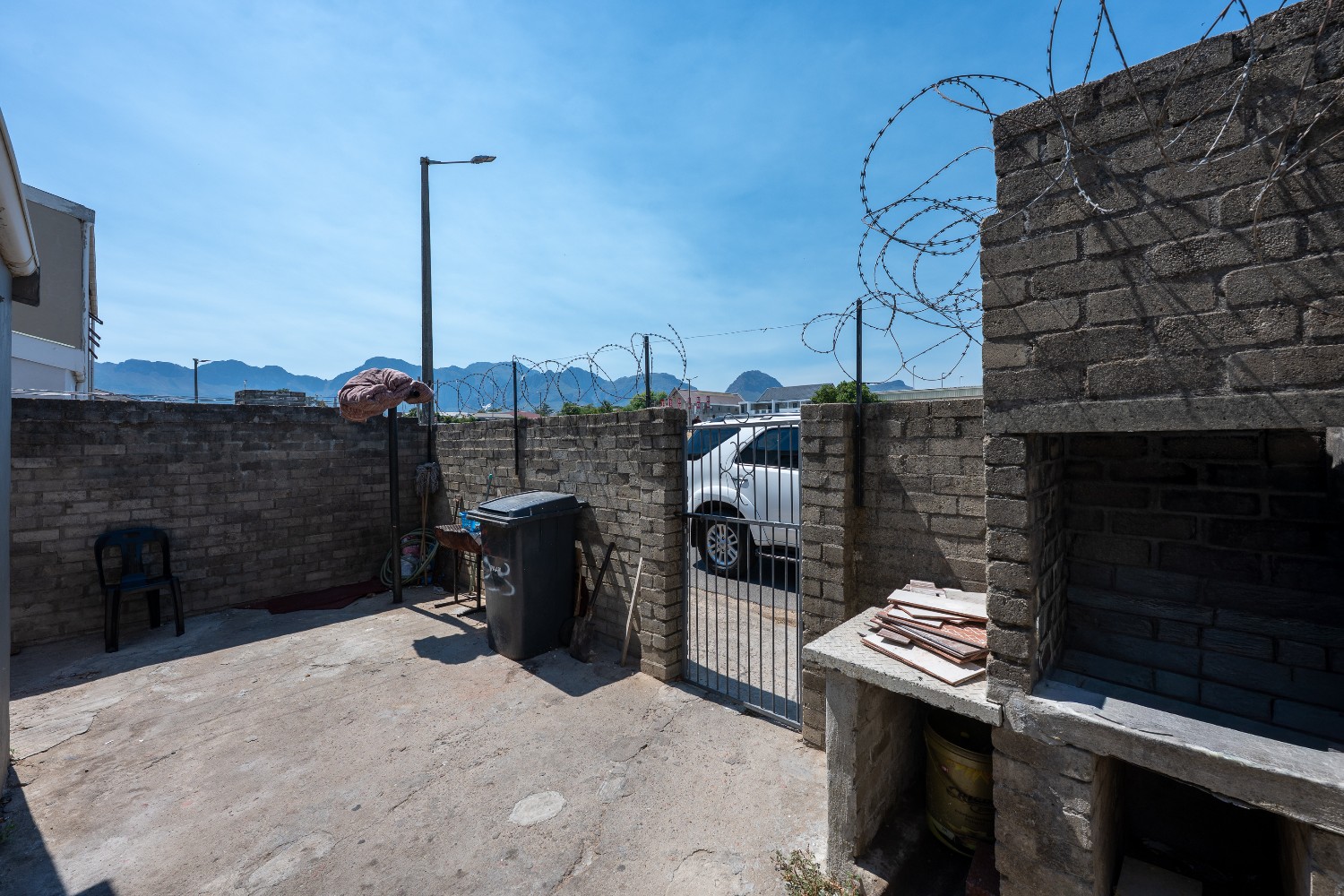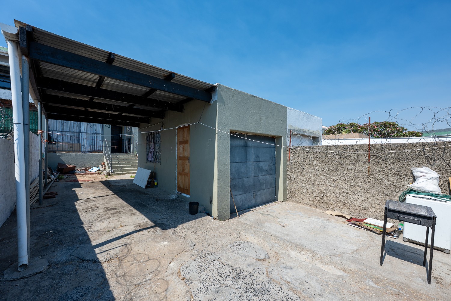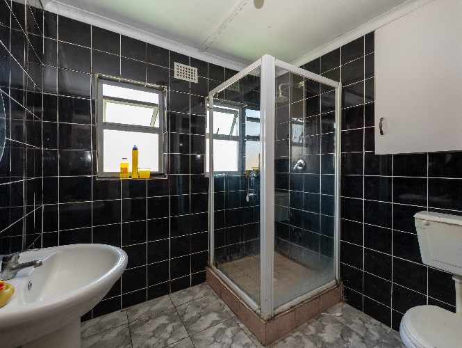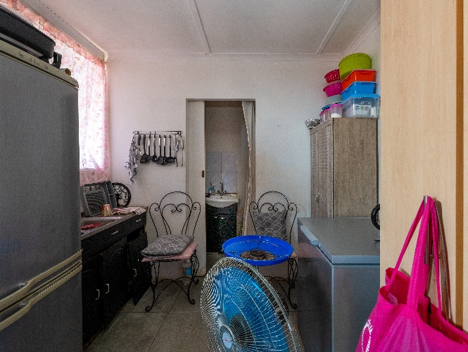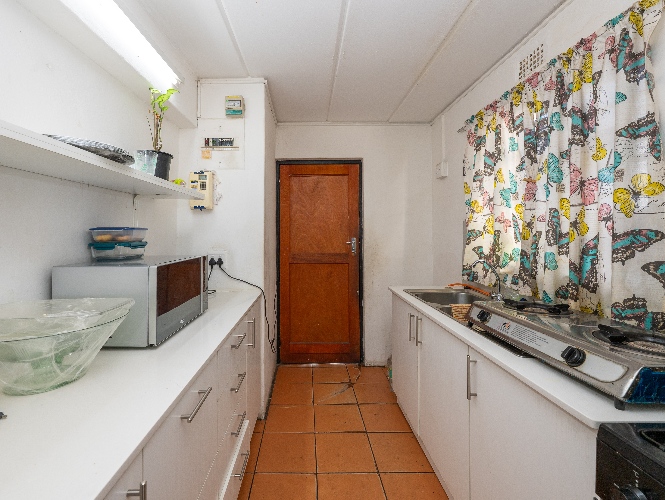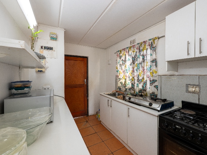 The main home offers four well-sized bedrooms in total. Downstairs, you’ll find 2 tiled bedrooms leading through to a neat kitchen with ample cupboard and counter space, free-standing stove, and direct access to the backyard with washing lines and an outside braai area, ideal for family gatherings.
