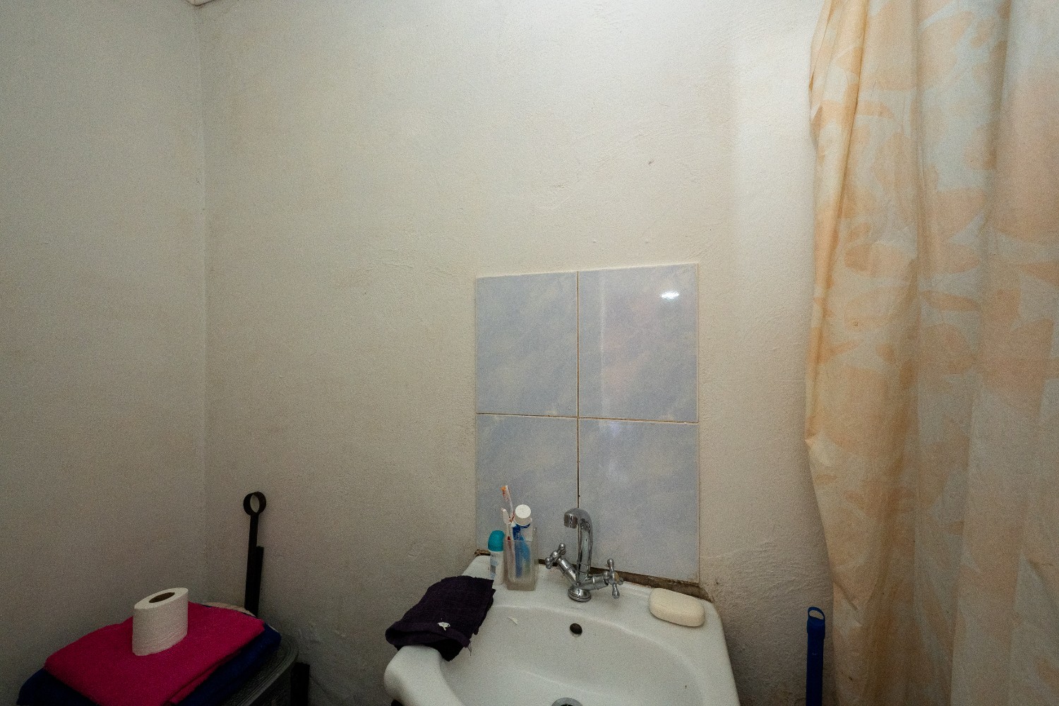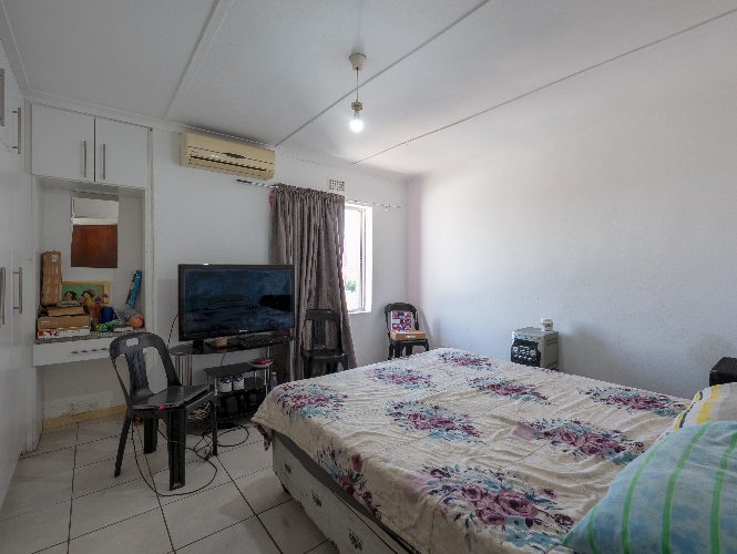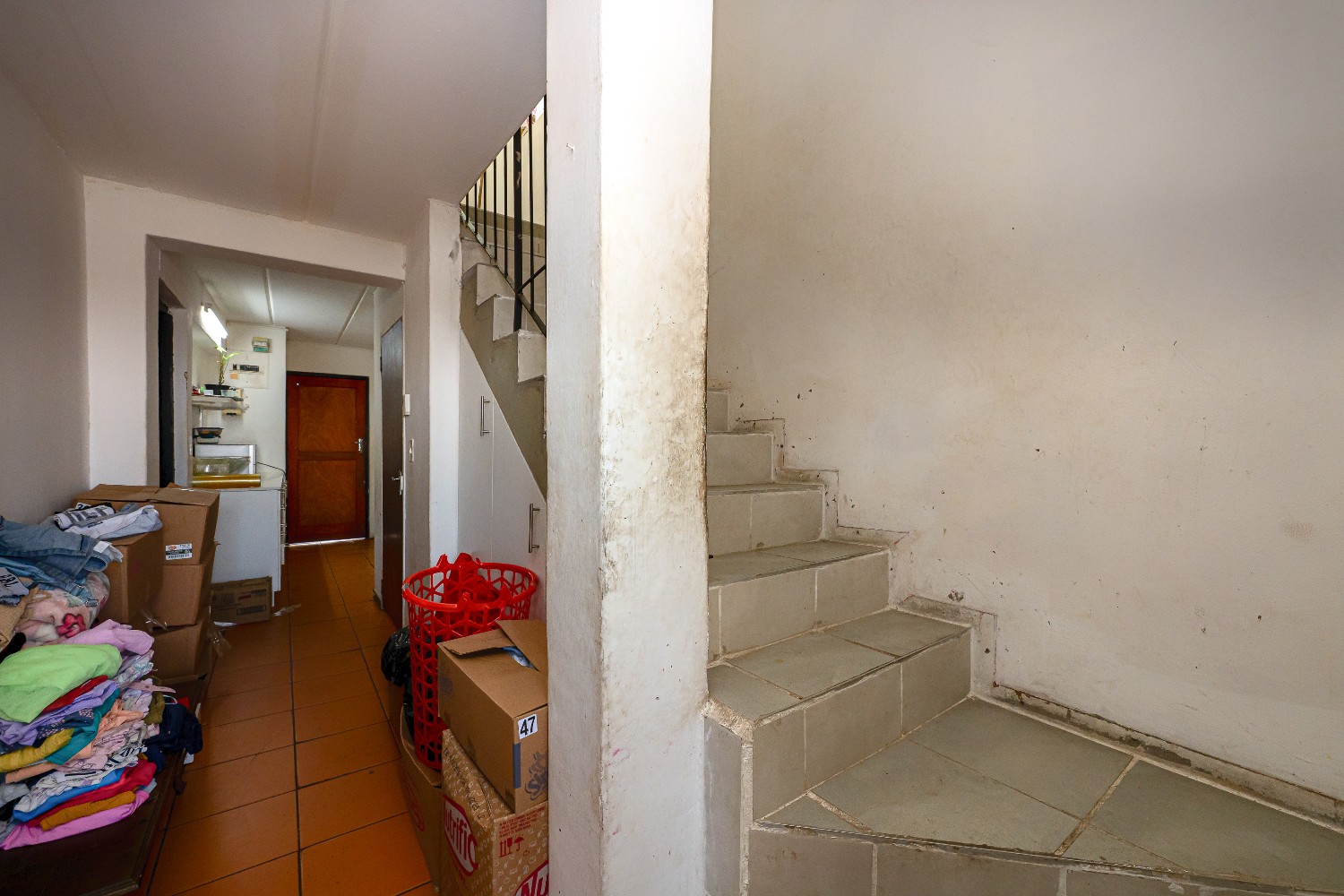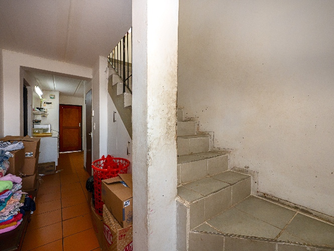 Upstairs features 2 additional bedrooms, including the main bedroom, both fully tiled and fitted with built-in cupboards. A family bathroom with shower, toilet, and basin completes the upper level.