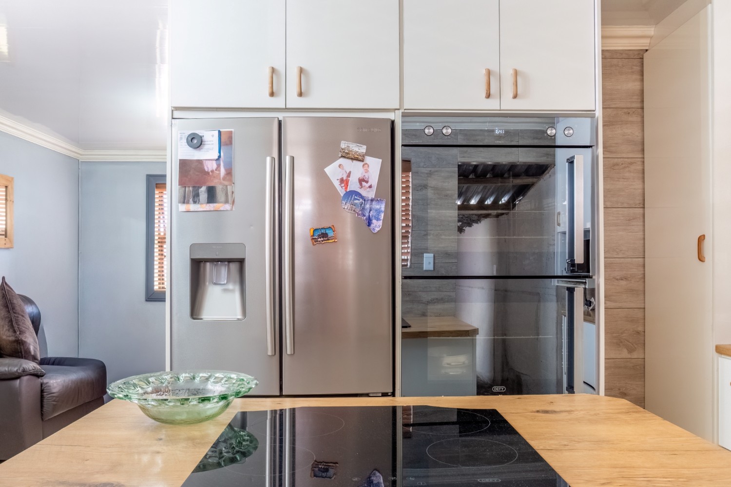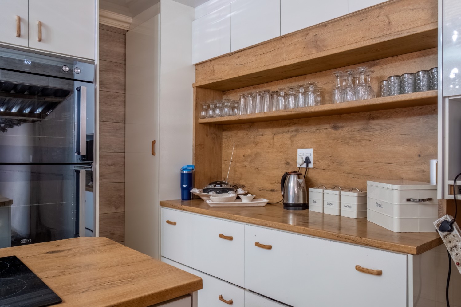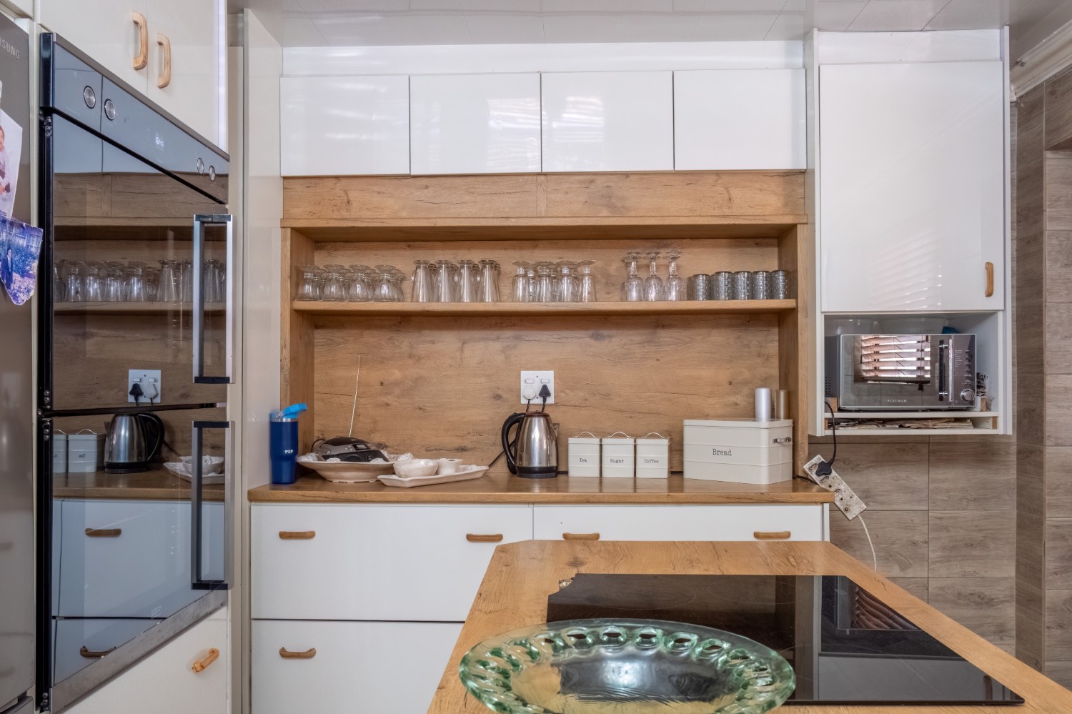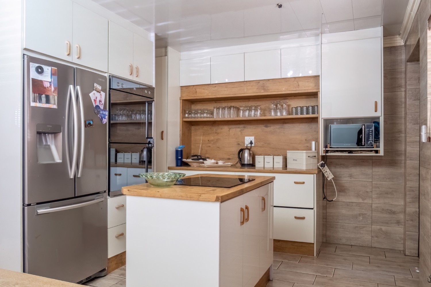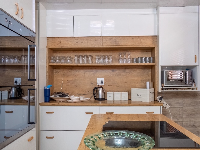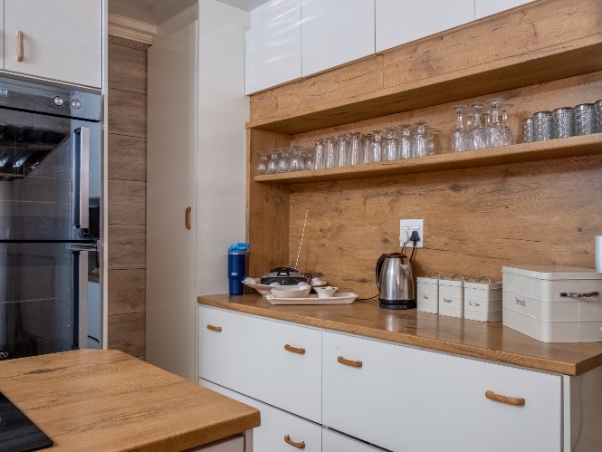 The spacious open-plan kitchen offers built-in cupboards and ample room for all your essentials.