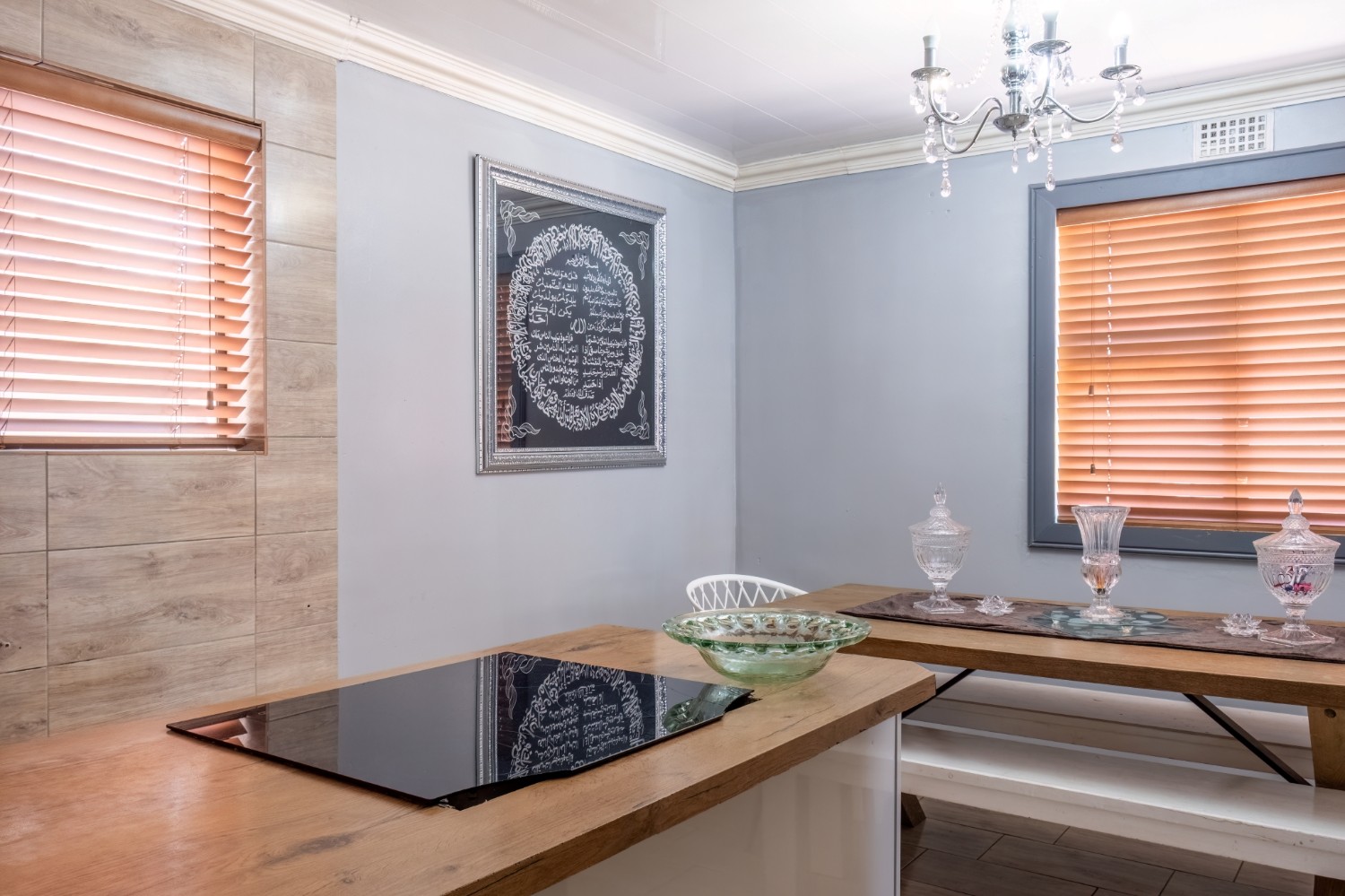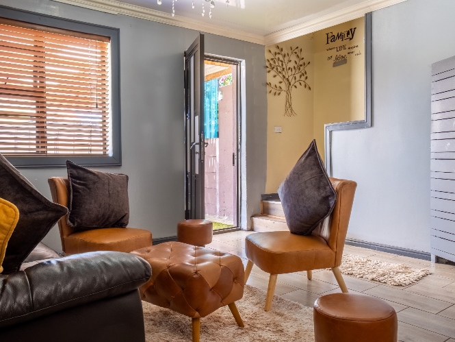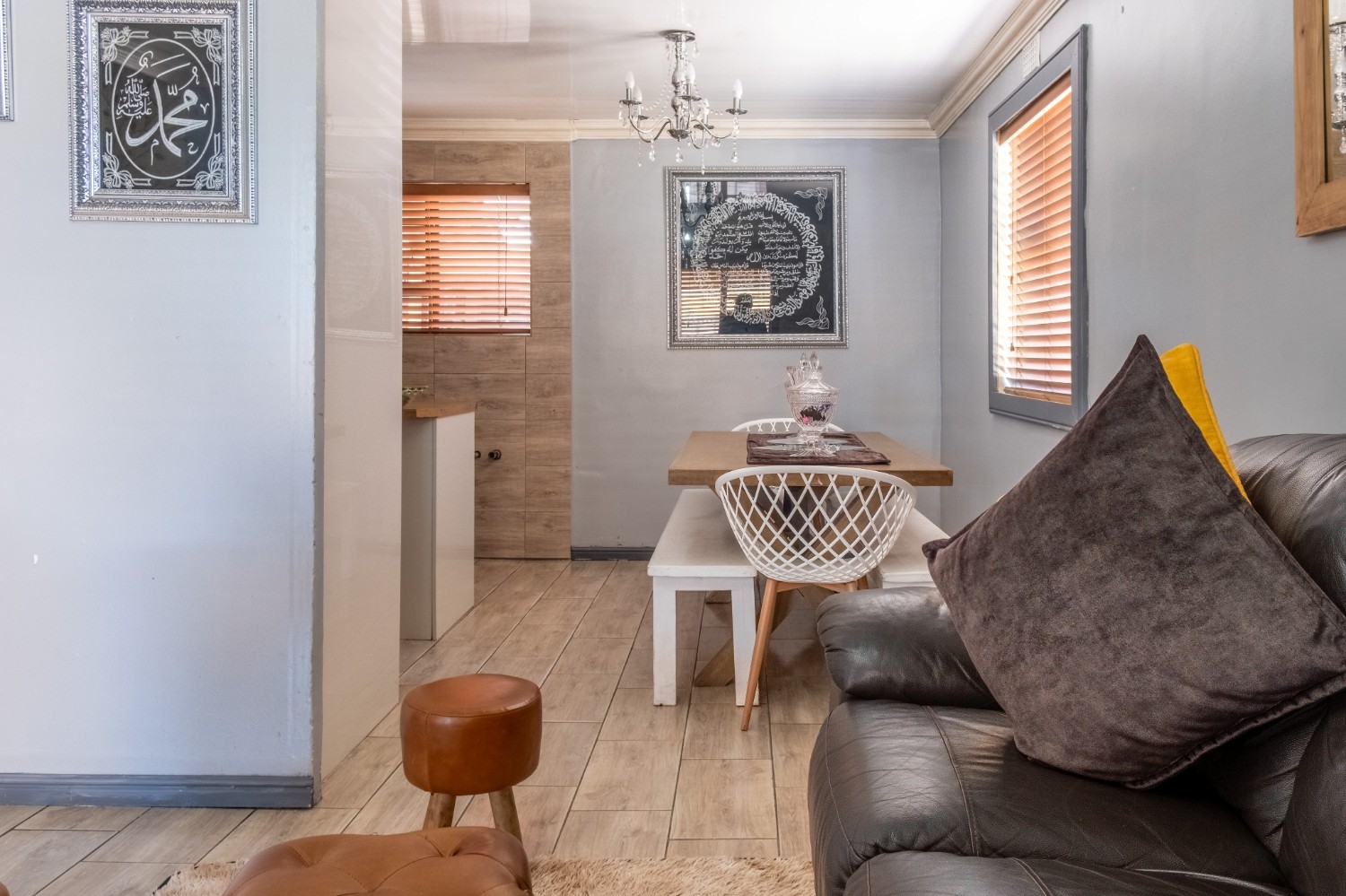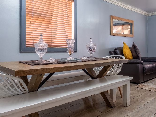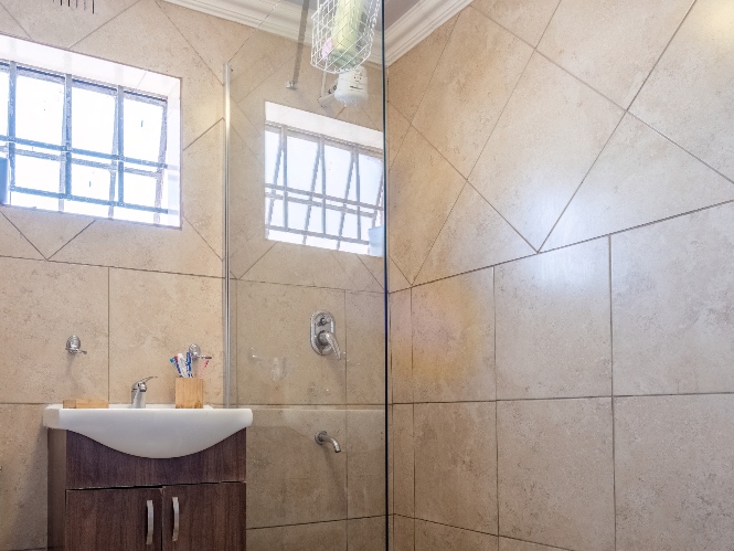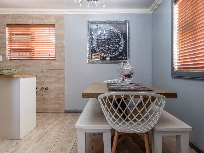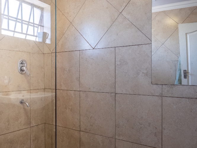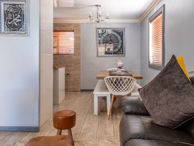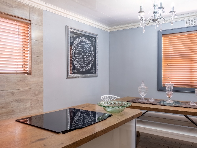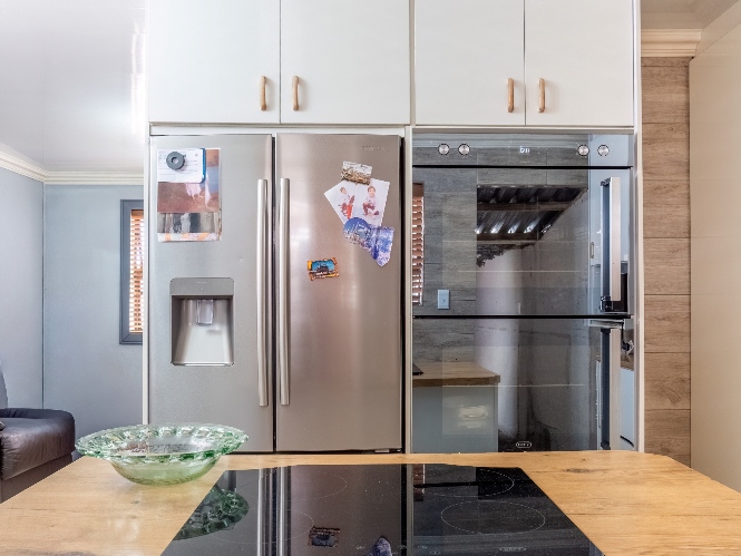 The spacious open-plan kitchen offers built-in cupboards and ample room for all your essentials.