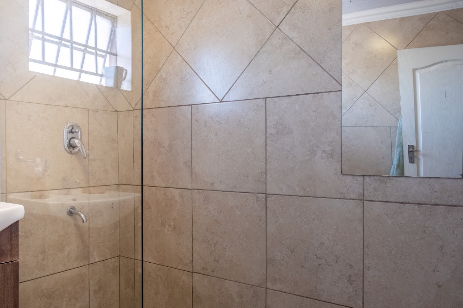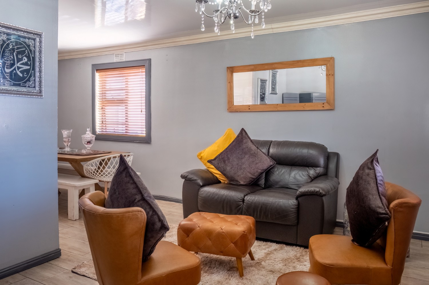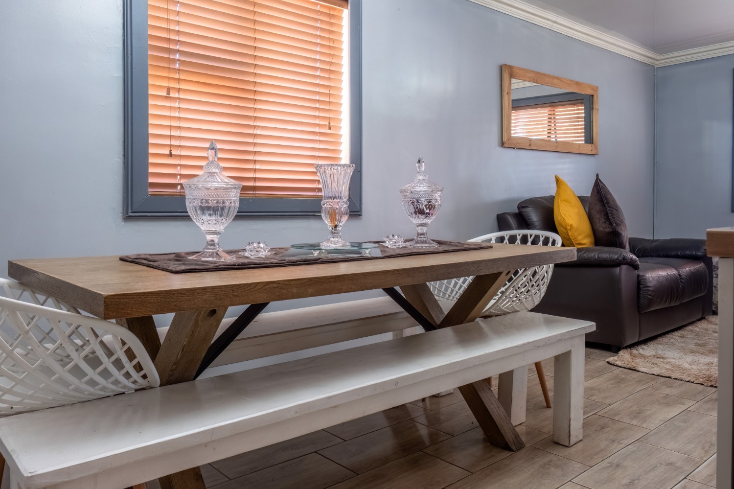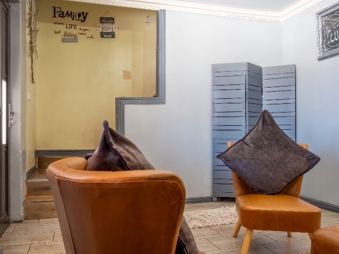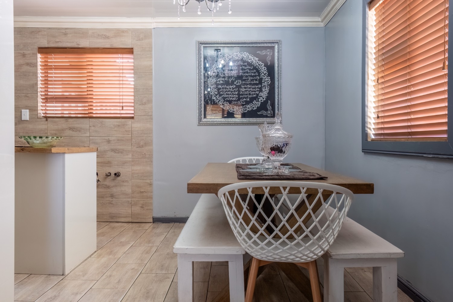 The spacious open-plan kitchen offers built-in cupboards and ample room for all your essentials.
