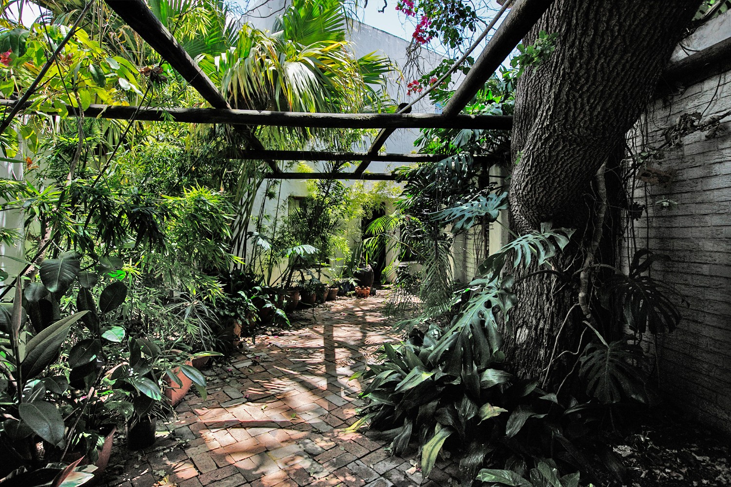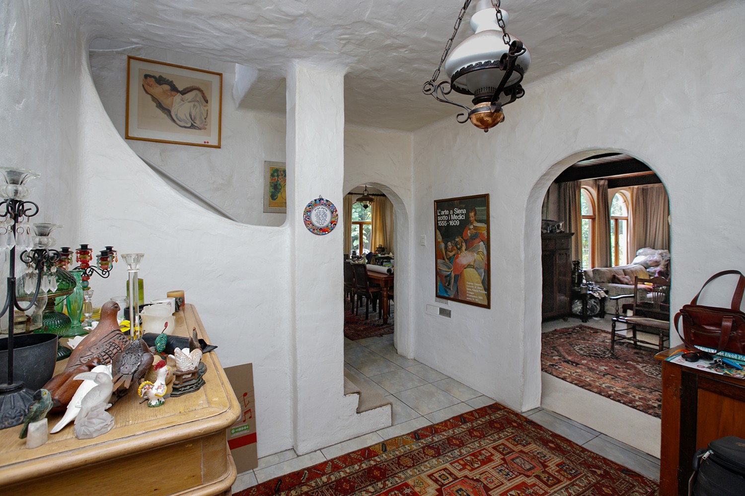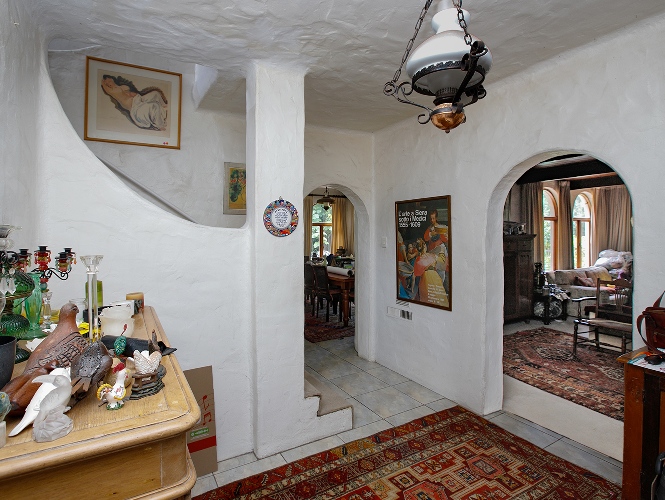 An arched entrance leads into a charming, enclosed courtyard shaded by a mature oak tree and pergola, setting a welcoming tone from the outset. The entrance hall provides direct access to two garages, a storeroom, and a guest cloakroom.
