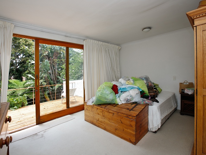 Upstairs, three bright bedrooms and a study are positioned to capture north-eastern and north-western light throughout the day. The main suite features a dressing area, en-suite bathroom, and a private patio, while the second bedroom opens onto its own deck. Both outdoor spaces enjoy elevated views over the garden, river, and surrounding mountain landscape.
