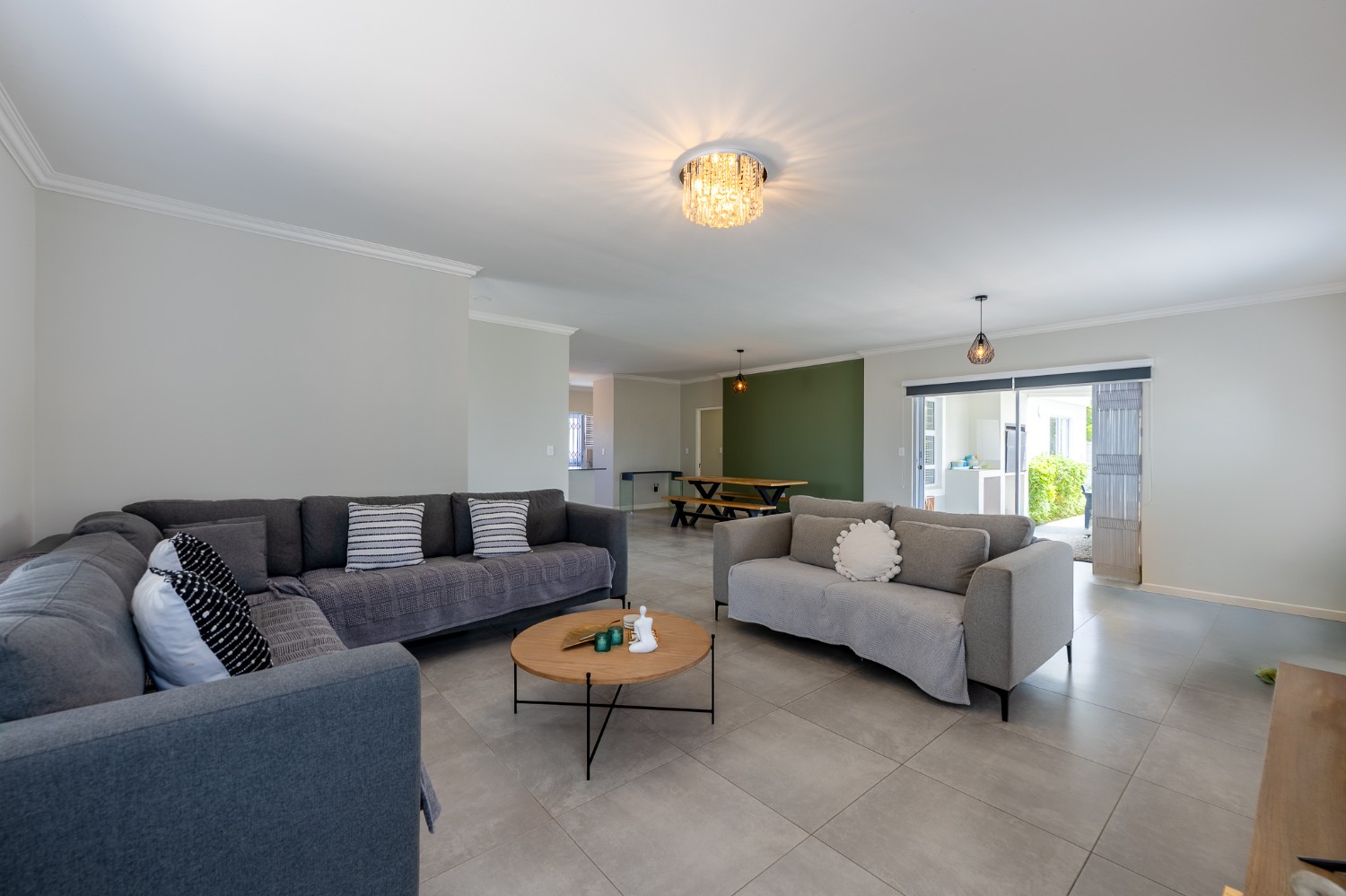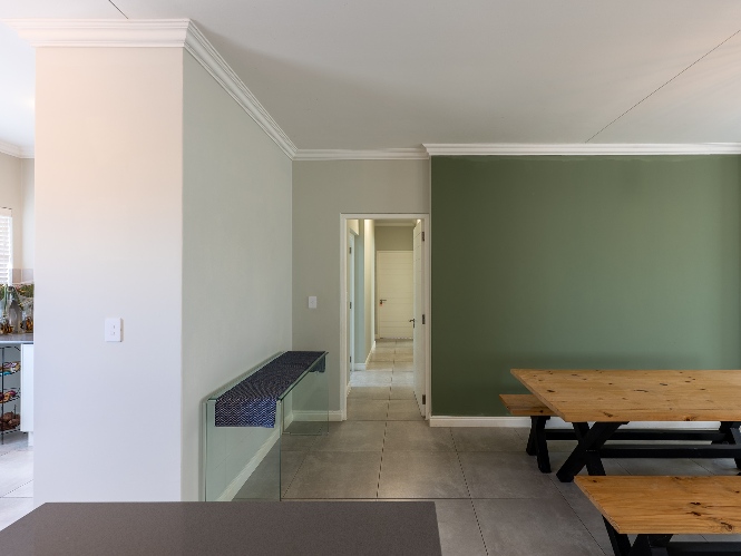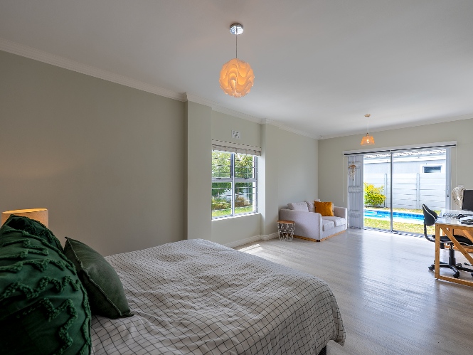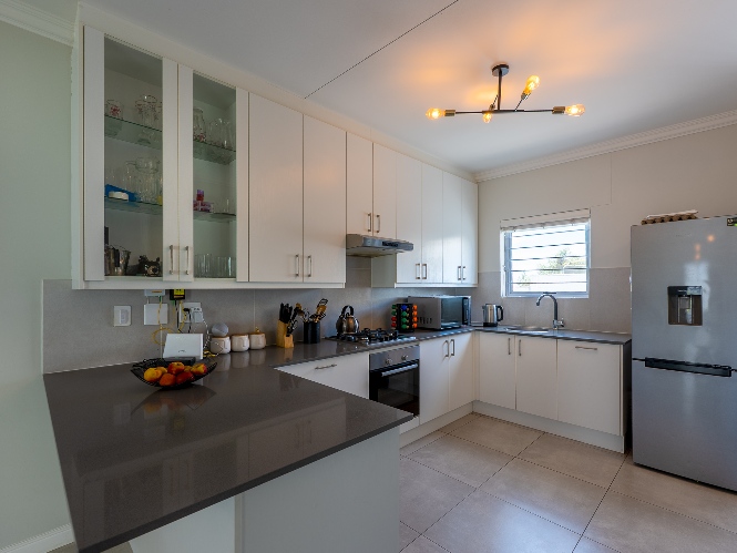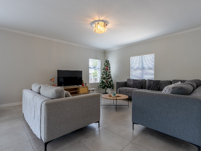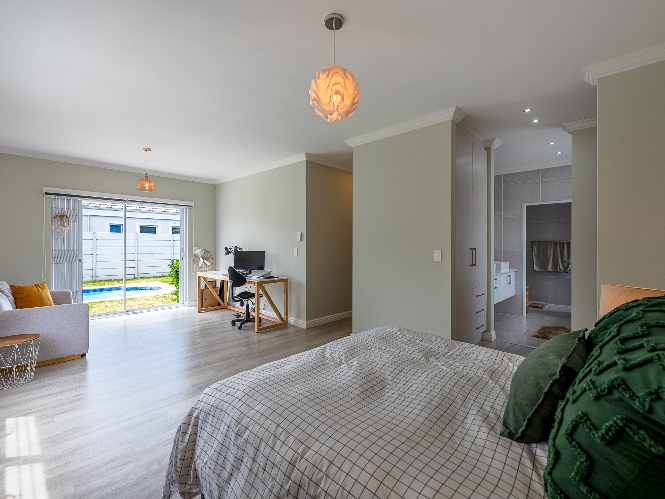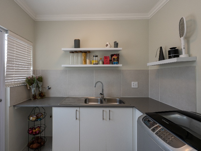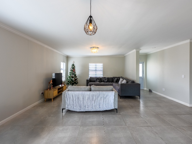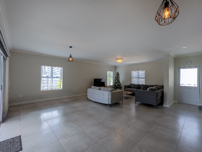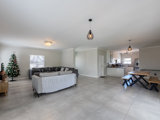 The home features a spacious open-plan living and dining area that flows seamlessly into a contemporary kitchen complete with Caesarstone countertops, a gas hob, and a separate scullery with 2 appliance points.