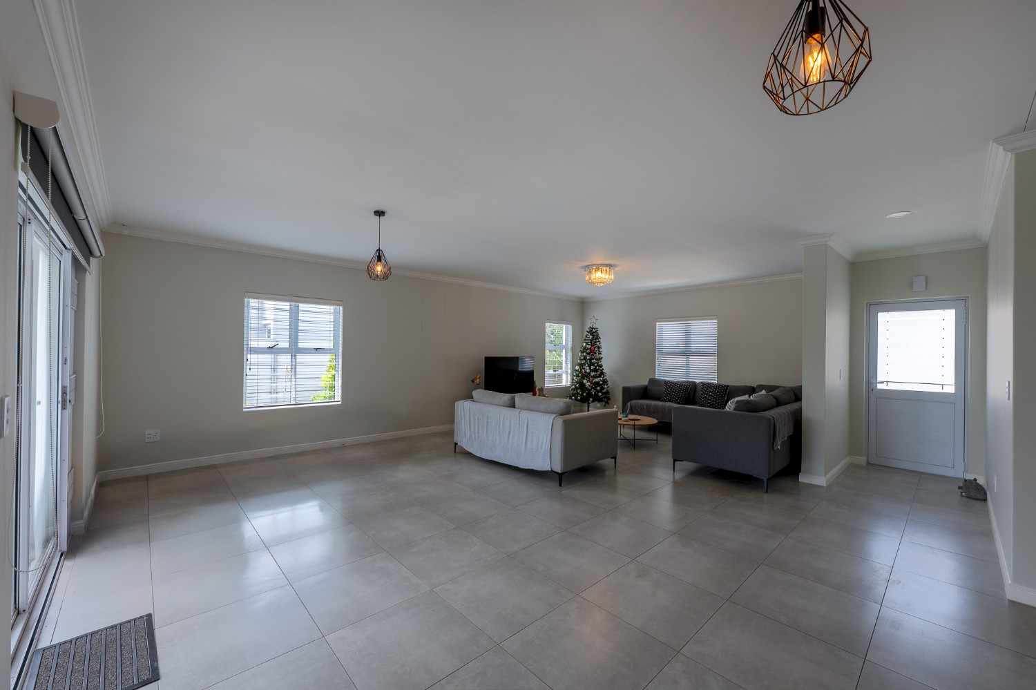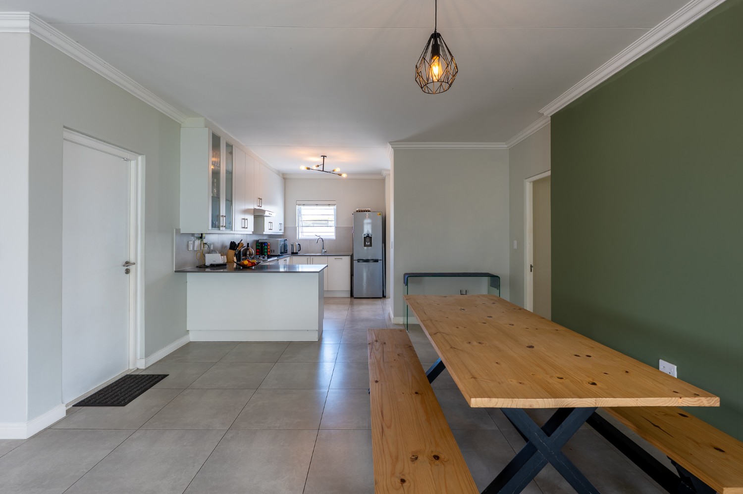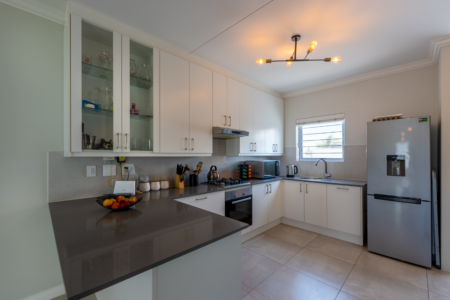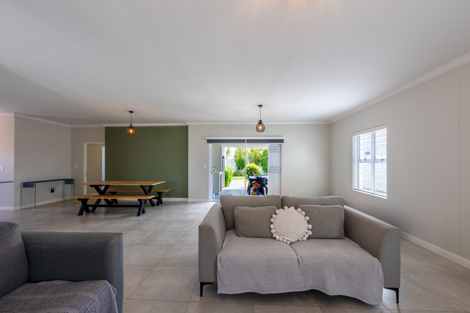 The home features a spacious open-plan living and dining area that flows seamlessly into a contemporary kitchen complete with Caesarstone countertops, a gas hob, and a separate scullery with 2 appliance points.
