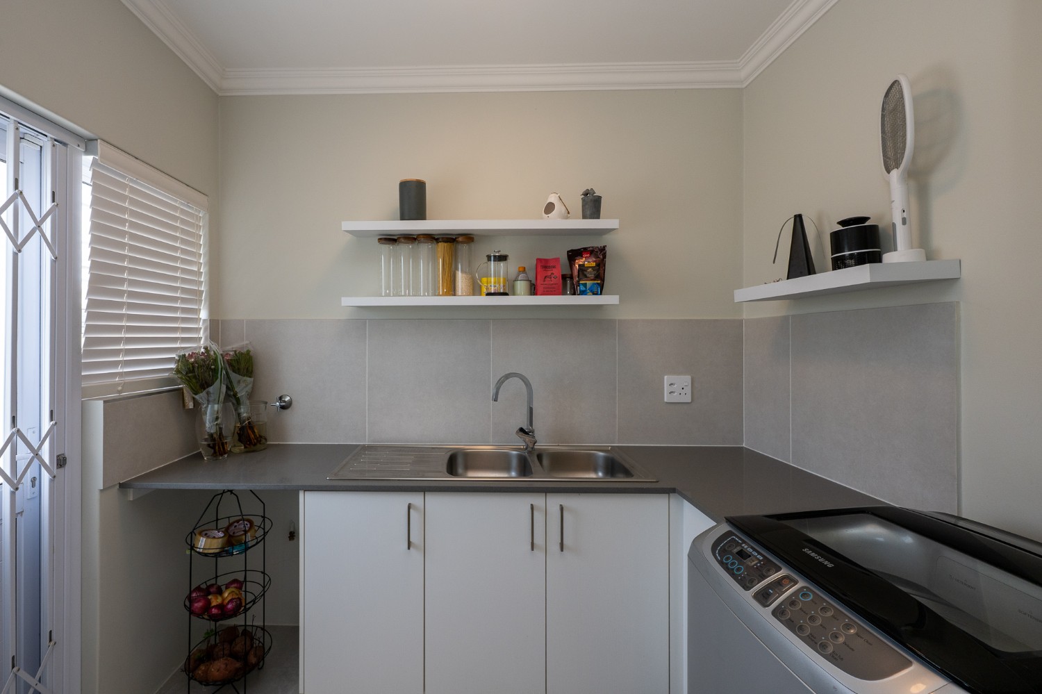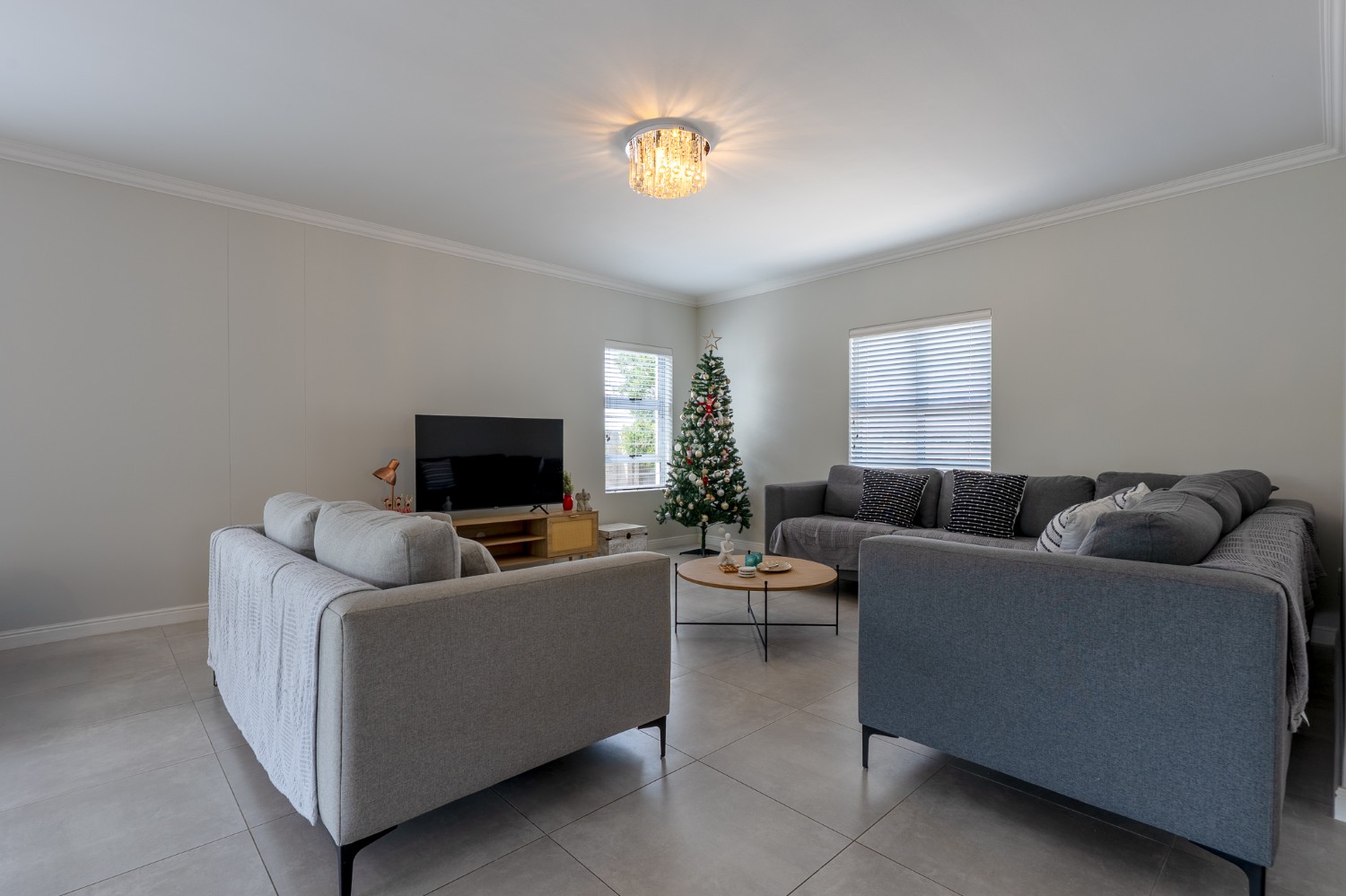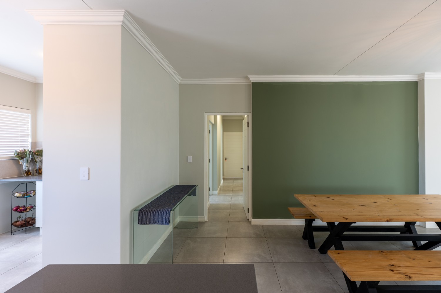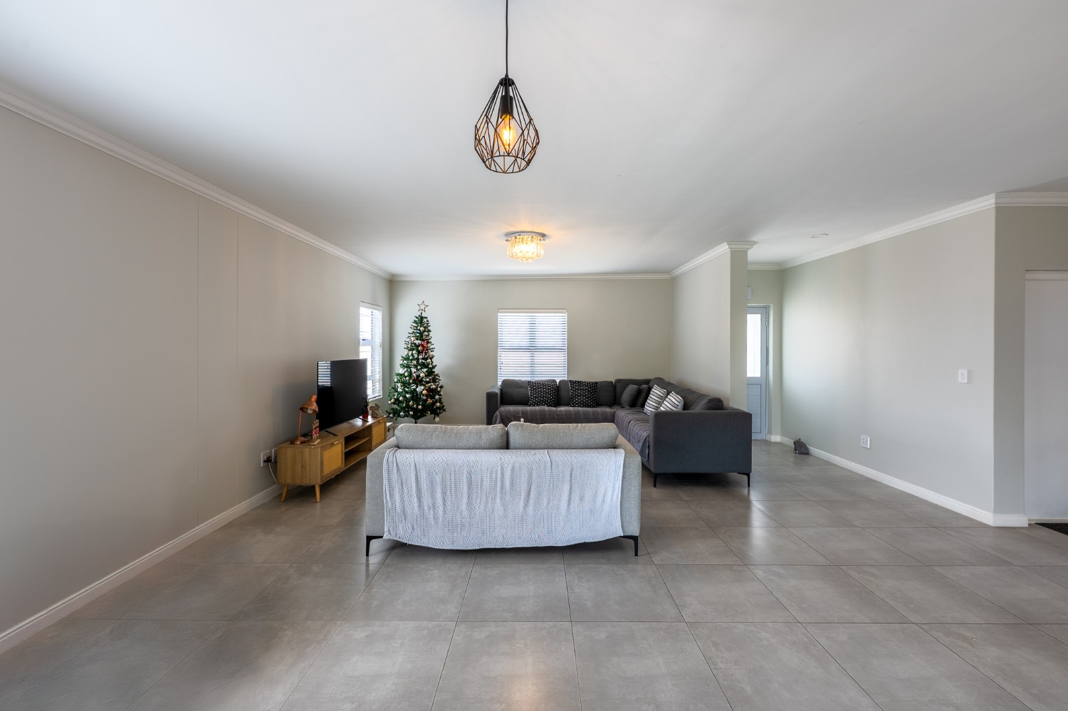 The home features a spacious open-plan living and dining area that flows seamlessly into a contemporary kitchen complete with Caesarstone countertops, a gas hob, and a separate scullery with 2 appliance points.