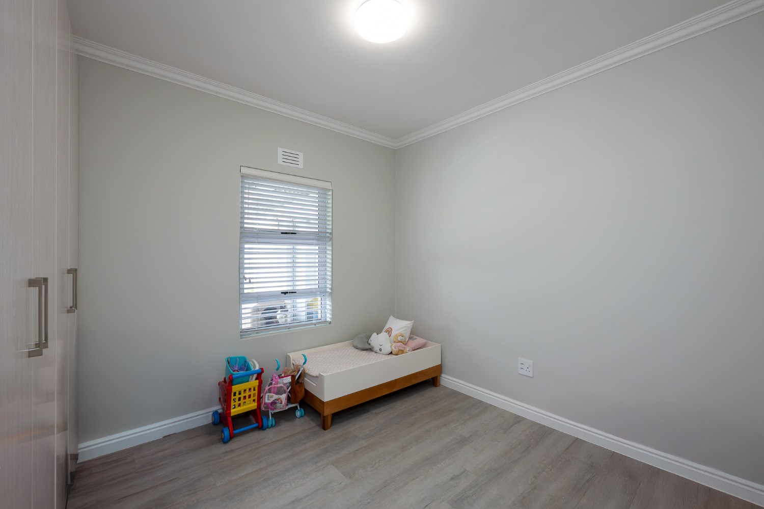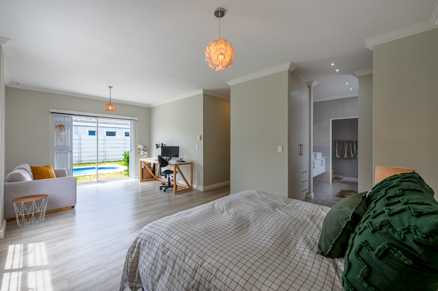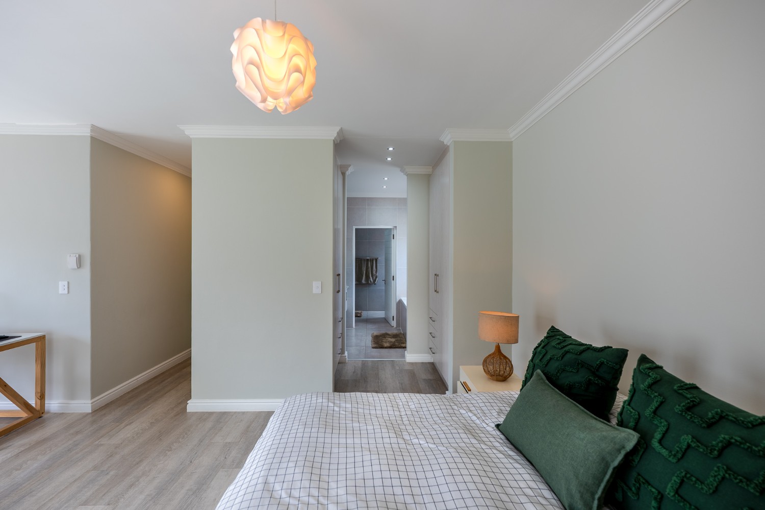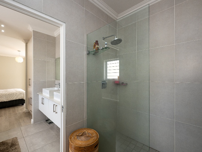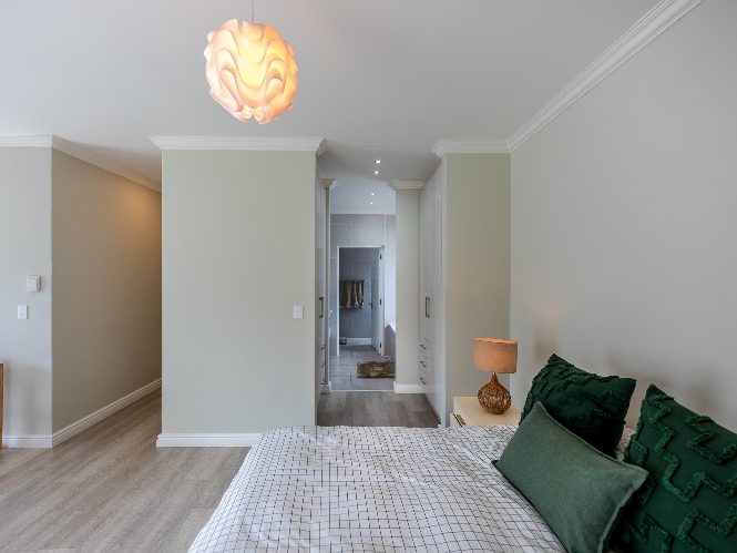 Inside, you’ll find 3 well-sized bedrooms (with a particularly large main), all fitted with built-in cupboards and vinyl flooring, and 2 full bathrooms, including a modern main-ensuite.