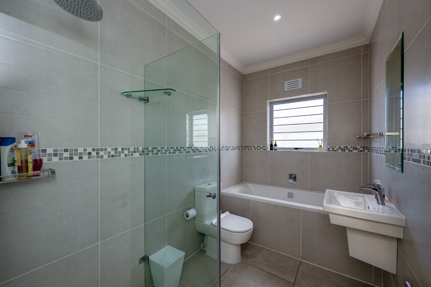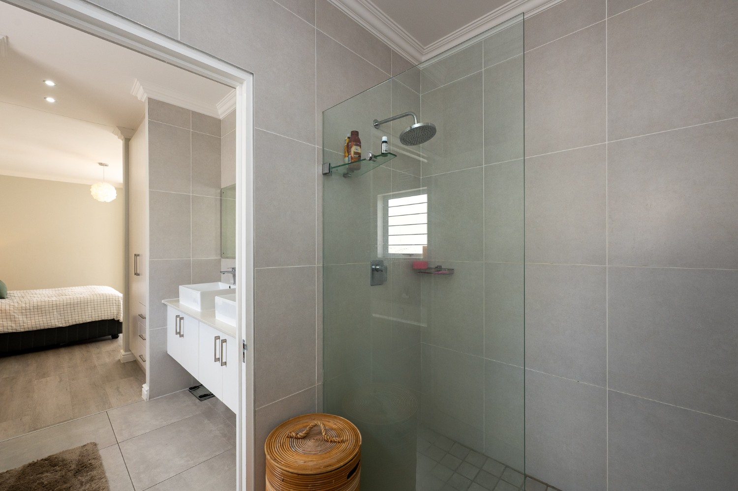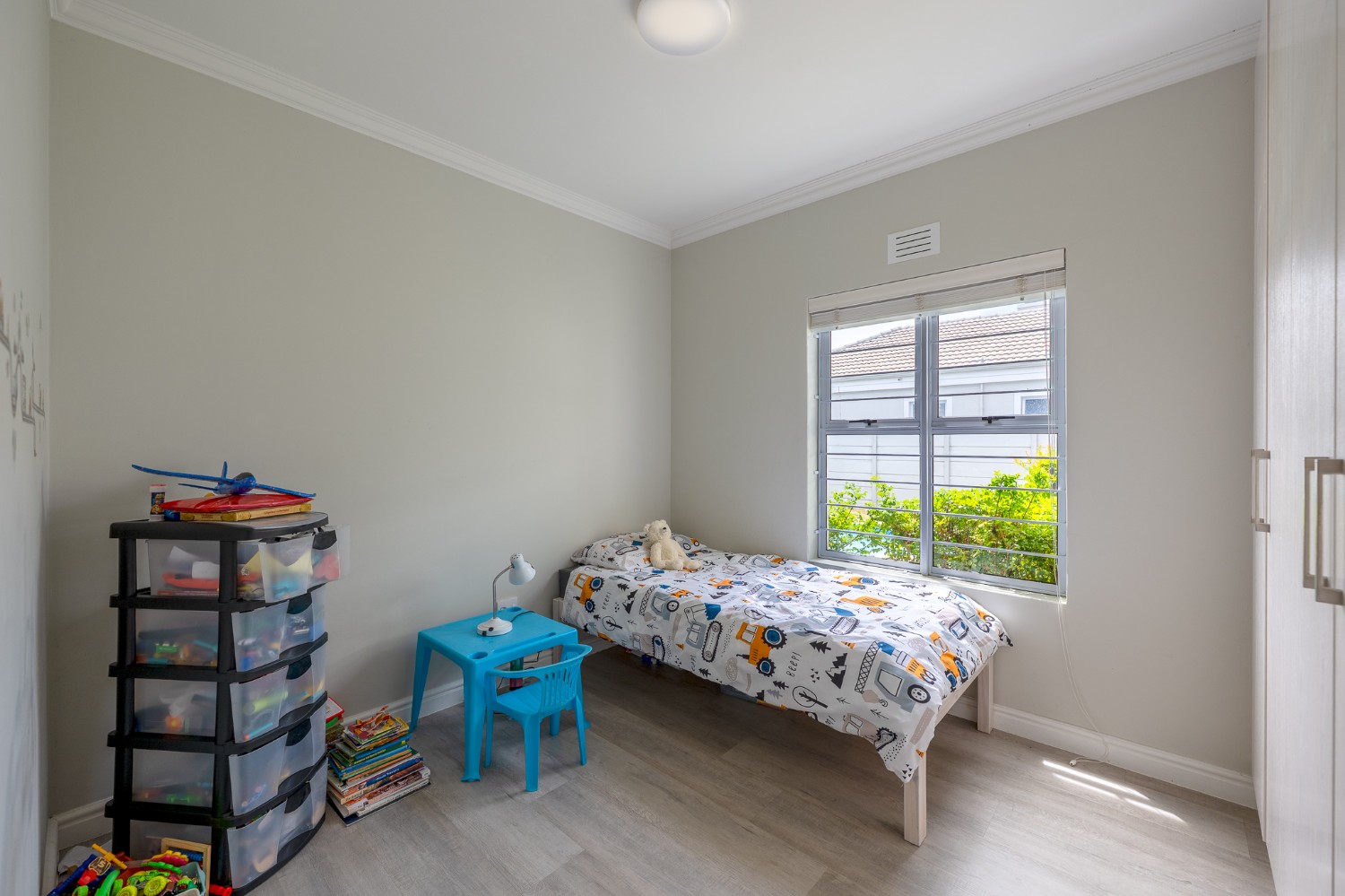 Inside, you’ll find 3 well-sized bedrooms (with a particularly large main), all fitted with built-in cupboards and vinyl flooring, and 2 full bathrooms, including a modern main-ensuite.