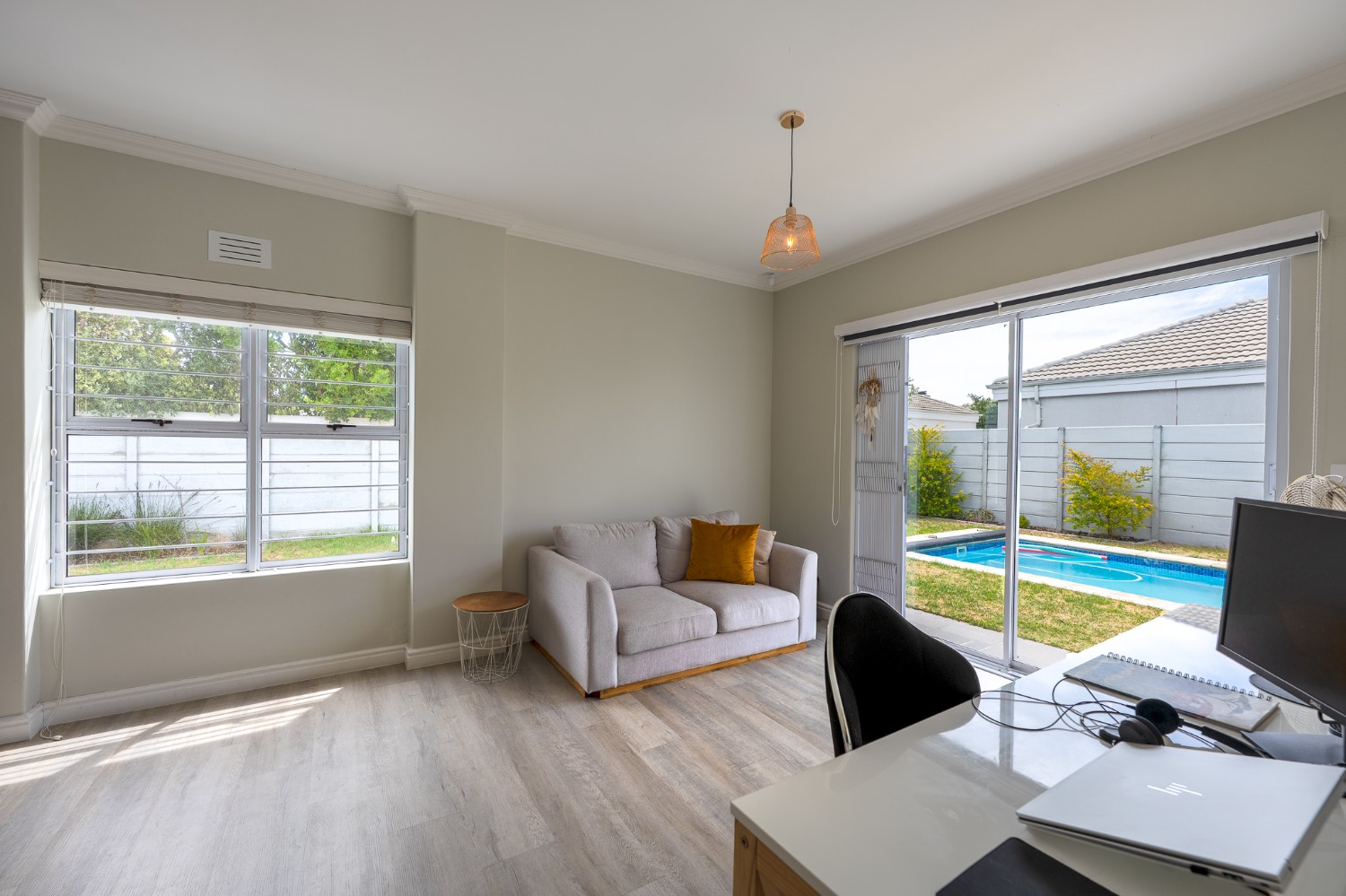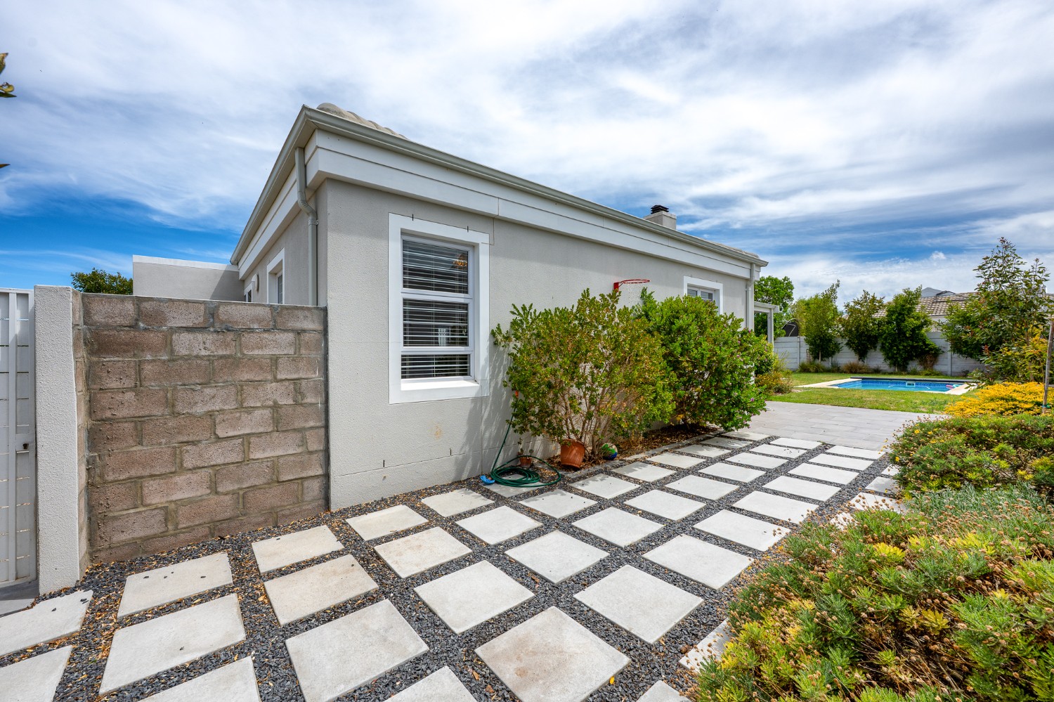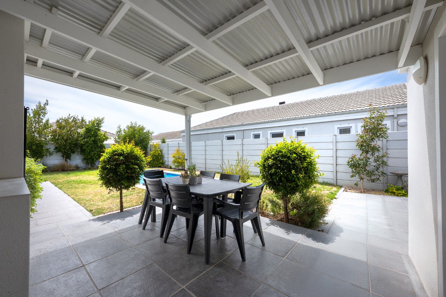 Step outside to a large, private, well-established garden with a sparkling pool, offering an inviting retreat for family and friends.