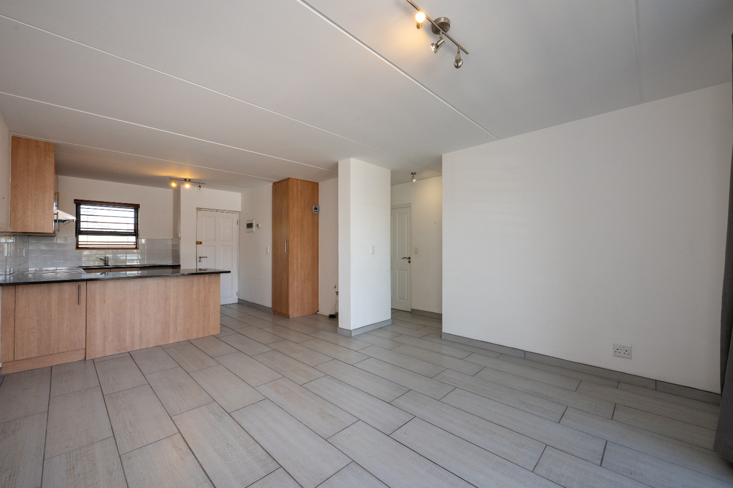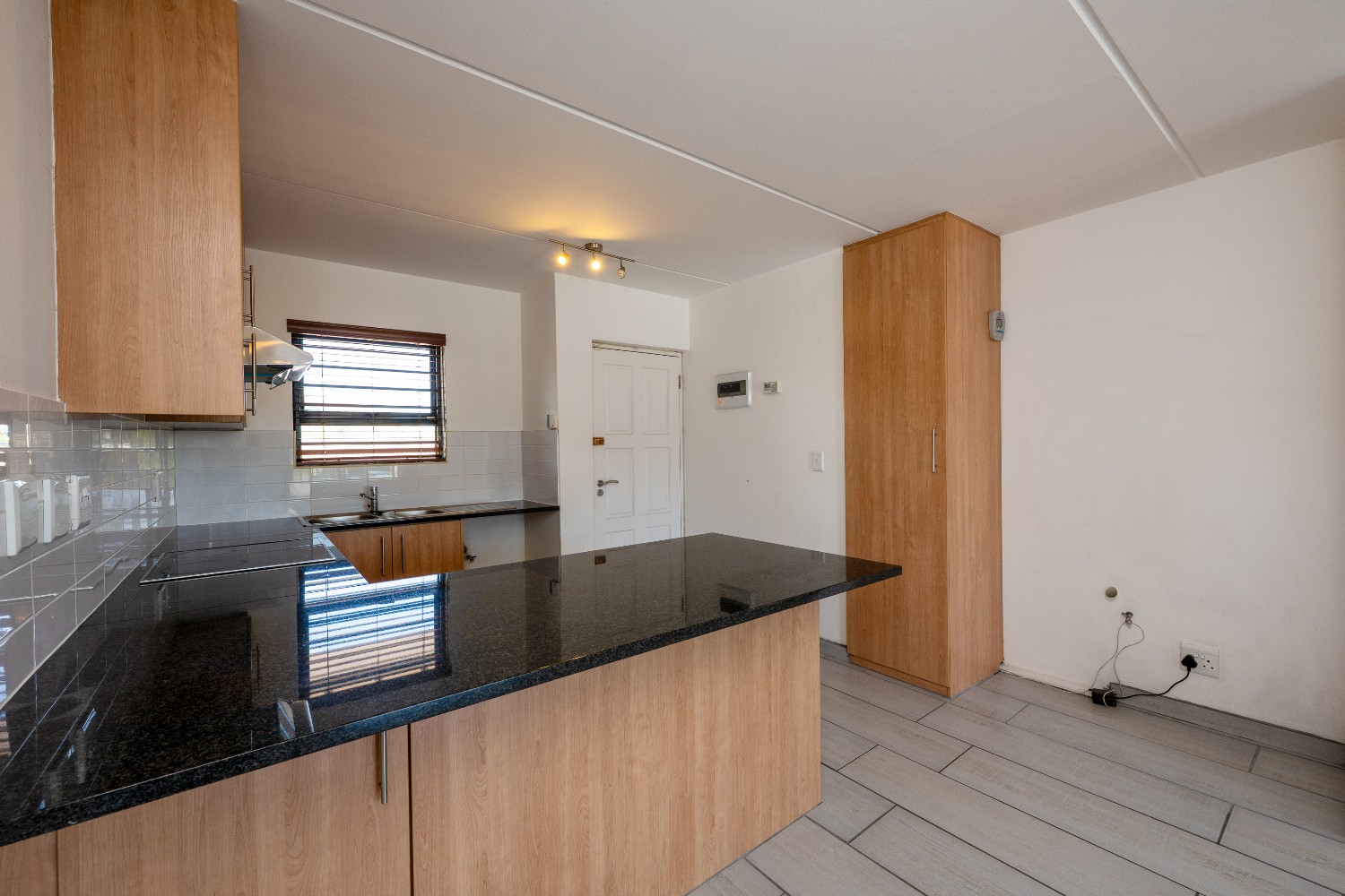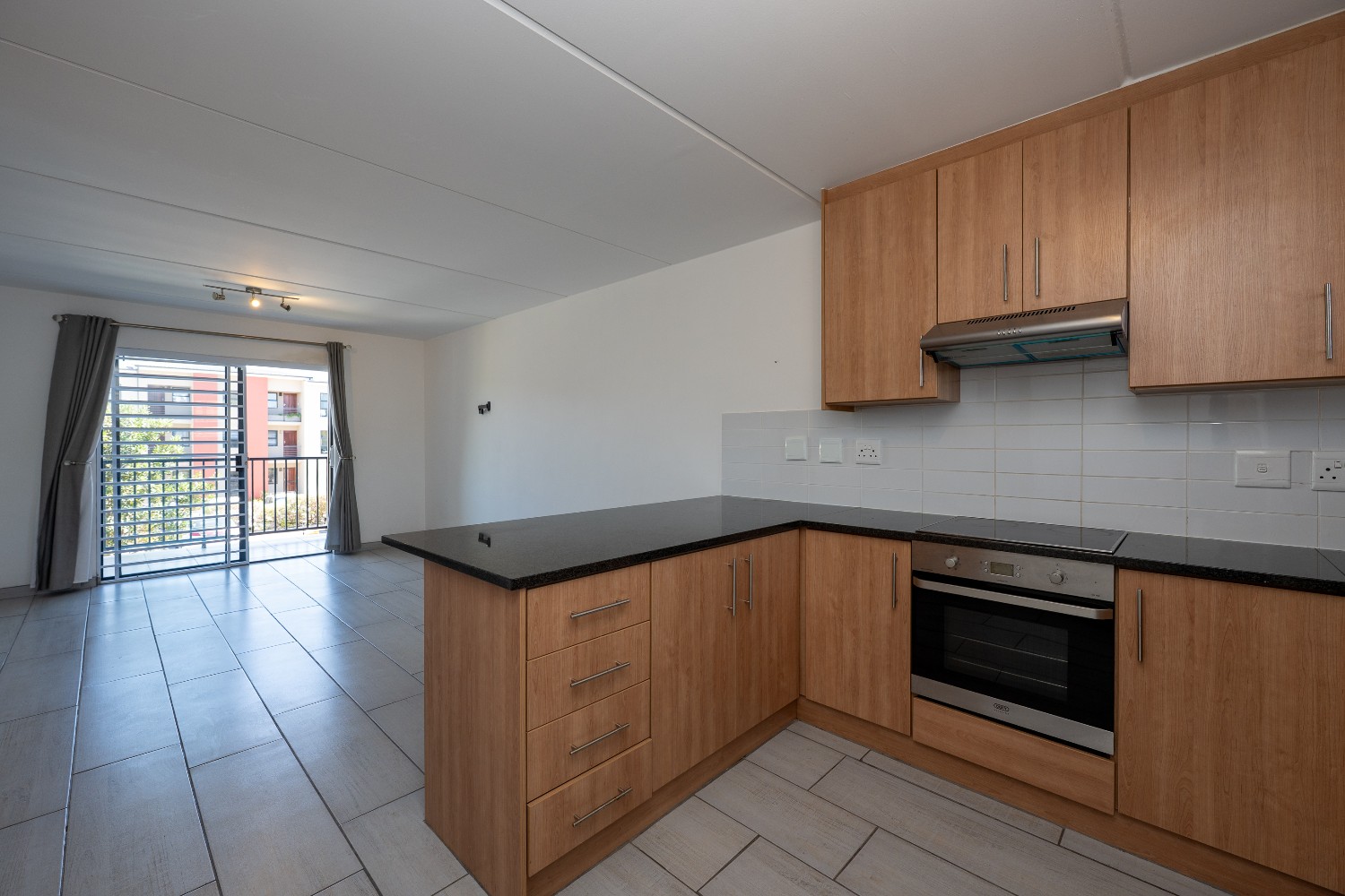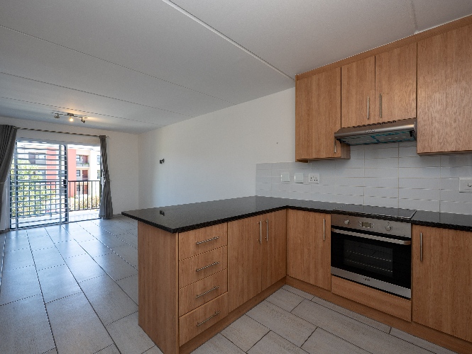 Upon entering the apartment, you are welcomed into a bright open-plan lounge and kitchen that creates a seamless and inviting living space. The lounge features stylish flooring and opens onto a private balcony, providing the perfect spot to relax and unwind. The kitchen is well-appointed with light wood cabinetry, granite countertops, an under-counter oven and hob, a double sink, and space for a fridge, making it both practical and visually appealing.