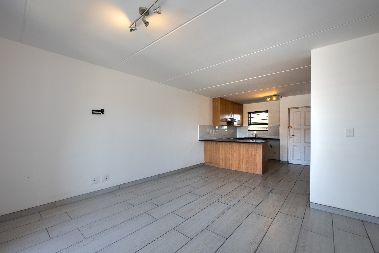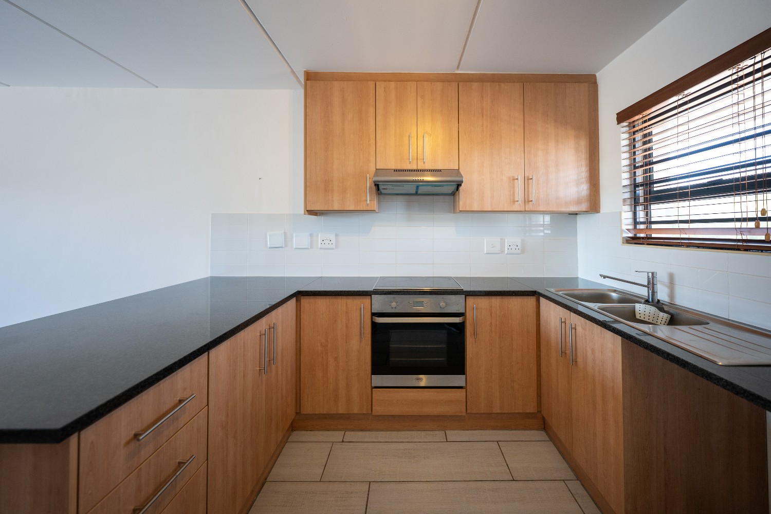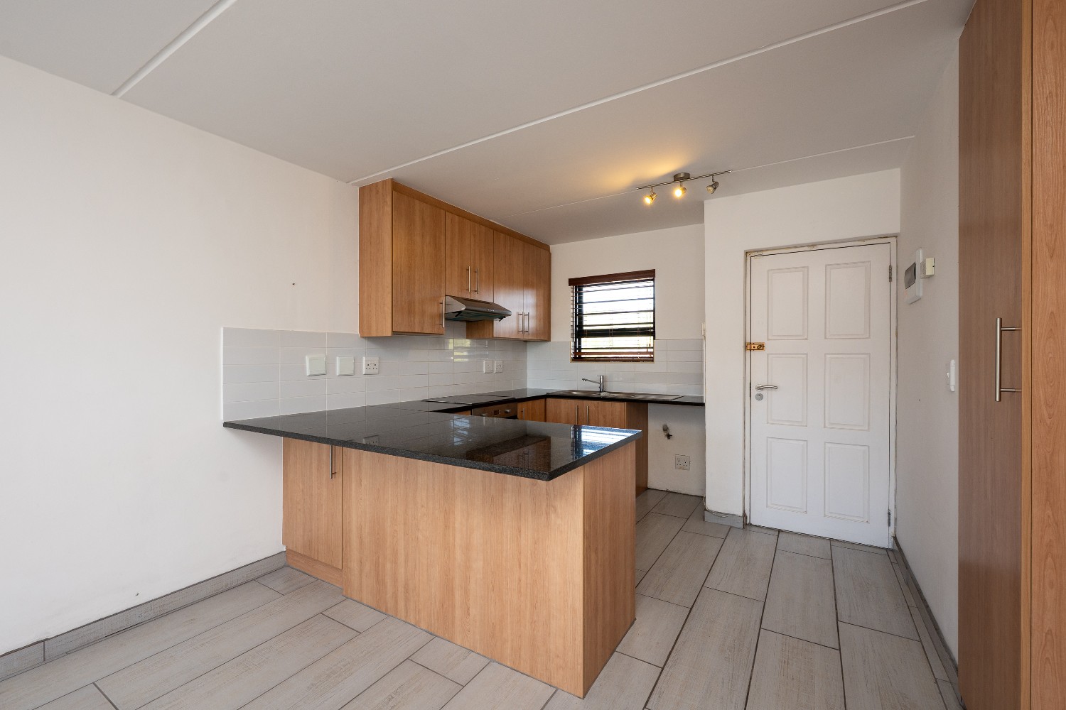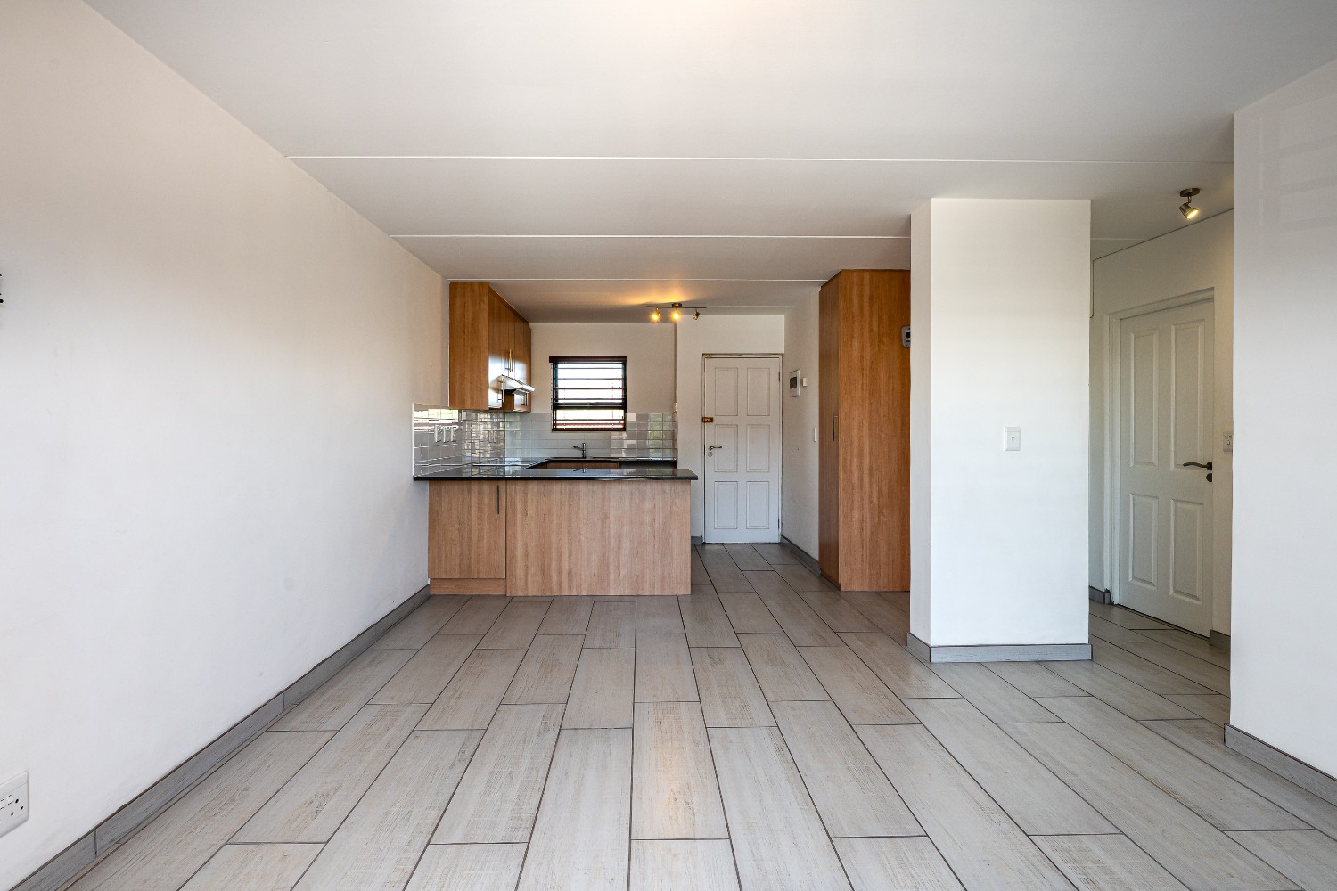 Upon entering the apartment, you are welcomed into a bright open-plan lounge and kitchen that creates a seamless and inviting living space. The lounge features stylish flooring and opens onto a private balcony, providing the perfect spot to relax and unwind. The kitchen is well-appointed with light wood cabinetry, granite countertops, an under-counter oven and hob, a double sink, and space for a fridge, making it both practical and visually appealing.