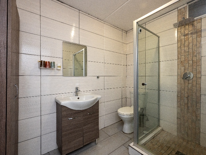 Both bedrooms are generously sized and fitted with built-in cupboards, offering ample storage. The modern family bathroom is neatly finished and includes a shower, basin, and toilet.