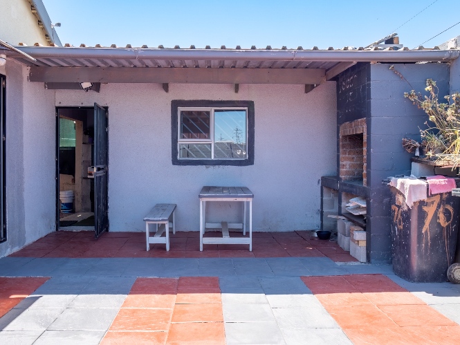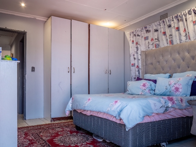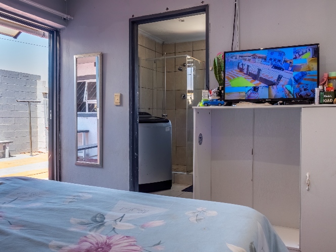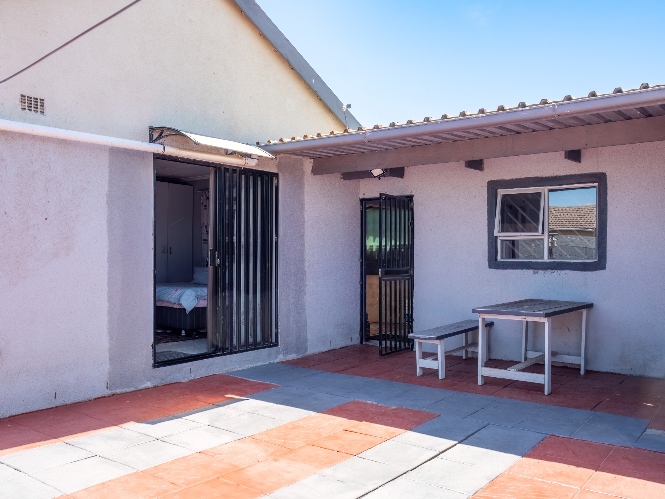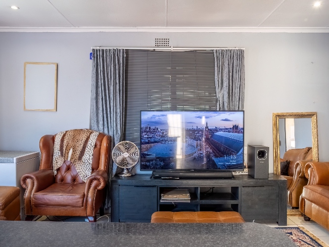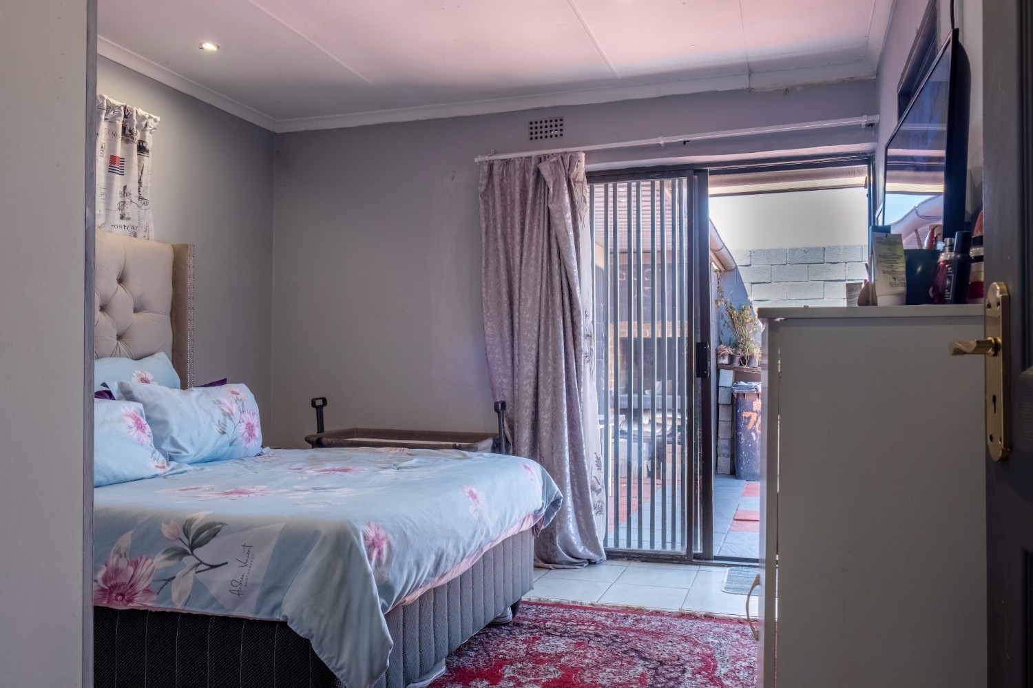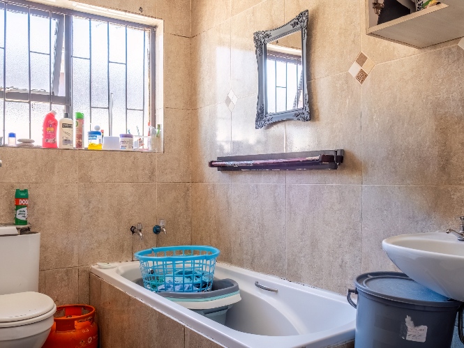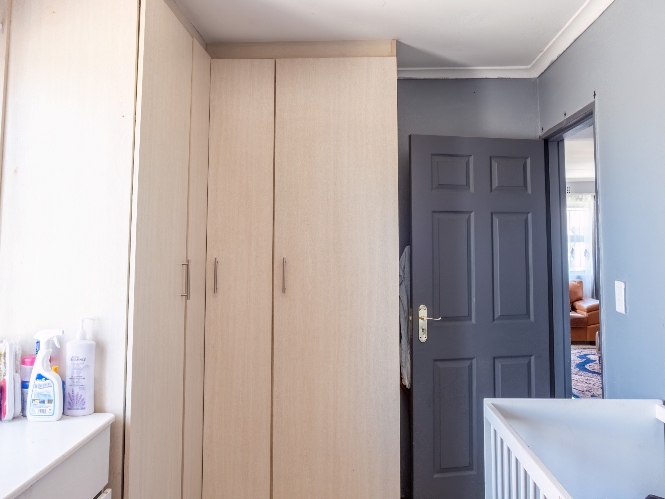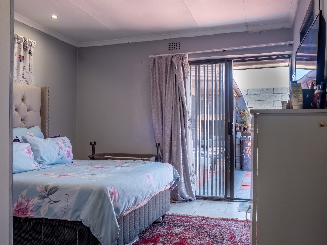 The home features three well-sized bedrooms with built-in cupboards, ideal for a growing family. The main bedroom is a standout, complete with a sliding door leading to the outdoor braai area as well as an en-suite bathroom. The main bathroom is neatly finished and fitted with a bathtub, basin, and toilet.