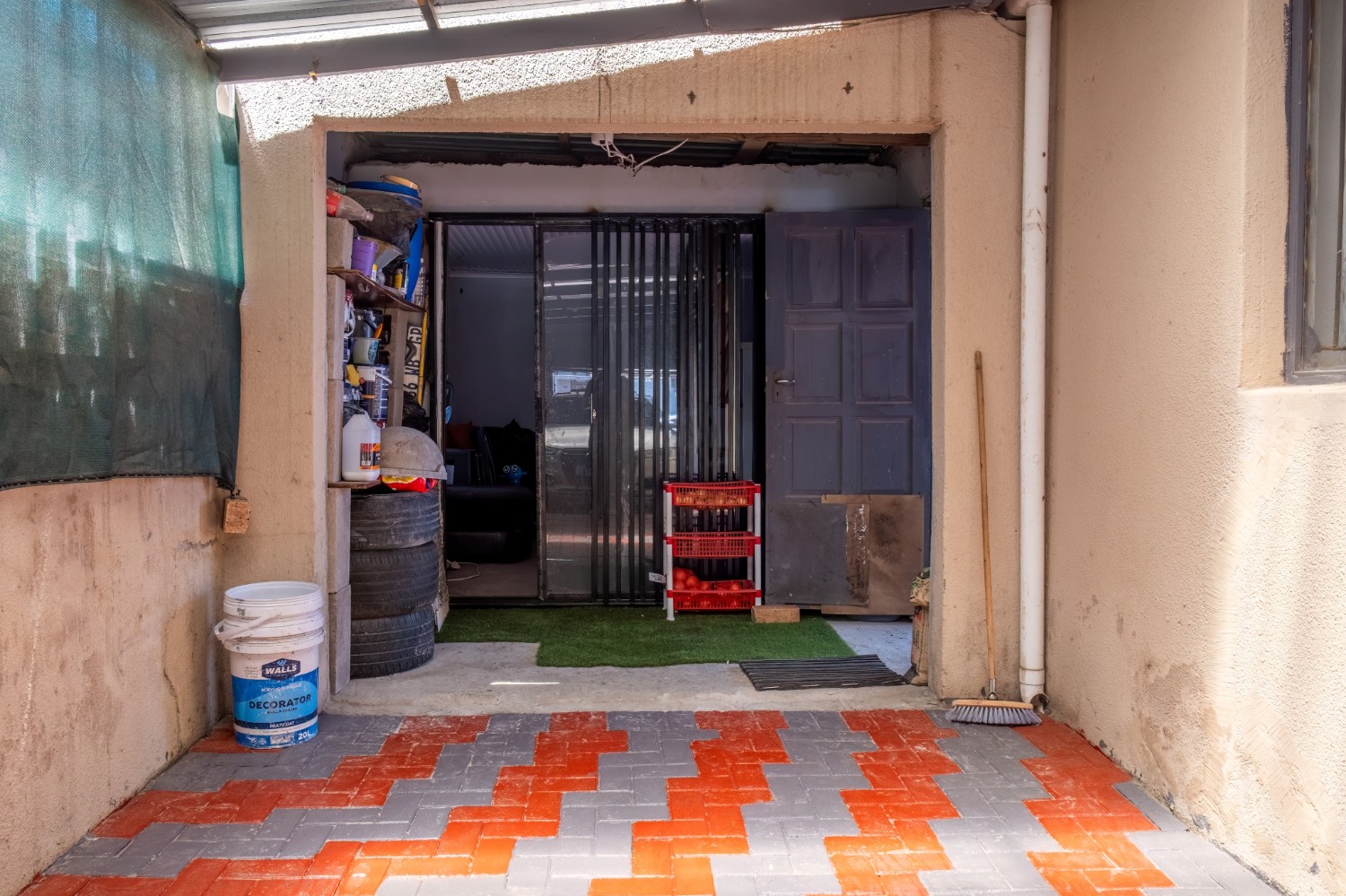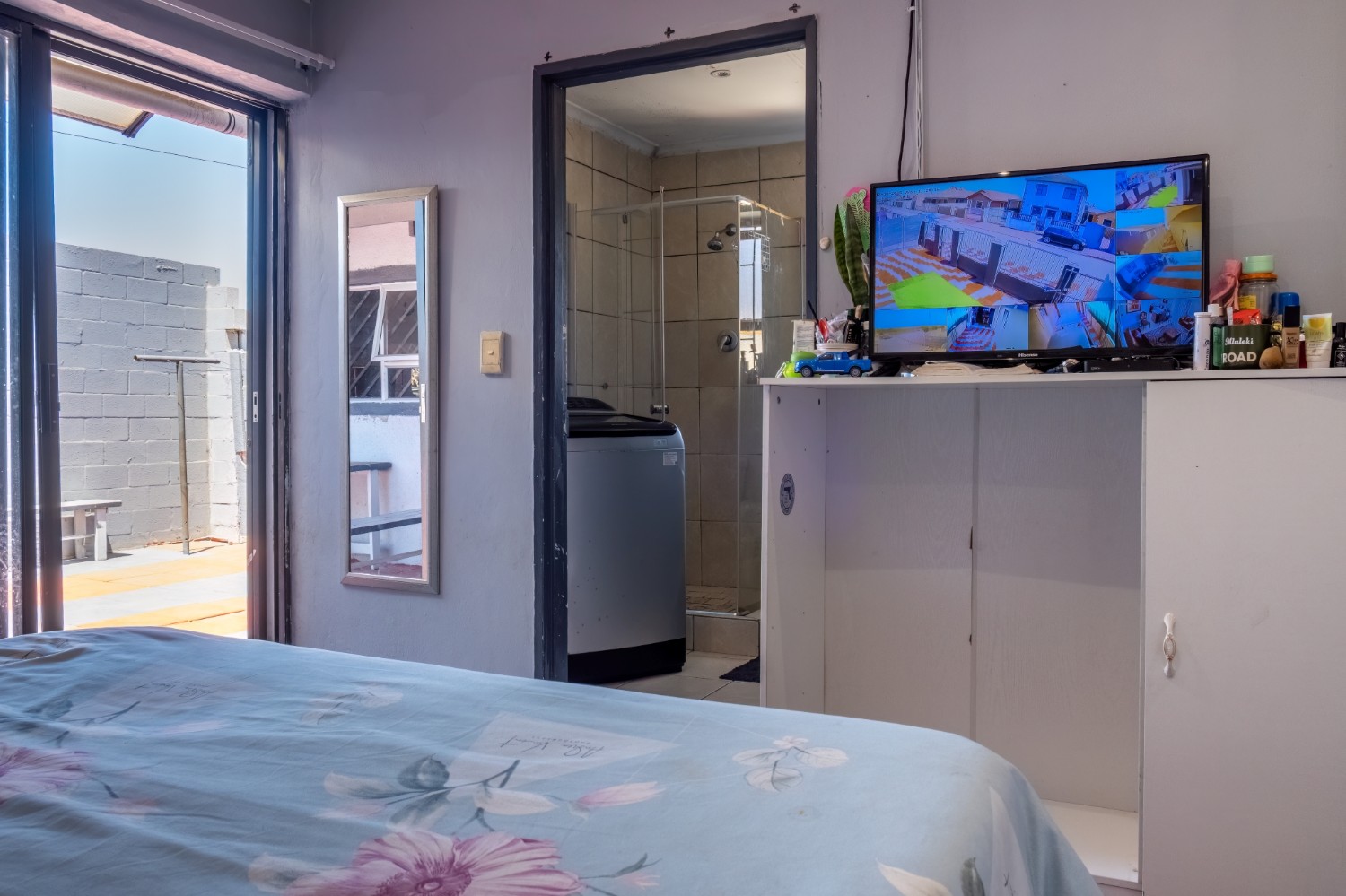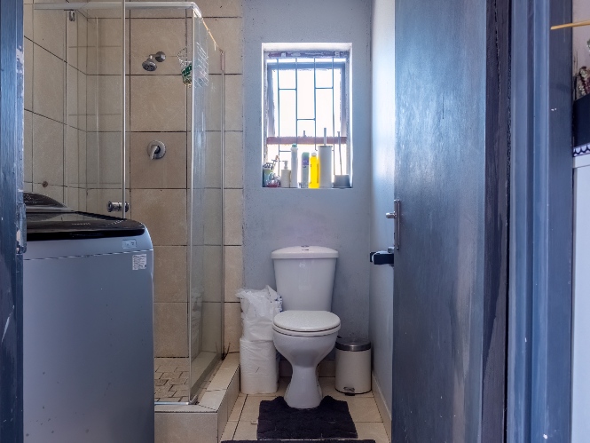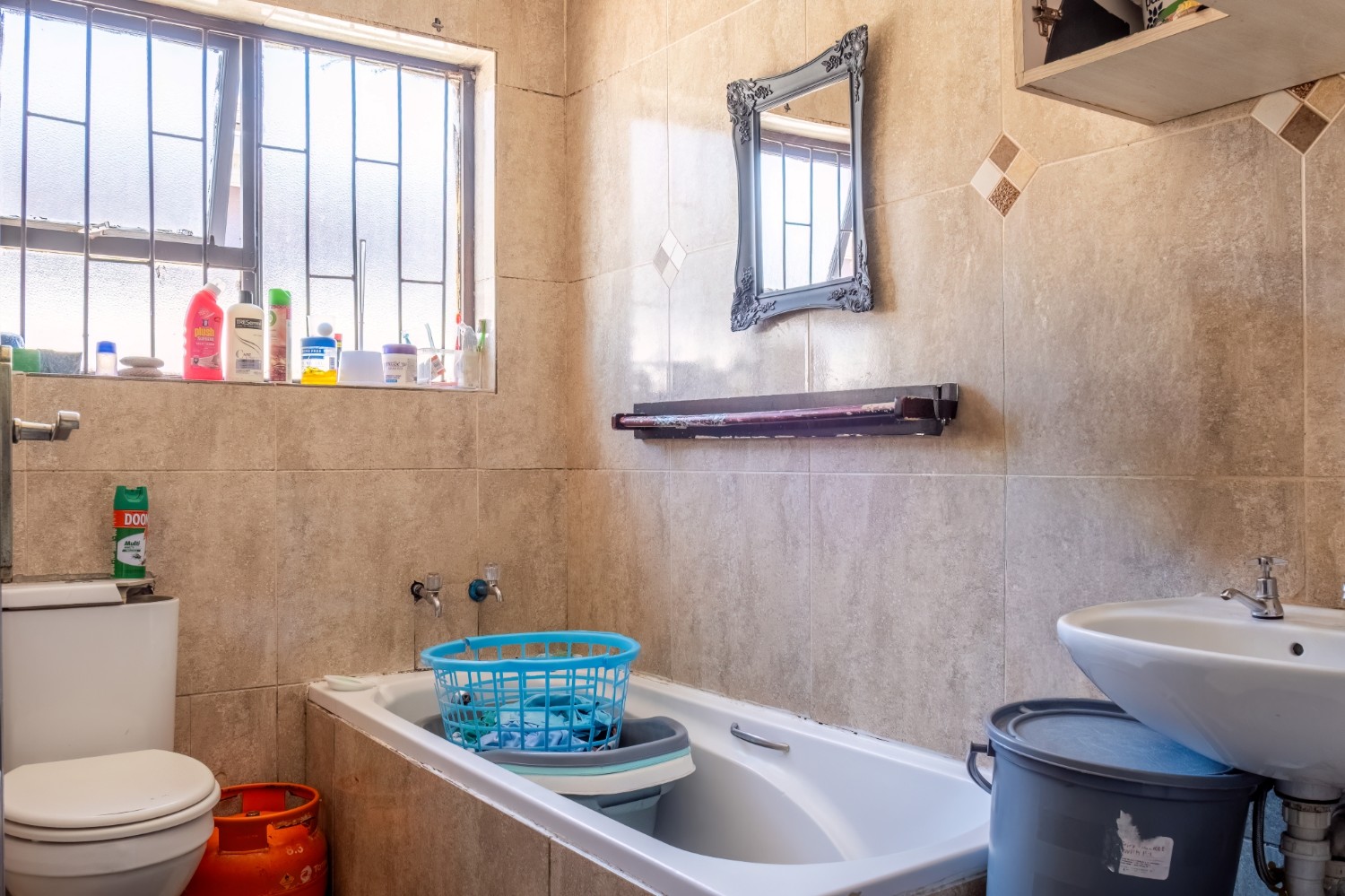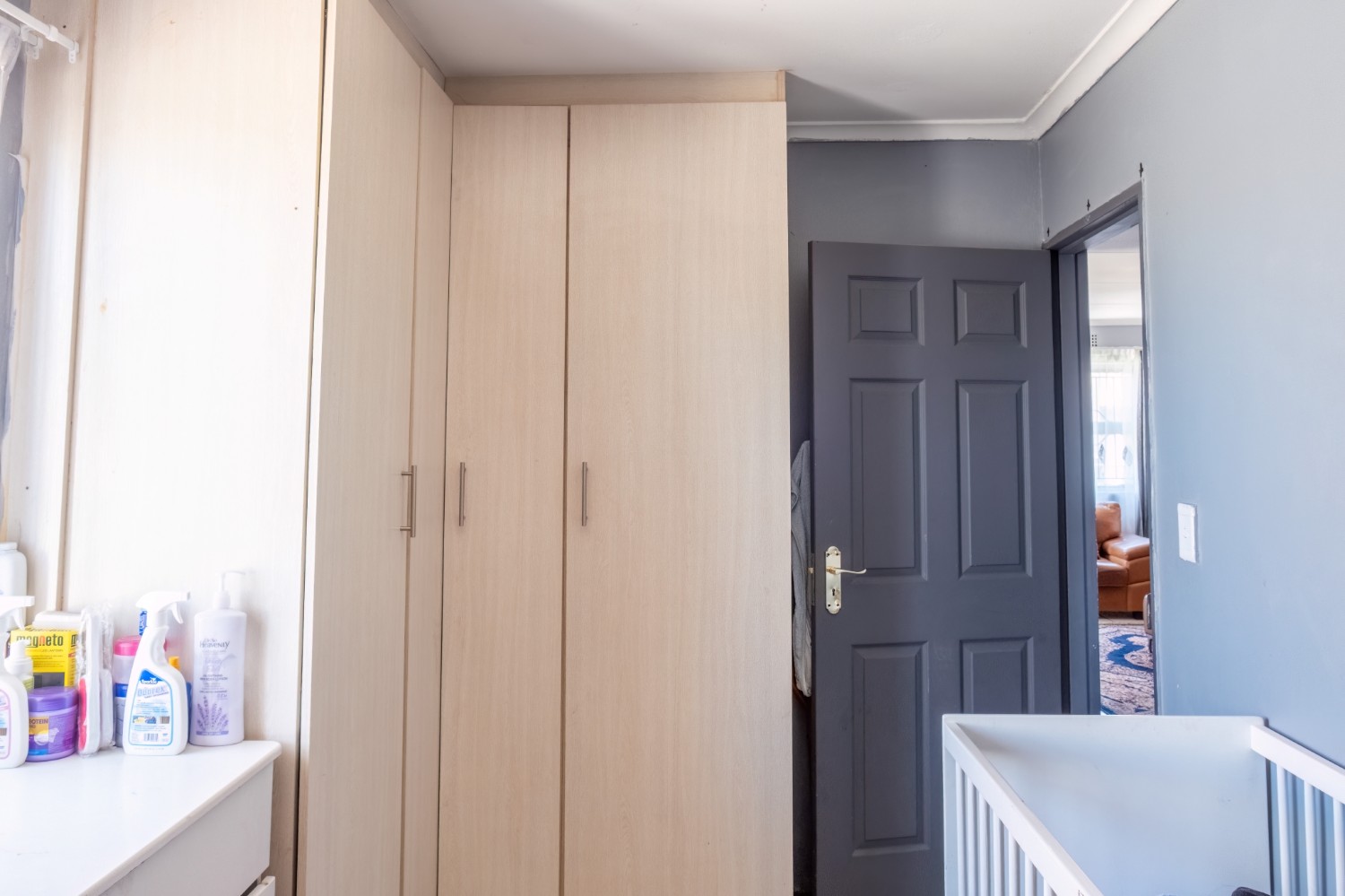 The home features three well-sized bedrooms with built-in cupboards, ideal for a growing family. The main bedroom is a standout, complete with a sliding door leading to the outdoor braai area as well as an en-suite bathroom. The main bathroom is neatly finished and fitted with a bathtub, basin, and toilet.