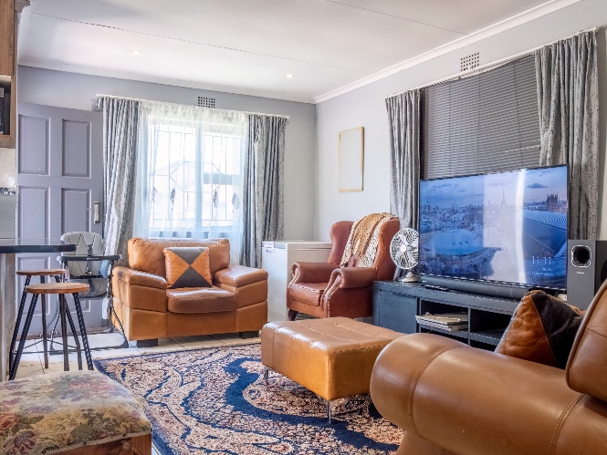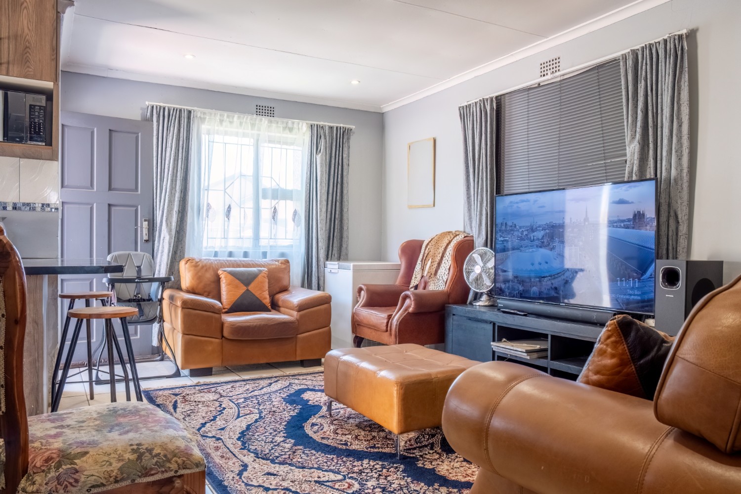 Step inside to a lovely lounge featuring tiled flooring and large windows that allow plenty of natural light to fill the space. The modern kitchen features built-in cupboards, an under-counter oven and hob, ample countertop space, and a designated area for your fridge.