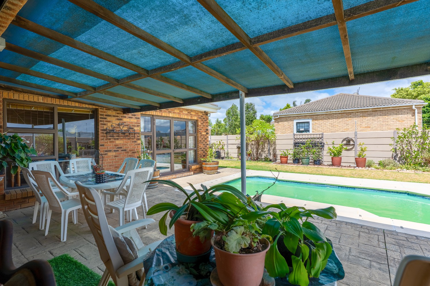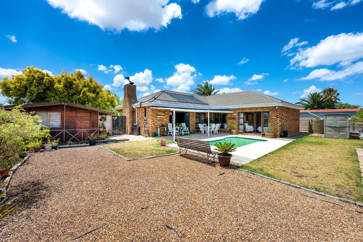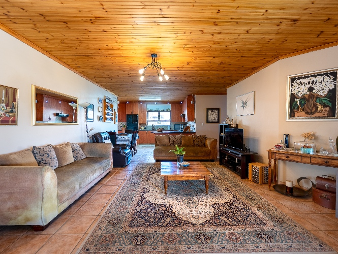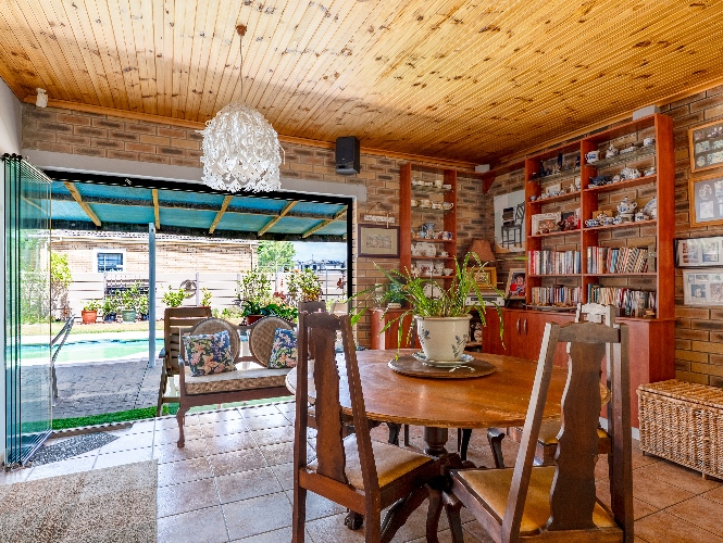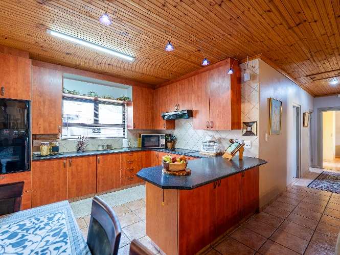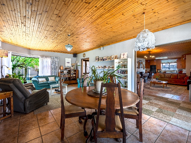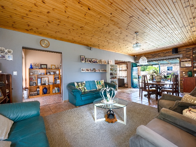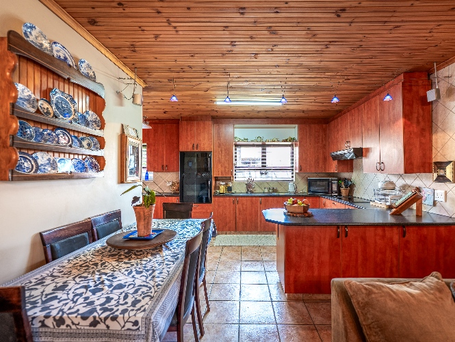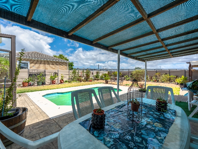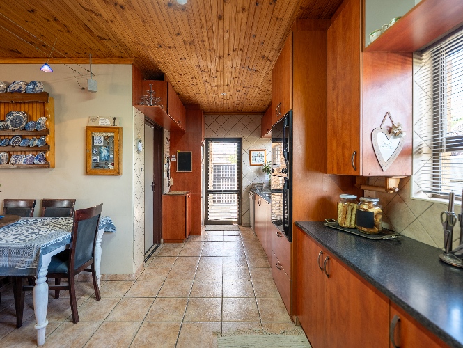 As you enter the home, you are welcomed by an expansive open-plan living area featuring a built-in braai, a dedicated dining space and stacker doors that open seamlessly onto the undercover patio and swimming pool. The dining area flows into a second lounge and a charming open-plan kitchen fitted with light wood cupboards, a breakfast counter, eye-level oven and hob, as well as a separate laundry and scullery nook for added convenience.