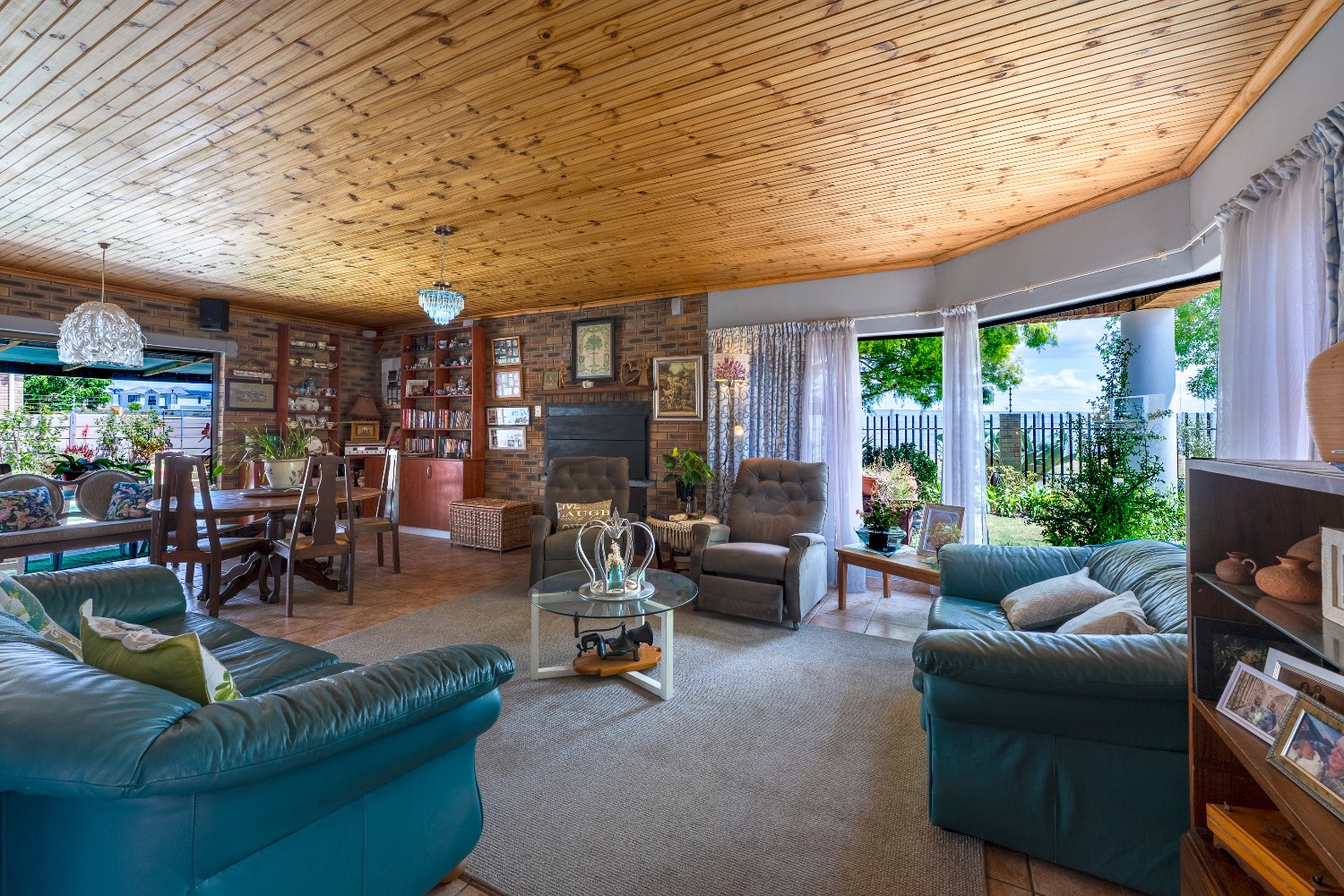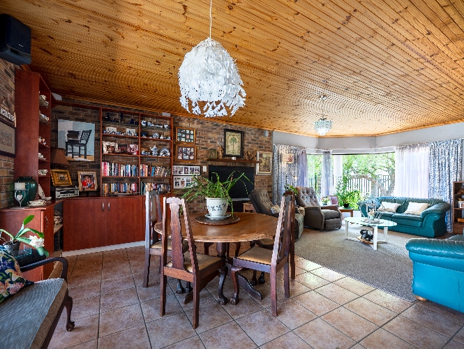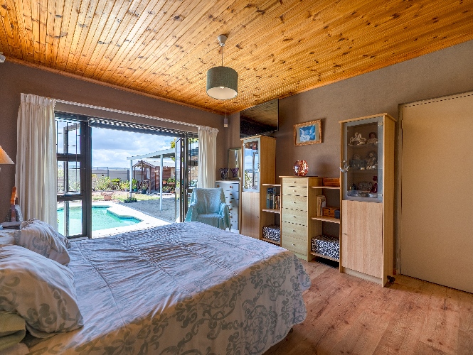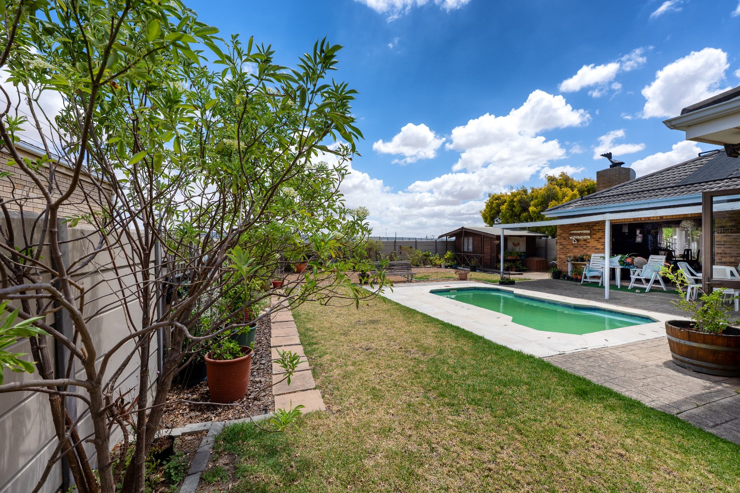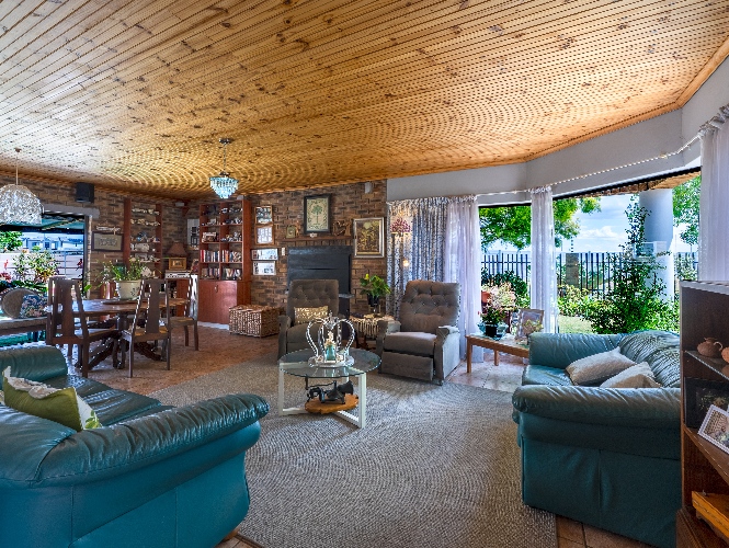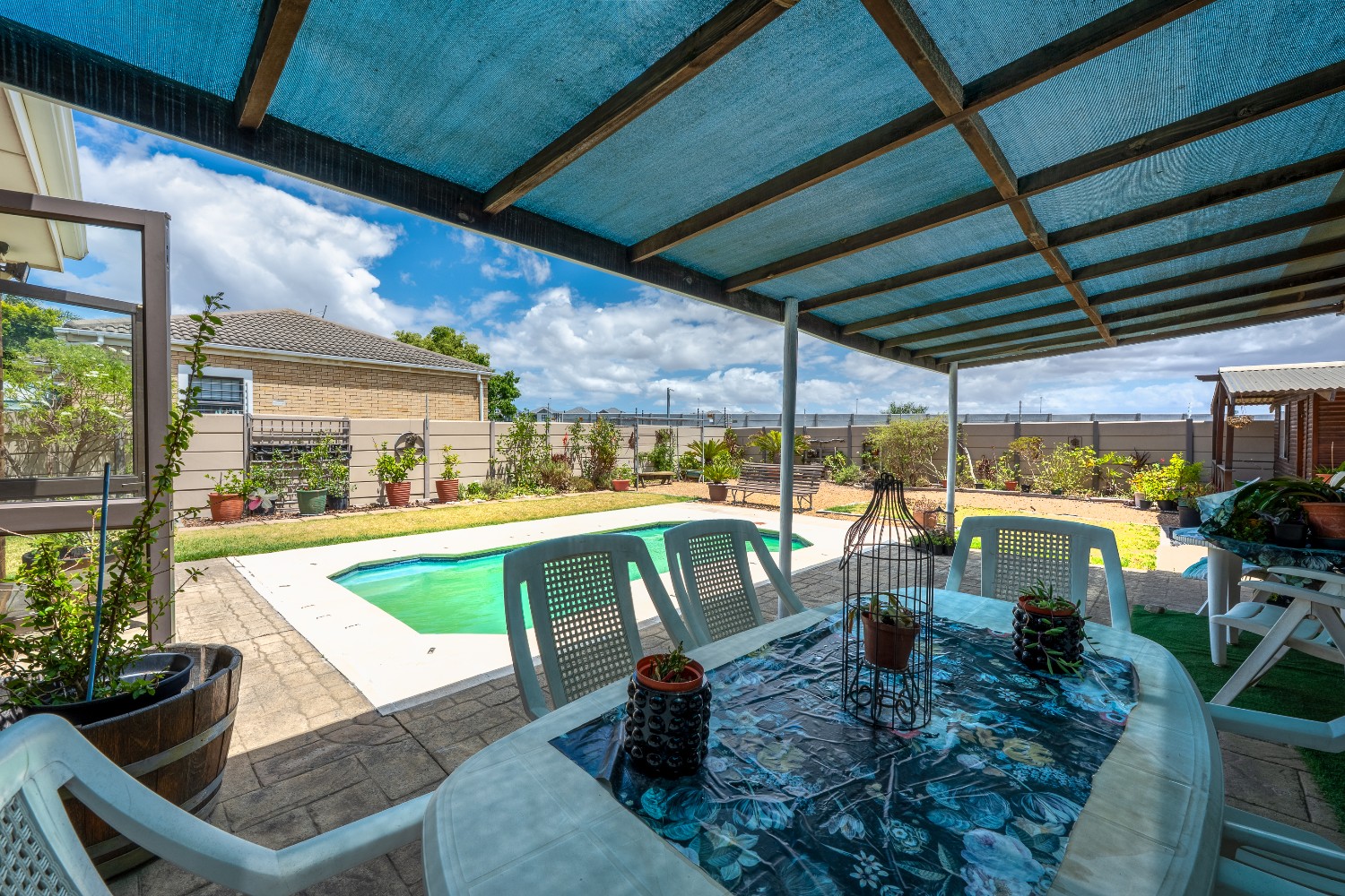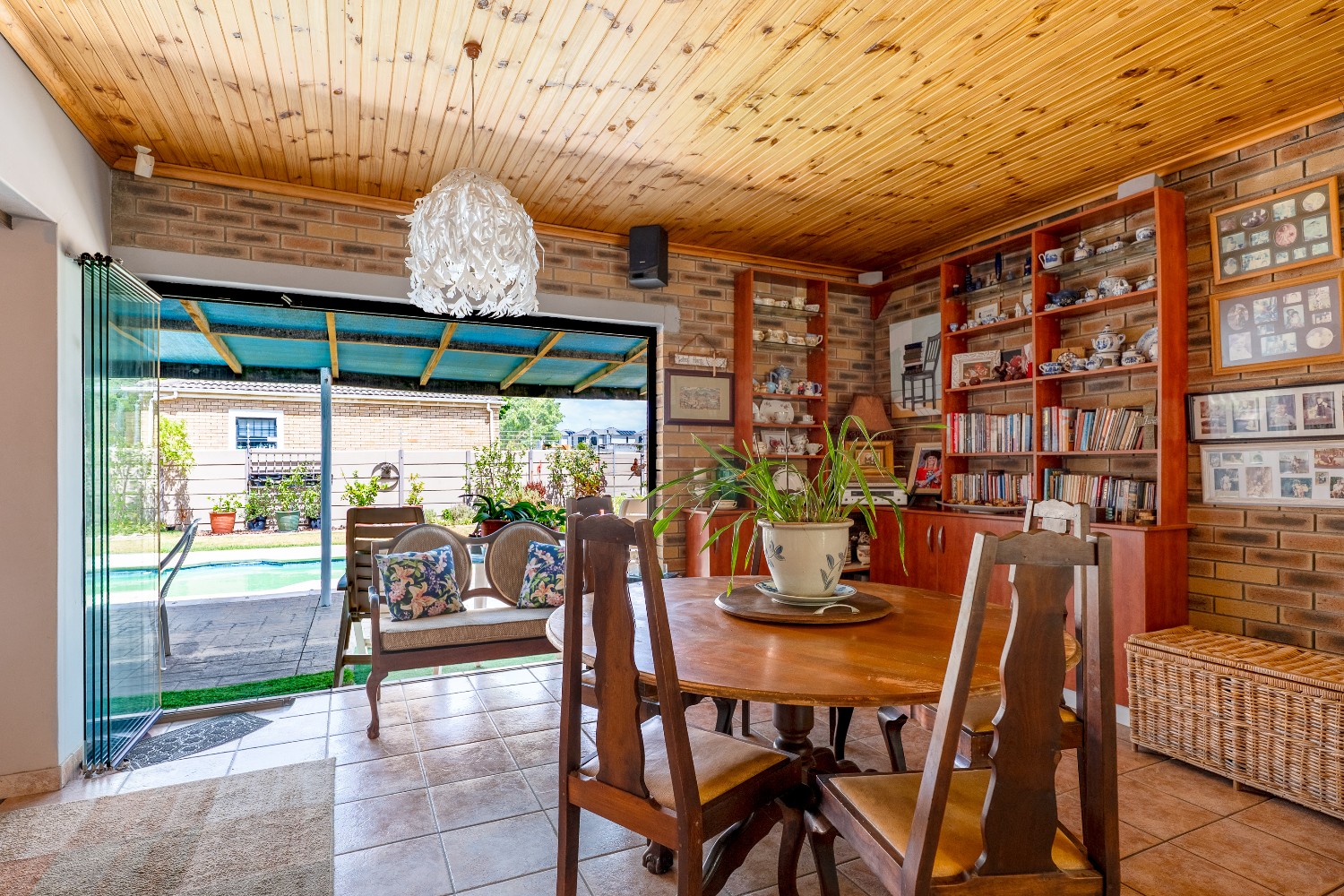 As you enter the home, you are welcomed by an expansive open-plan living area featuring a built-in braai, a dedicated dining space and stacker doors that open seamlessly onto the undercover patio and swimming pool. The dining area flows into a second lounge and a charming open-plan kitchen fitted with light wood cupboards, a breakfast counter, eye-level oven and hob, as well as a separate laundry and scullery nook for added convenience.