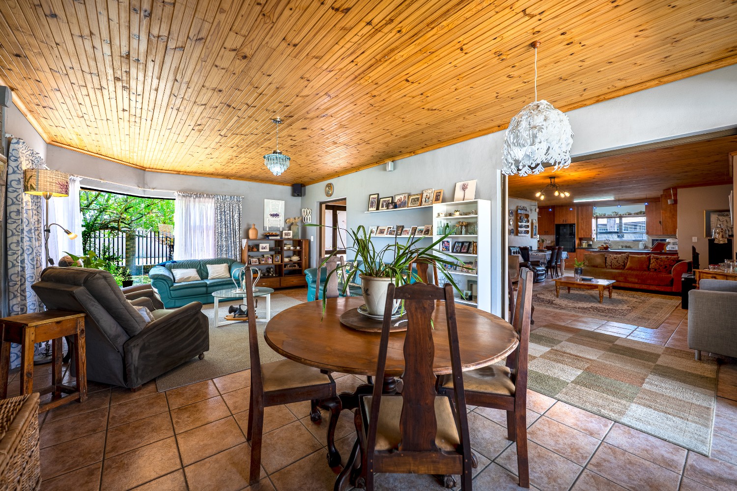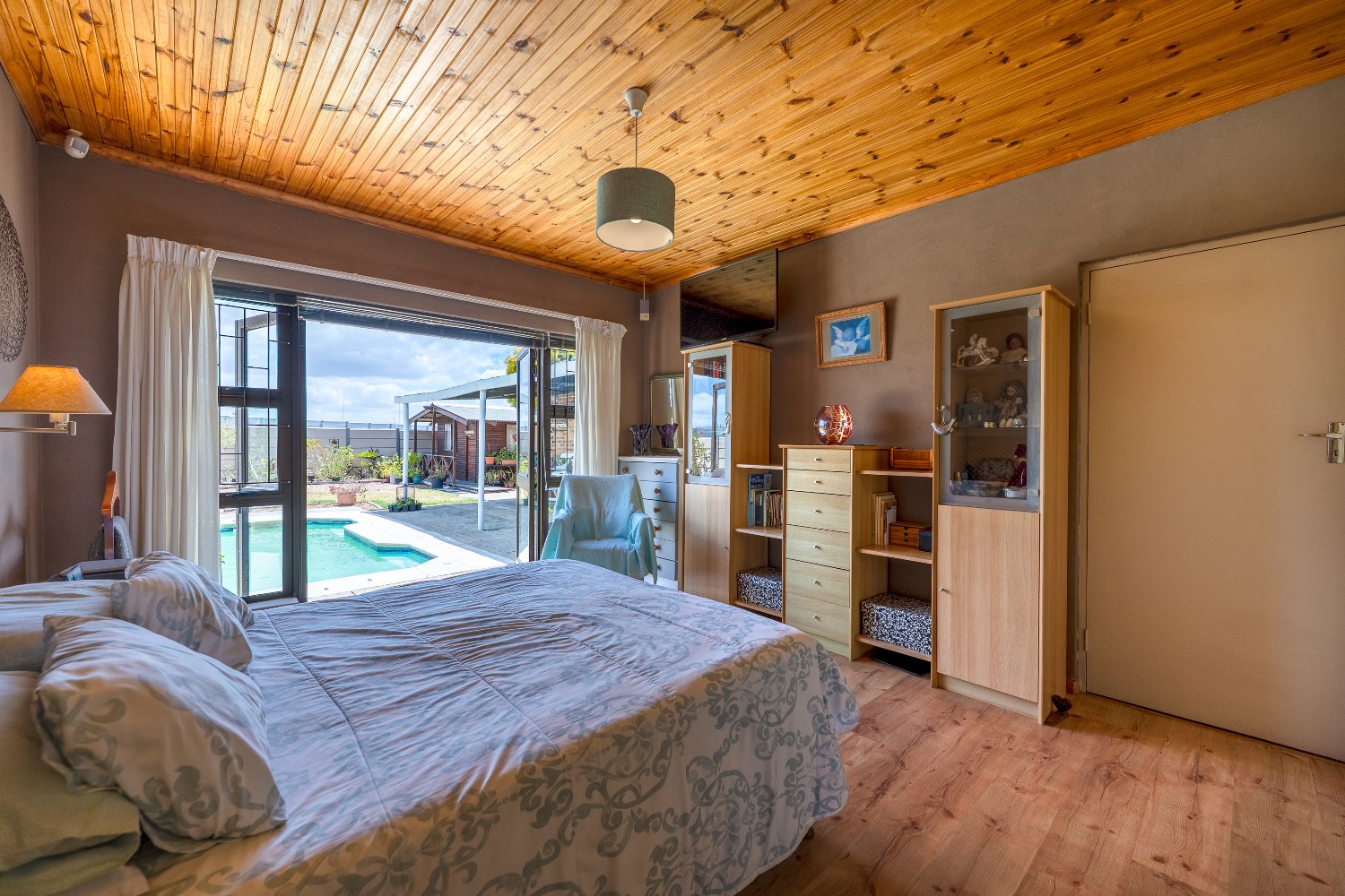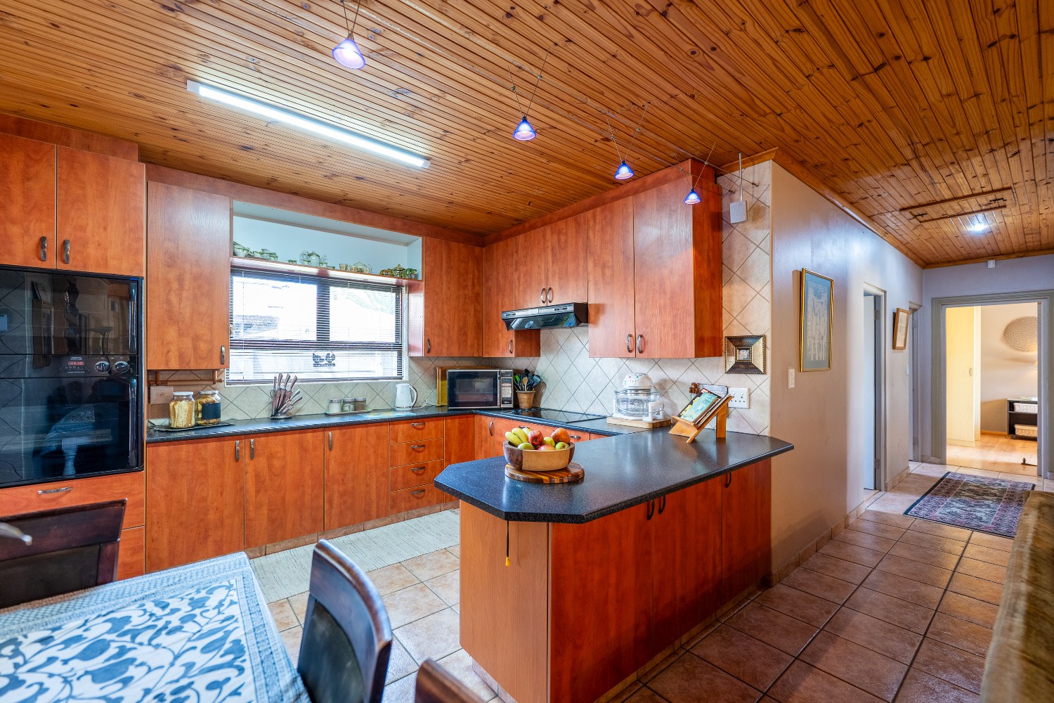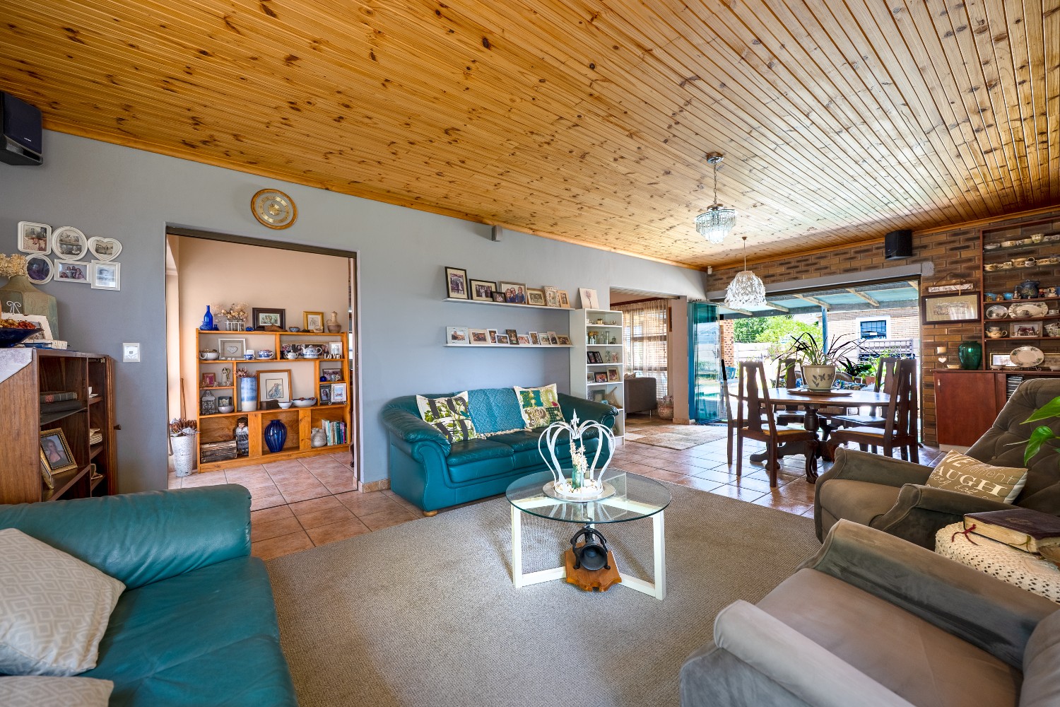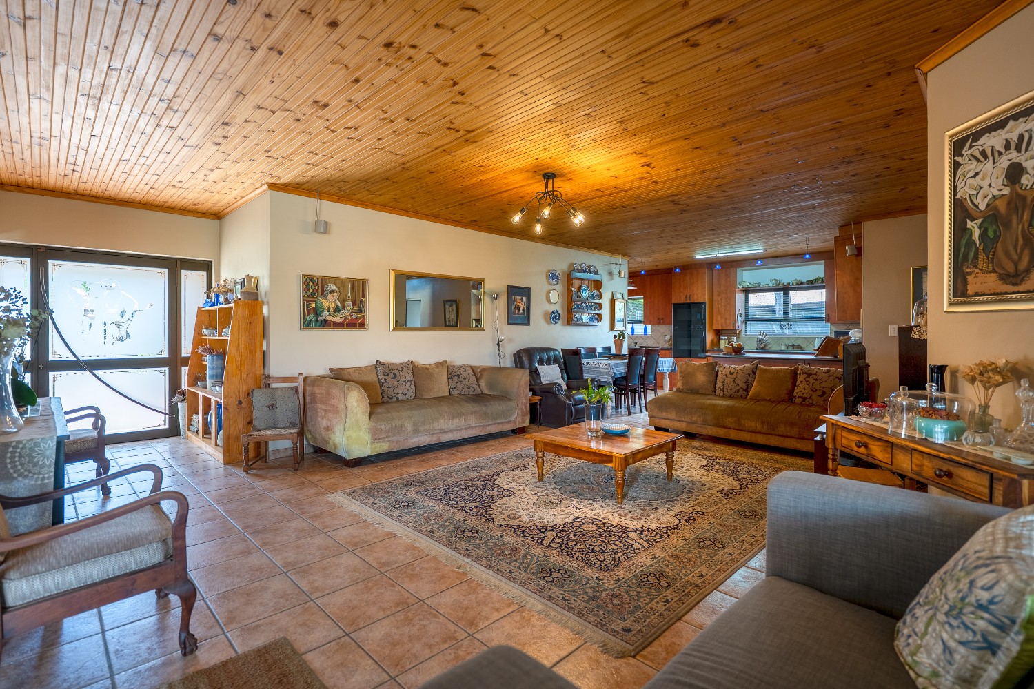 As you enter the home, you are welcomed by an expansive open-plan living area featuring a built-in braai, a dedicated dining space and stacker doors that open seamlessly onto the undercover patio and swimming pool. The dining area flows into a second lounge and a charming open-plan kitchen fitted with light wood cupboards, a breakfast counter, eye-level oven and hob, as well as a separate laundry and scullery nook for added convenience.