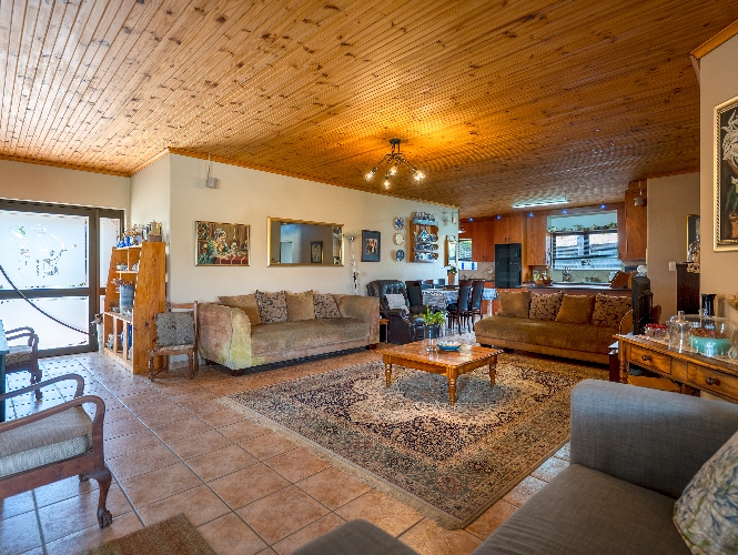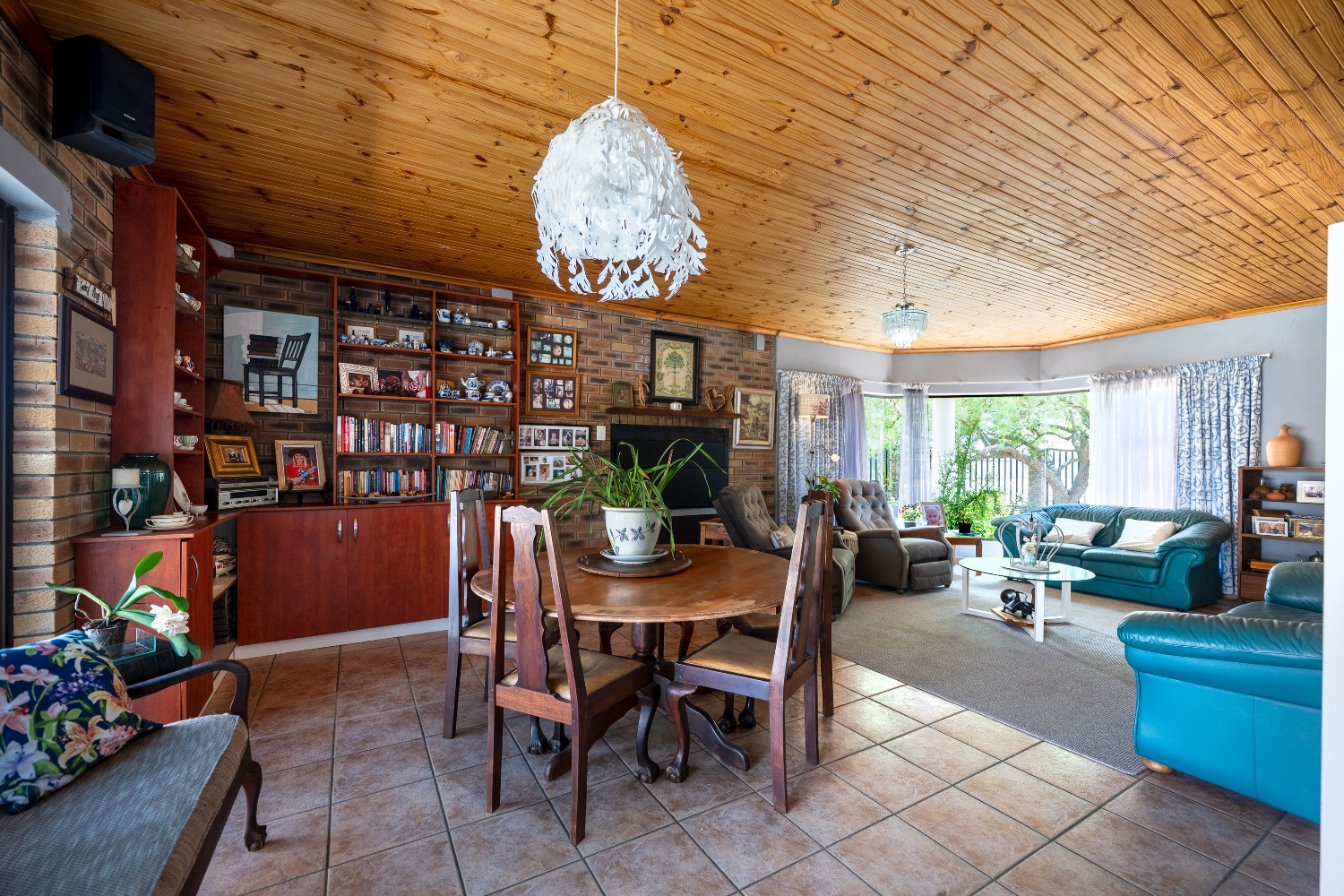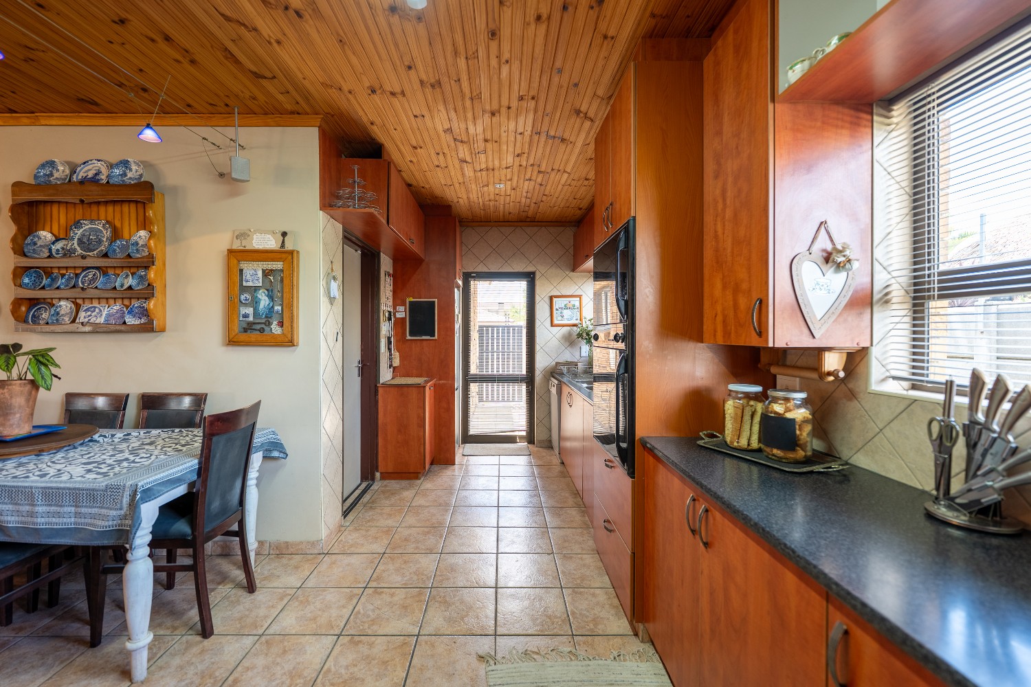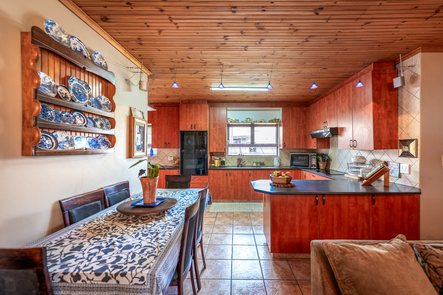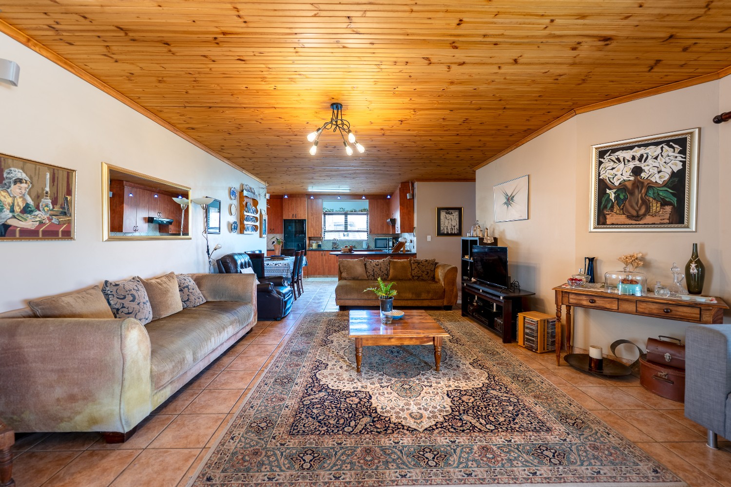 As you enter the home, you are welcomed by an expansive open-plan living area featuring a built-in braai, a dedicated dining space and stacker doors that open seamlessly onto the undercover patio and swimming pool. The dining area flows into a second lounge and a charming open-plan kitchen fitted with light wood cupboards, a breakfast counter, eye-level oven and hob, as well as a separate laundry and scullery nook for added convenience.