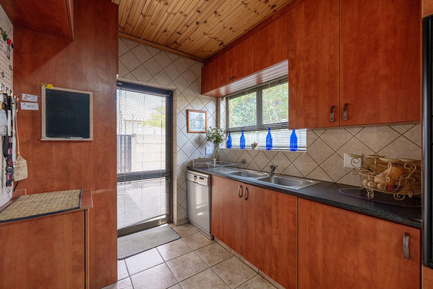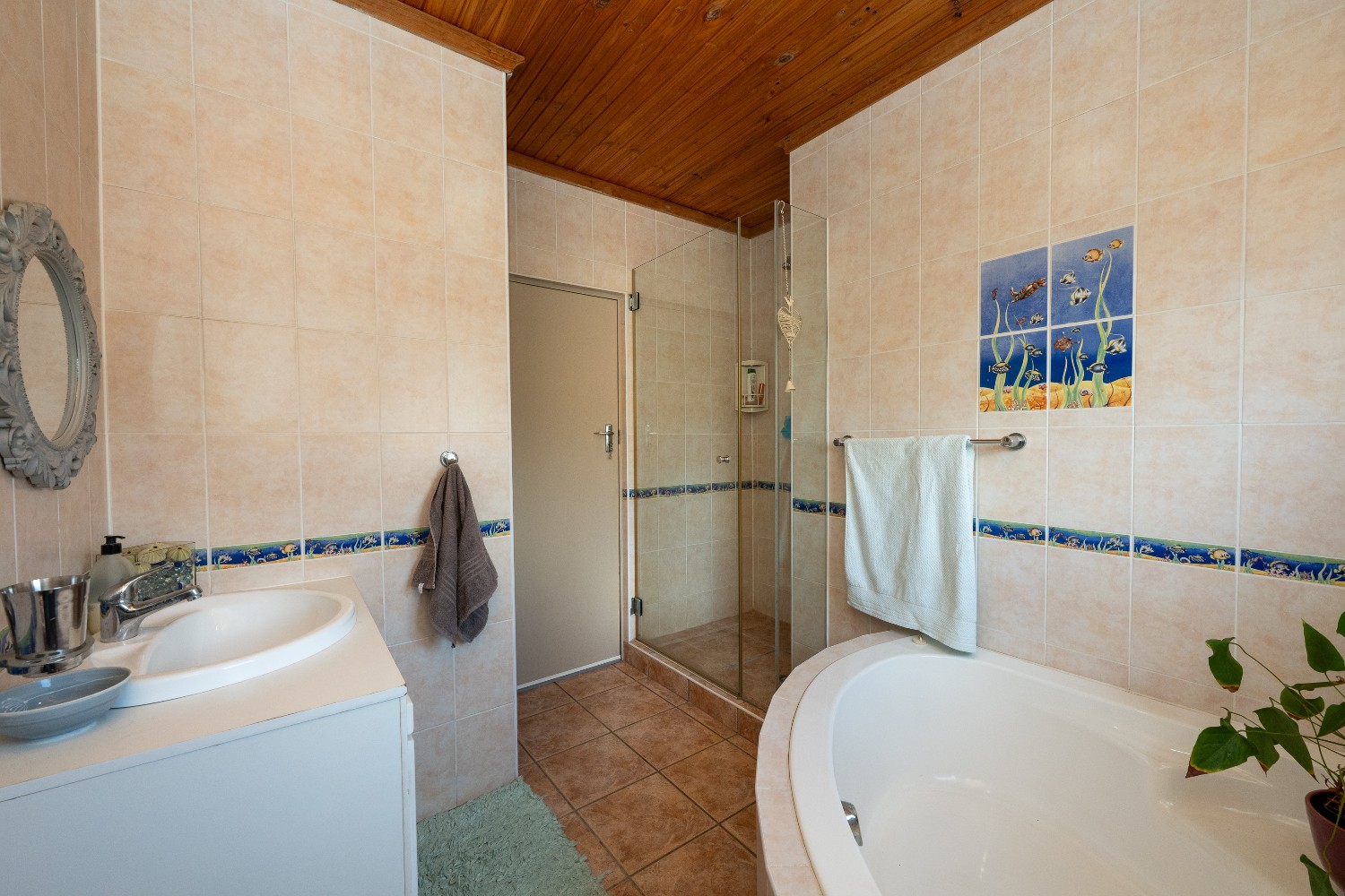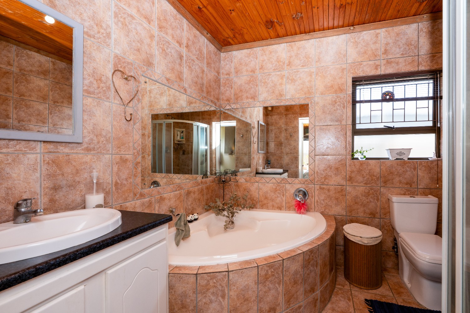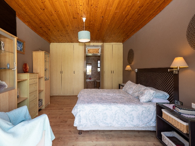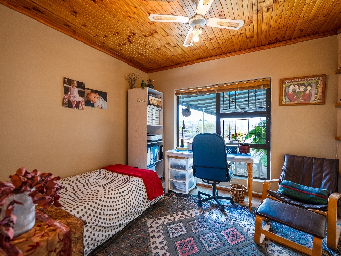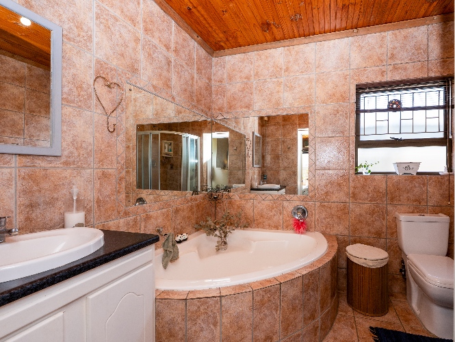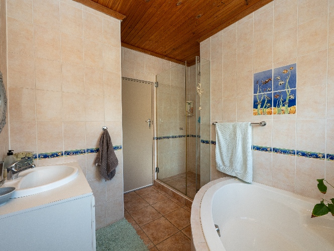The home offers three spacious bedrooms, all fitted with built-in cupboards. The luxurious main bedroom features a full en-suite bathroom with a shower, bathtub, basin and toilet, and opens directly onto the garden and pool area. The family bathroom is tastefully tiled and includes a shower, bathtub, basin and toilet.
