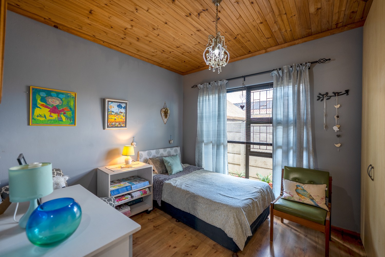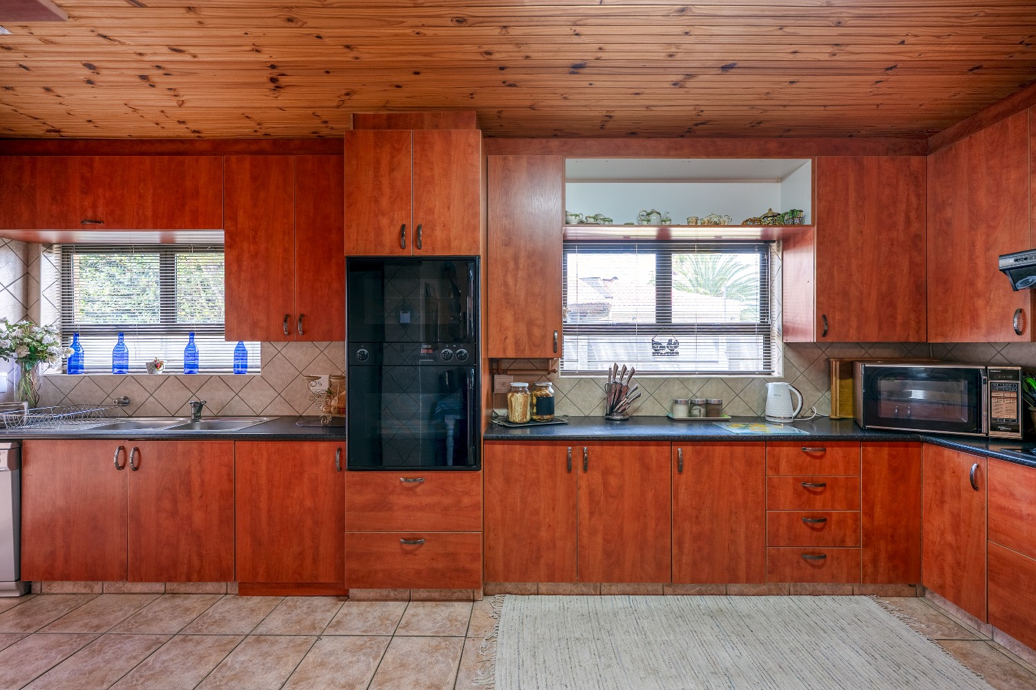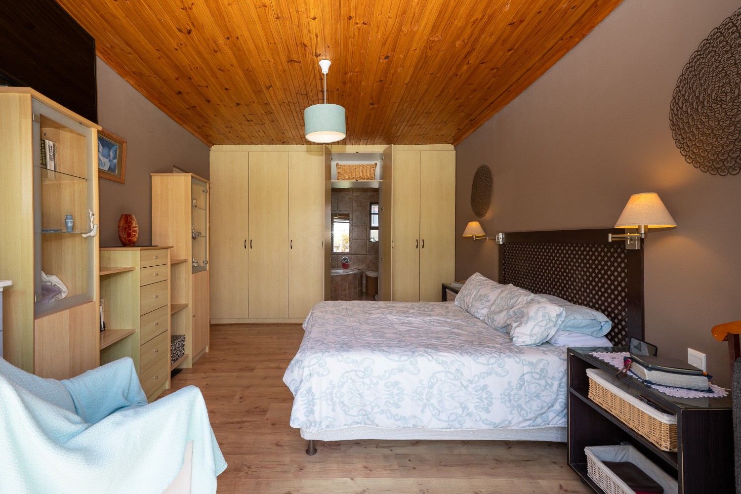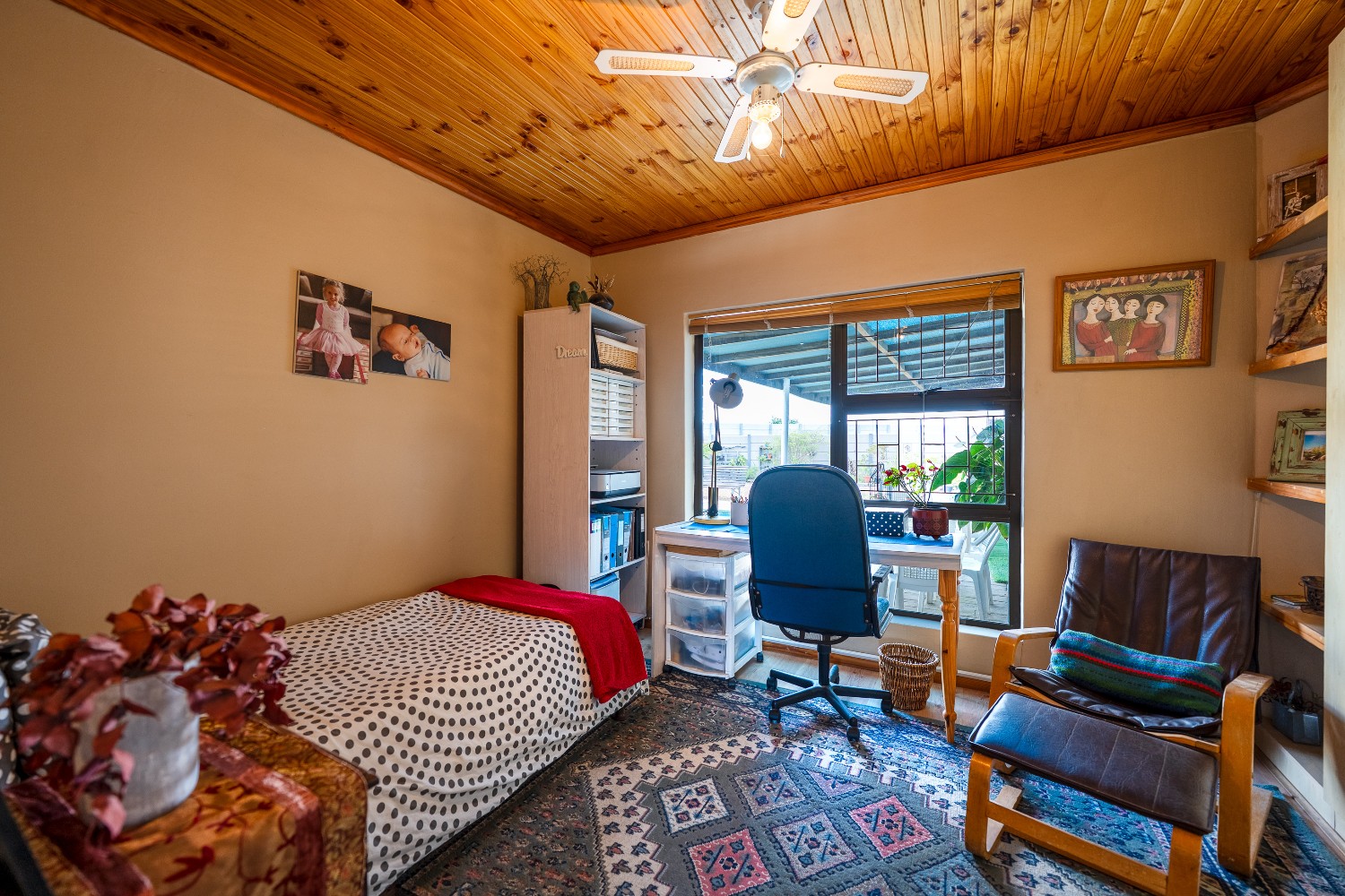 The home offers three spacious bedrooms, all fitted with built-in cupboards. The luxurious main bedroom features a full en-suite bathroom with a shower, bathtub, basin and toilet, and opens directly onto the garden and pool area. The family bathroom is tastefully tiled and includes a shower, bathtub, basin and toilet.