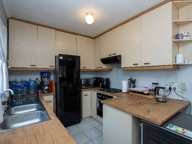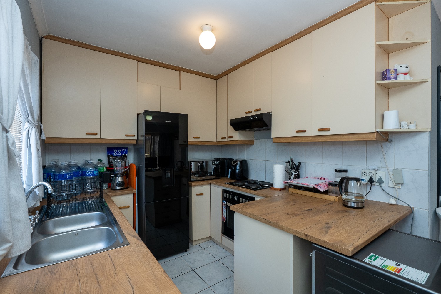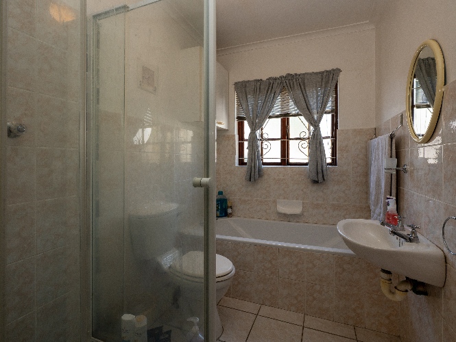 Both bedrooms are generously sized and sunny, featuring carpeted flooring, built-in cupboards, and charming wooden window frames. The tastefully tiled family bathroom is fitted with a bathtub, shower, basin, and toilet, catering comfortably to everyday living.