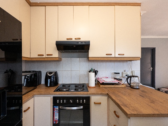 The home offers a spacious open-plan lounge filled with natural light, creating a warm and inviting atmosphere. A door from the lounge leads out to an undercover patio, perfect for relaxing or entertaining. The well-appointed kitchen features light wood cupboards, an under-counter oven and hob, a plumbing point, a breakfast counter, and space for a fridge, offering both functionality and style.