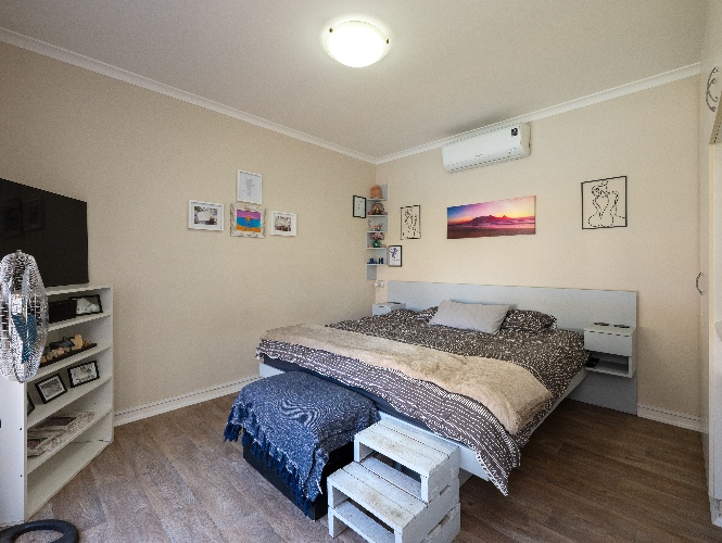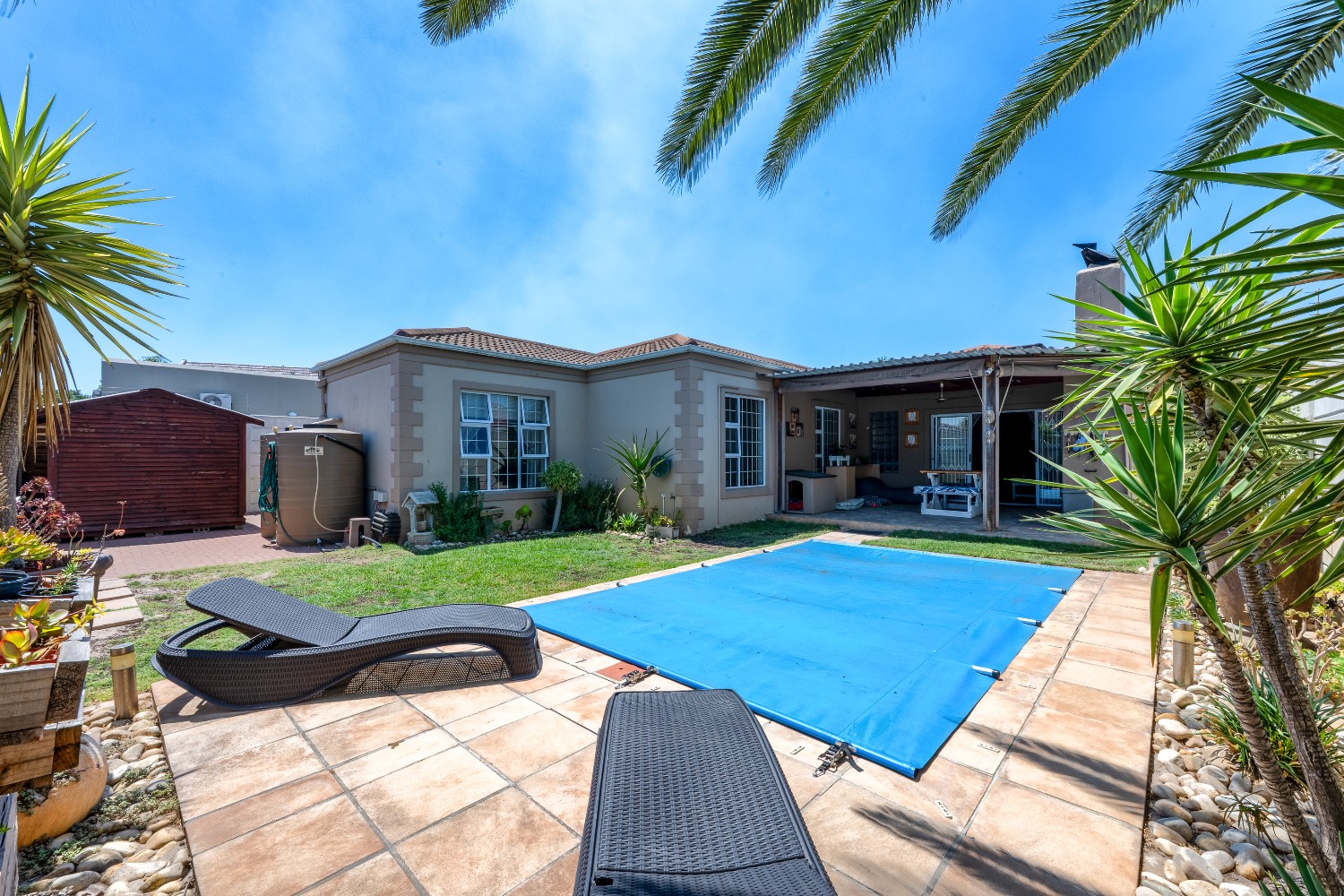 Additional features include a double garage, air conditioning in every room, a camera system, alarm system, and well point with two JoJo tanks and pumps to support efficient water usage.