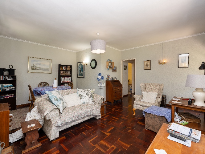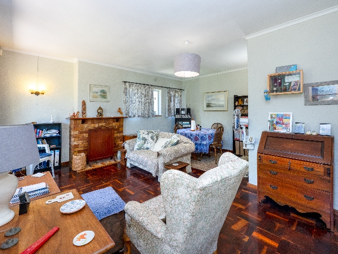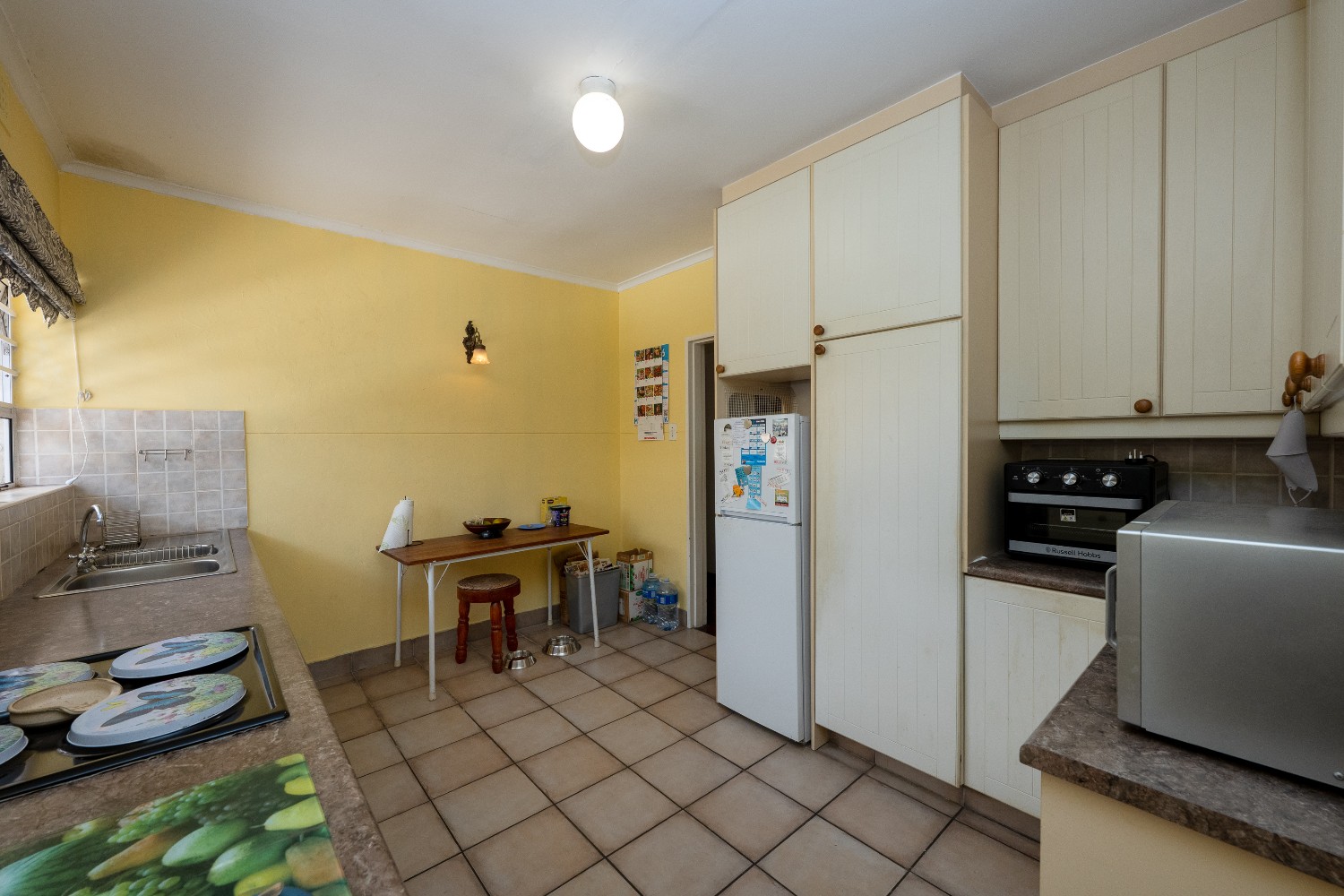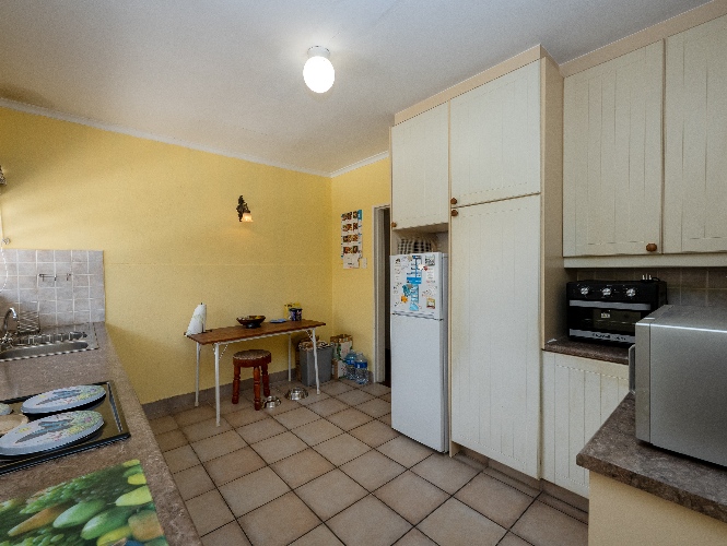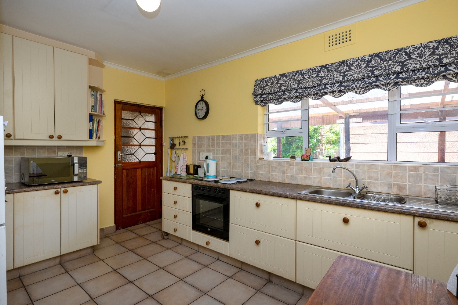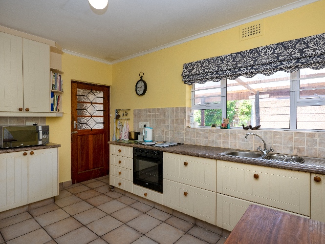 Upon entering the home, you are greeted by a generously sized lounge and dining room featuring beautiful parquet flooring and large windows that allow for an abundance of natural light. The farm-style kitchen is both practical and inviting, offering ample cupboard and countertop space, an under-counter oven and hob, a double sink, and room for all your appliances.