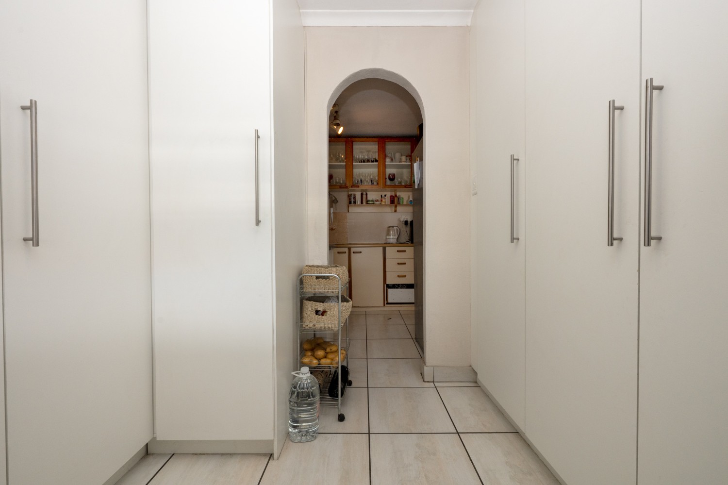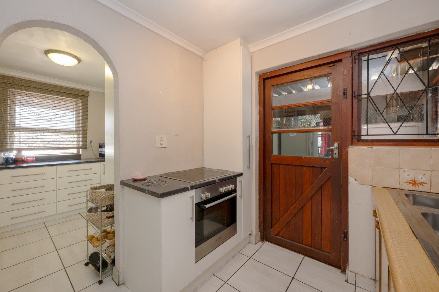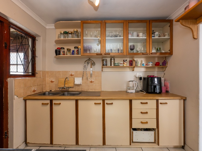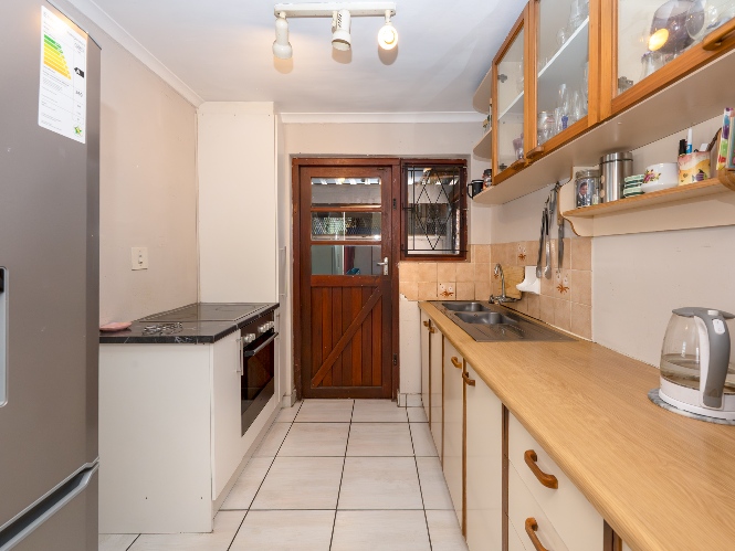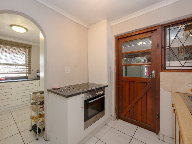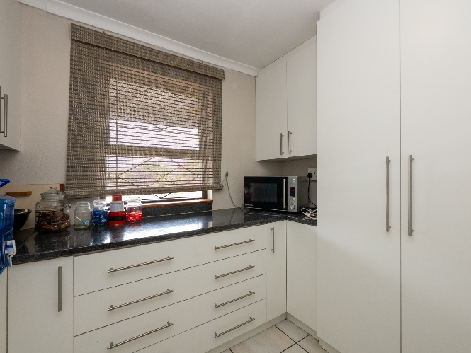 The property features a welcoming lounge with tiled flooring, creating a neat and low-maintenance living space. The kitchen is well-appointed with a stove and oven, ample cabinetry, and additional pantry cupboards, providing plenty of storage and functionality.