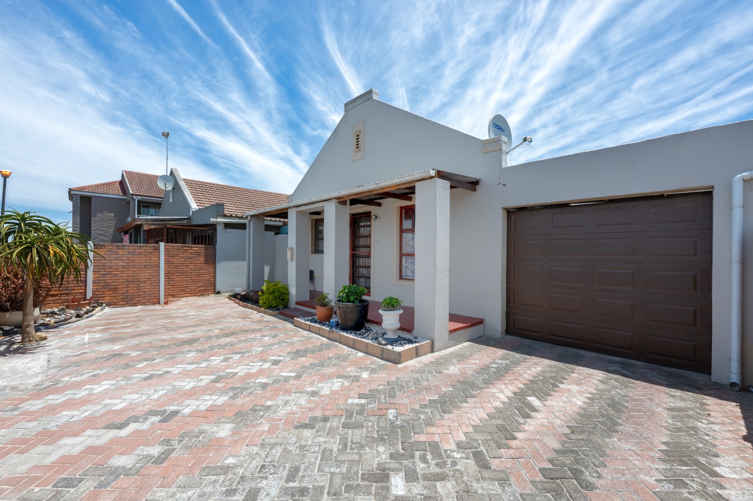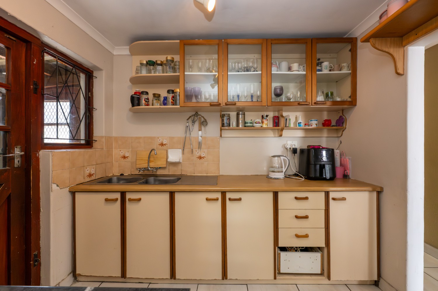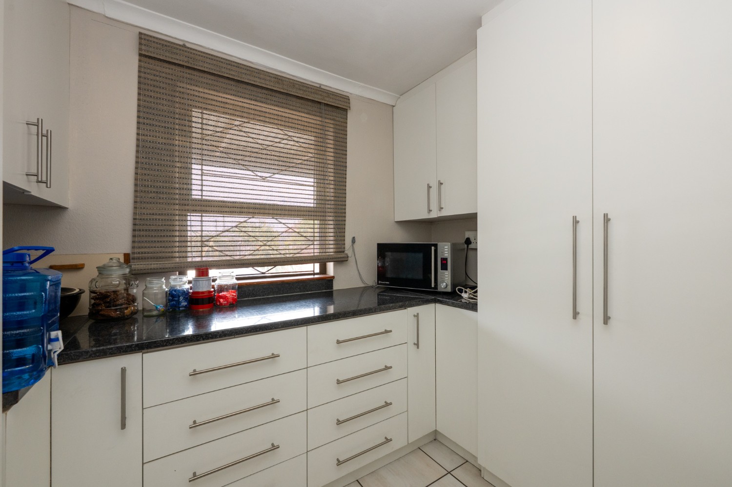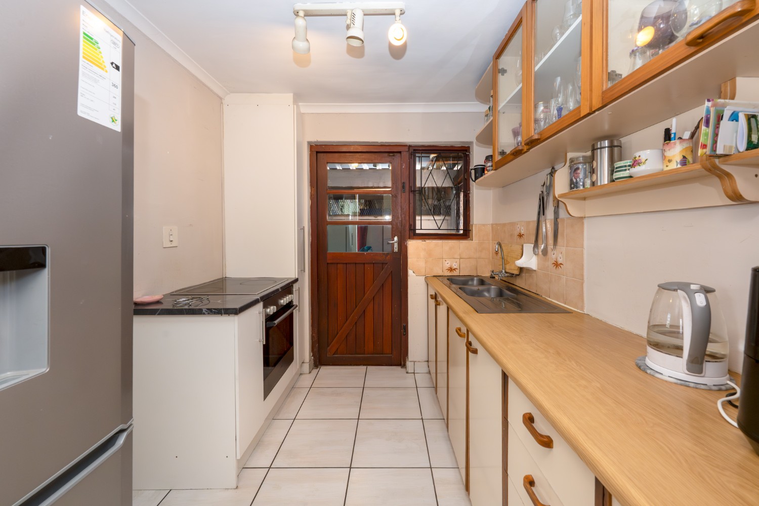 The property features a welcoming lounge with tiled flooring, creating a neat and low-maintenance living space. The kitchen is well-appointed with a stove and oven, ample cabinetry, and additional pantry cupboards, providing plenty of storage and functionality.