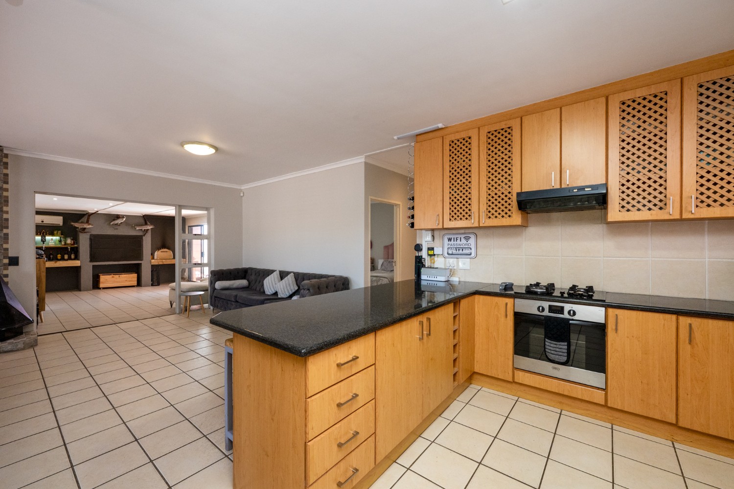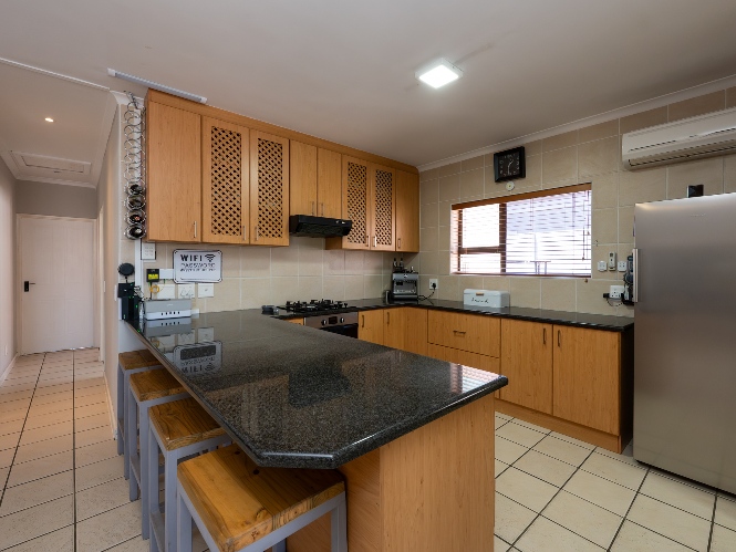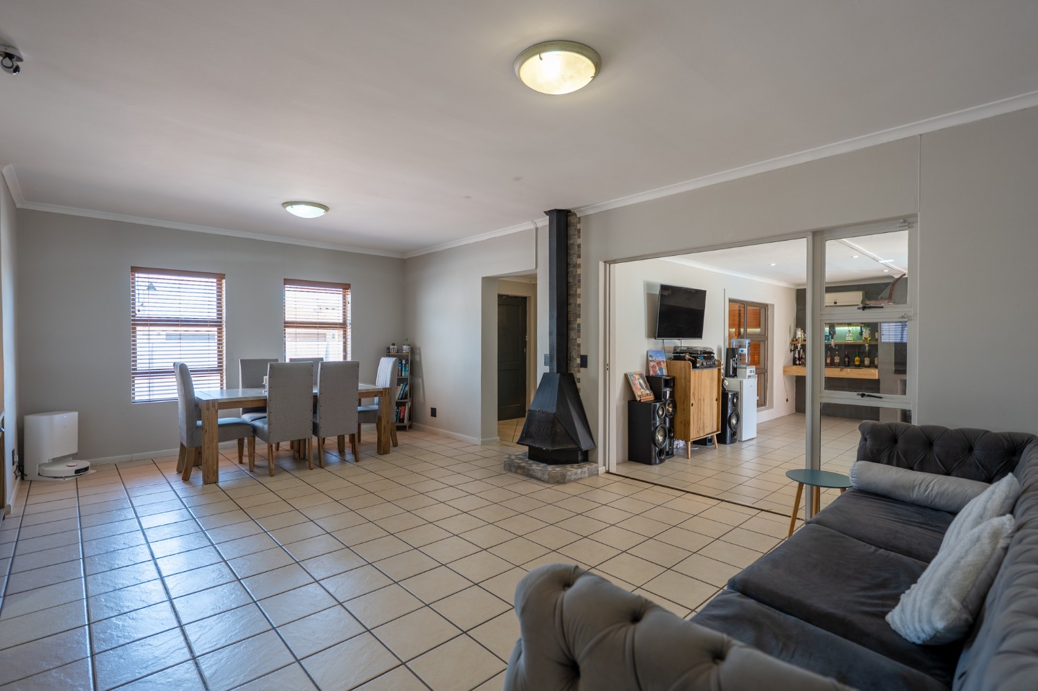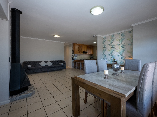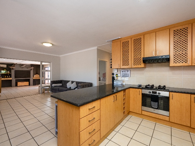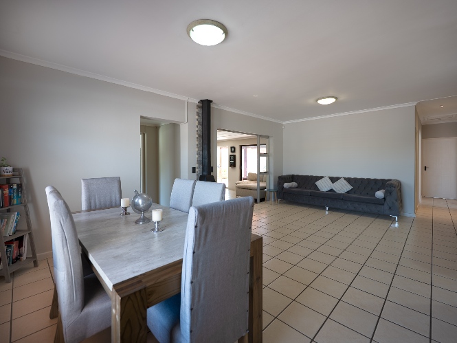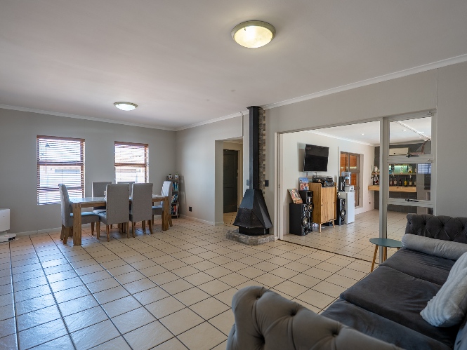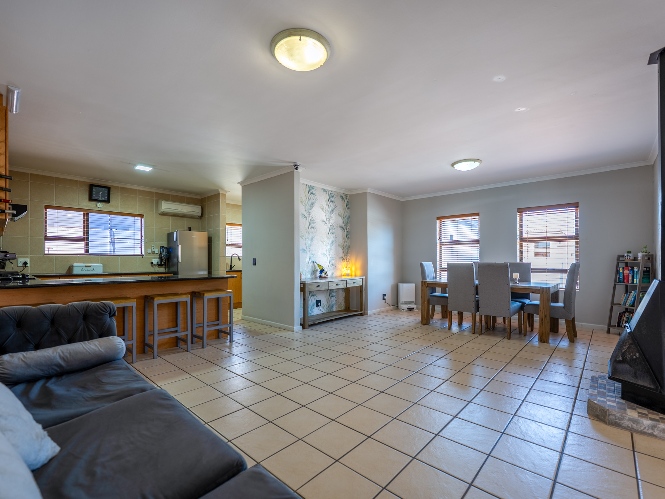 The home boasts 4 well-sized bedrooms, all fitted with built-in cupboards, with the main bedroom featuring a full en-suite bathroom. A full family bathroom services the remaining bedrooms. The kitchen is thoughtfully designed, featuring gas cooking and a separate scullery that flows seamlessly into the dining area and a welcoming lounge complete with a fireplace, creating a warm and inviting atmosphere.