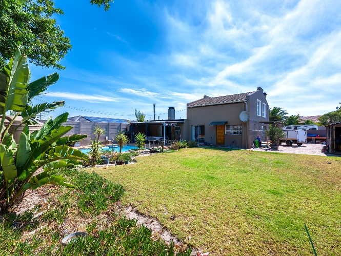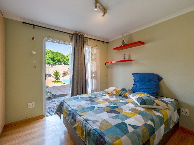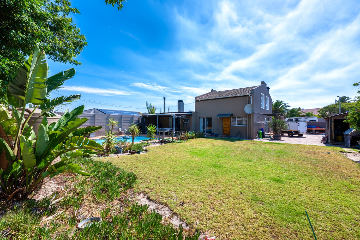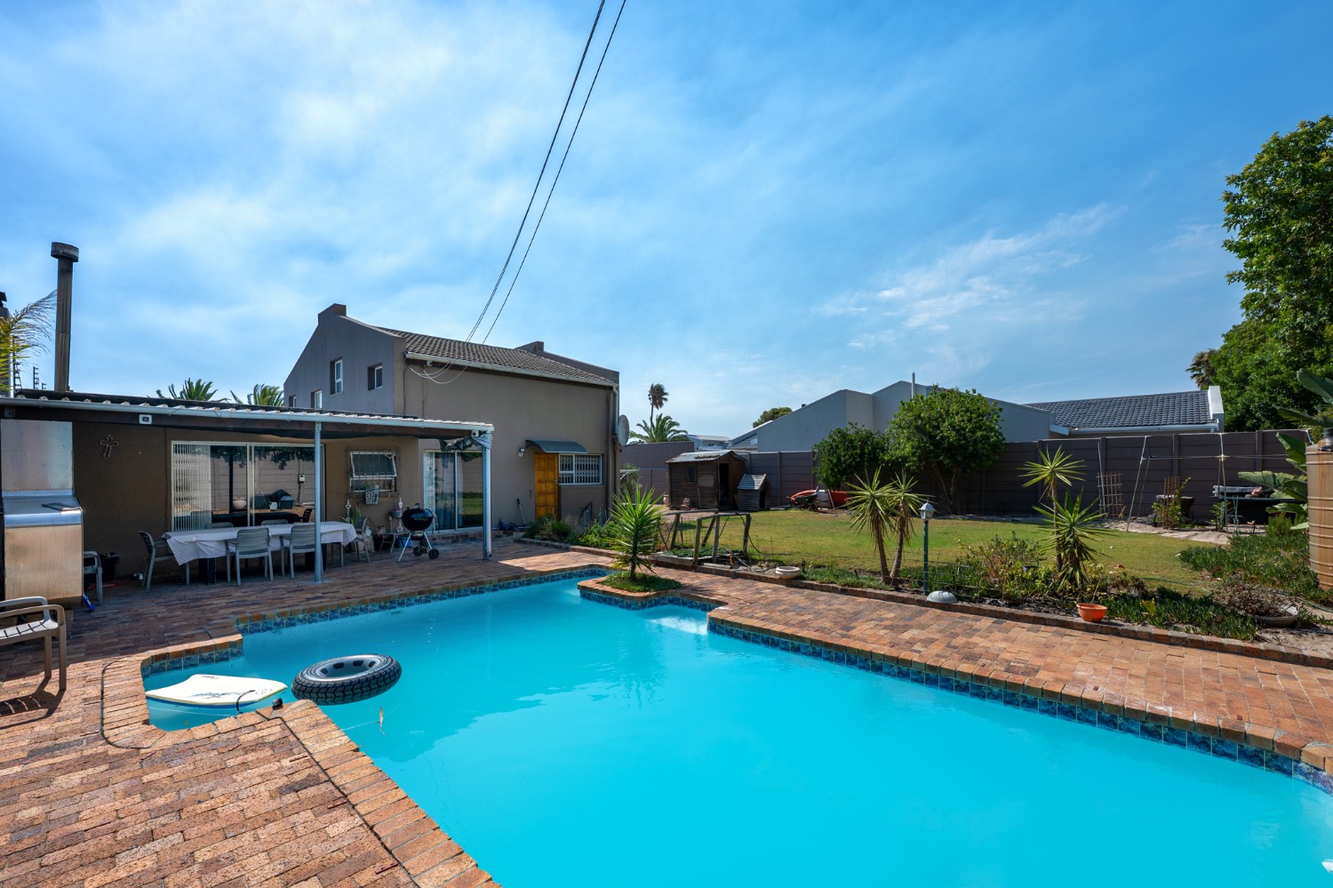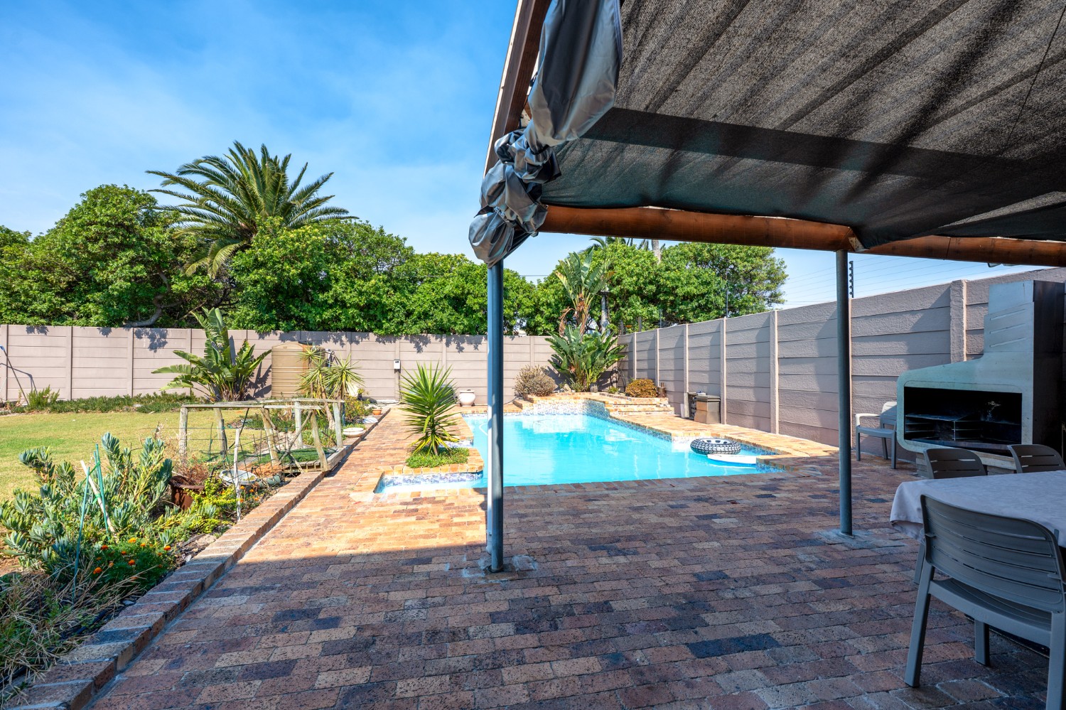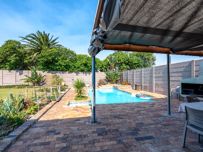 Step outside to a massive, private, and fully walled garden, offering exceptional space and privacy. The outdoor area boasts a gunnite swimming pool and a patio with built-in braai, perfect for entertaining. An additional secure gated parking area provides space for multiple vehicles, a boat, or a caravan.