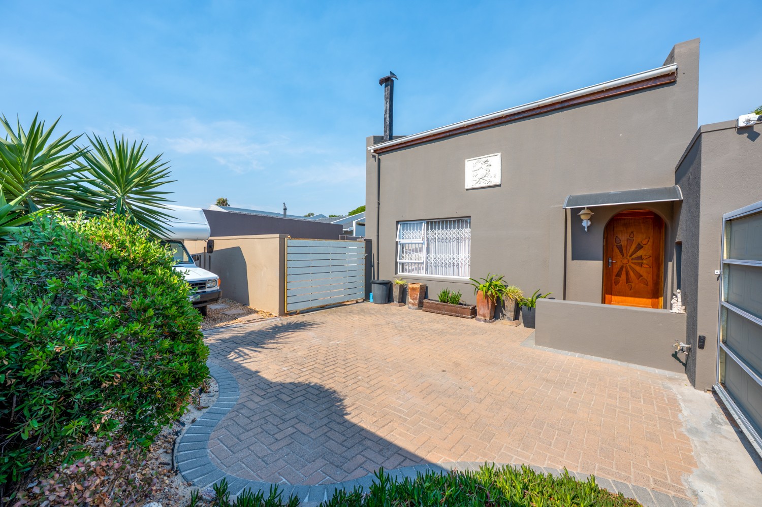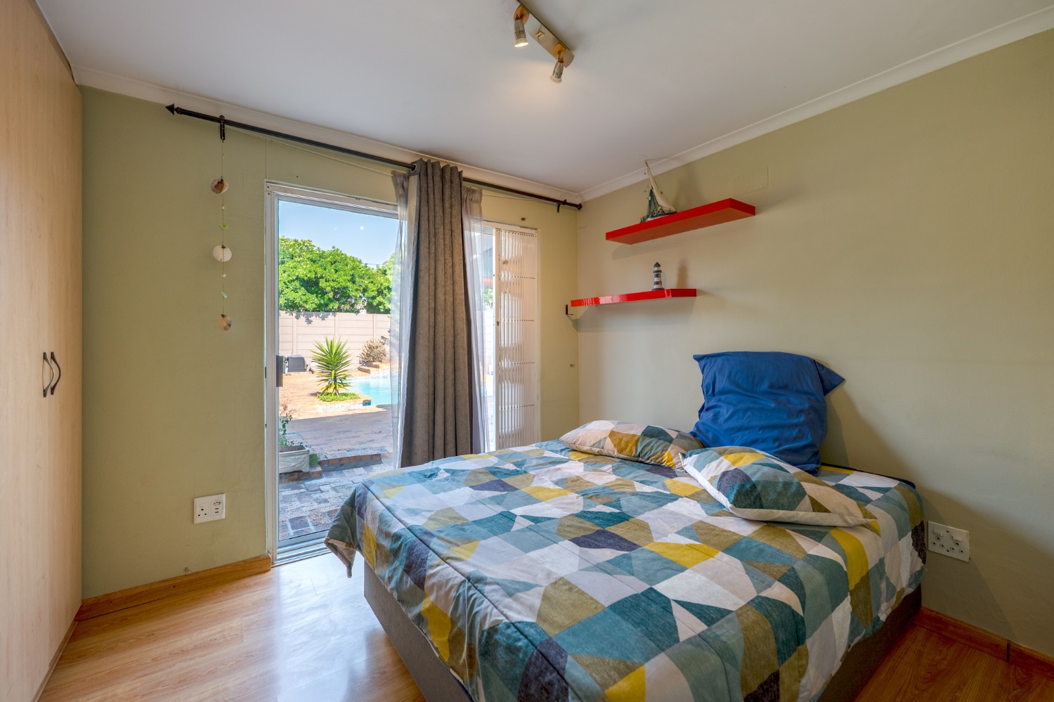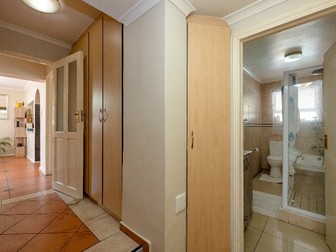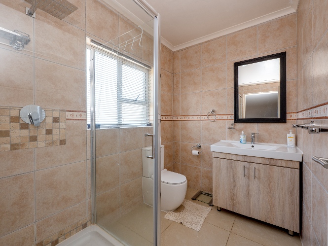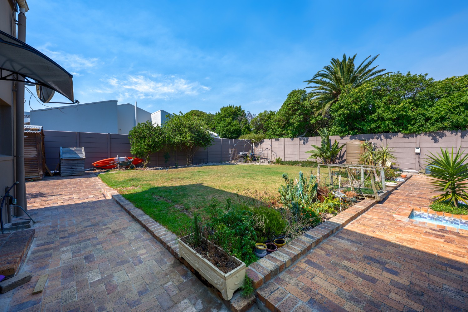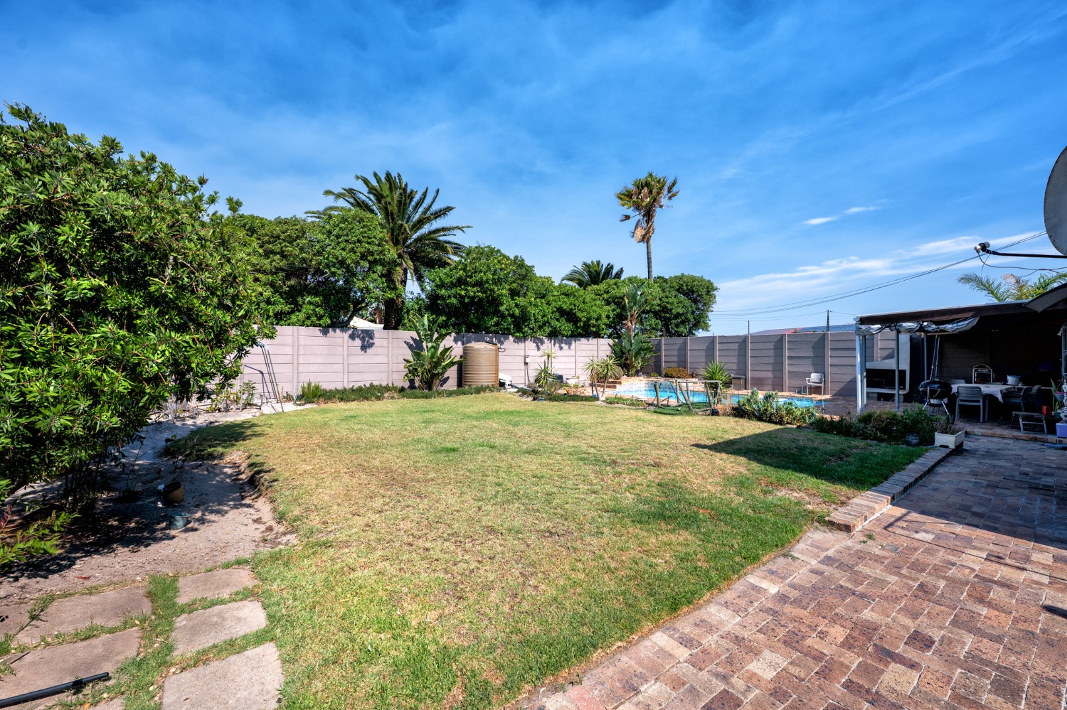 Step outside to a massive, private, and fully walled garden, offering exceptional space and privacy. The outdoor area boasts a gunnite swimming pool and a patio with built-in braai, perfect for entertaining. An additional secure gated parking area provides space for multiple vehicles, a boat, or a caravan.