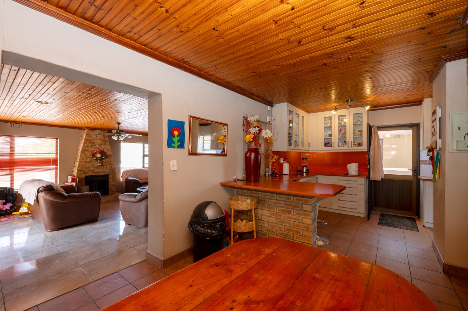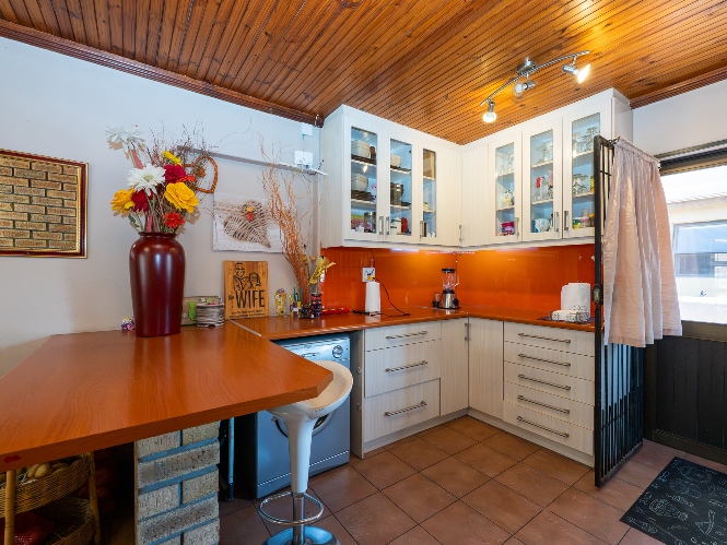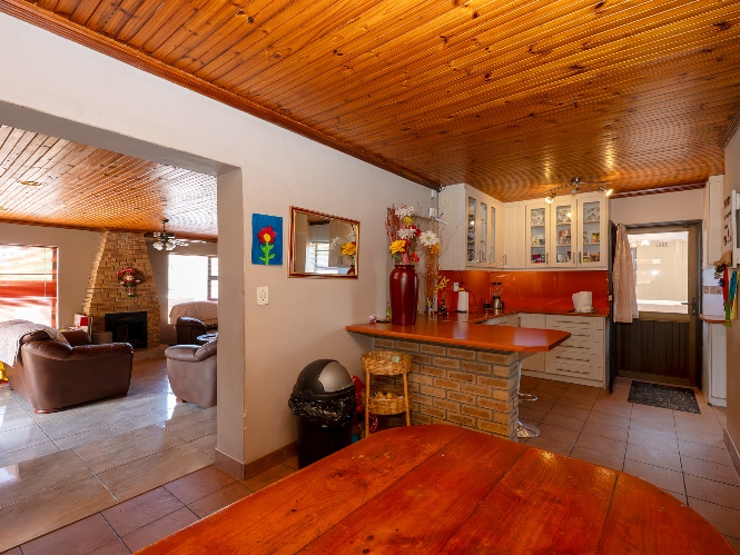 The home features a well-sized lounge with a cozy fireplace, wooden ceilings, and modern downlights. Sliding doors open from the lounge directly to the yard, allowing for great indoor-outdoor flow and natural light. The kitchen is complemented by a dining area and offers built-in cupboards, a plumbing point, and a stove, creating a practical and welcoming space for daily living.