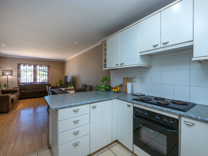 The home features an open-plan lounge and dining area with beautiful flooring, modern downlights, and a large window that allows for an abundance of natural light, creating a warm and inviting atmosphere. The well-sized kitchen offers ample built-in cupboards, generous countertop space, an under-counter oven and hob, and one plumbing point, making it both functional and practical for everyday living.