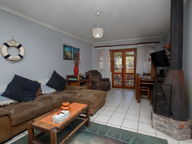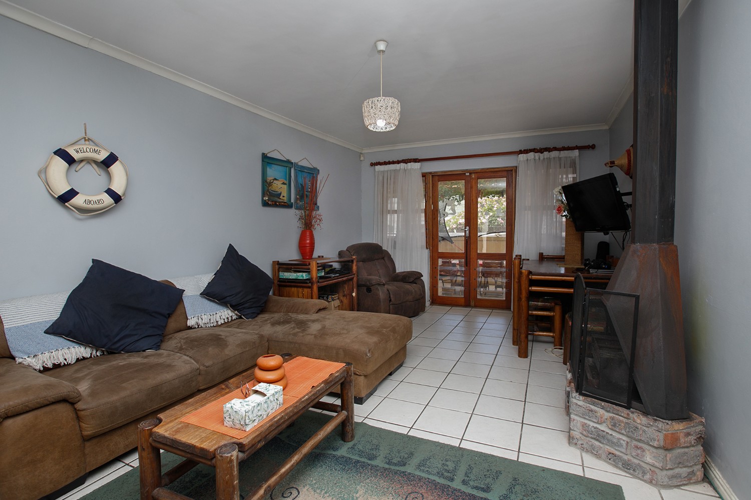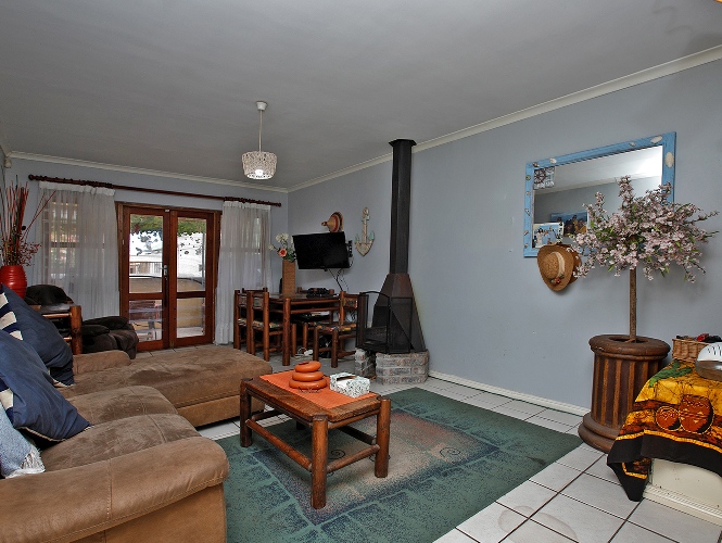 Lounge with Jetmaster fireplace, patio doors lead to a covered patio with a built-in braai.