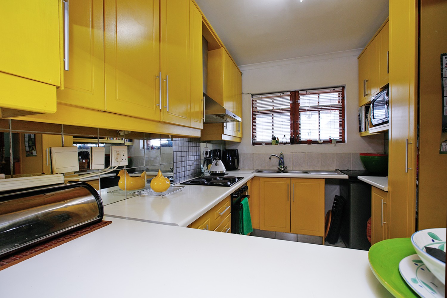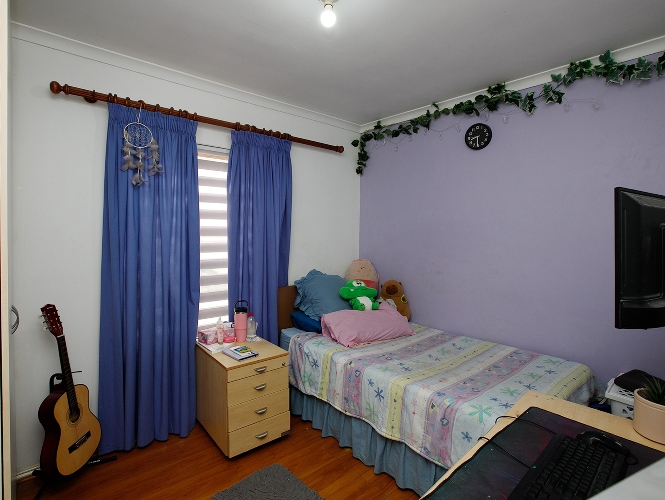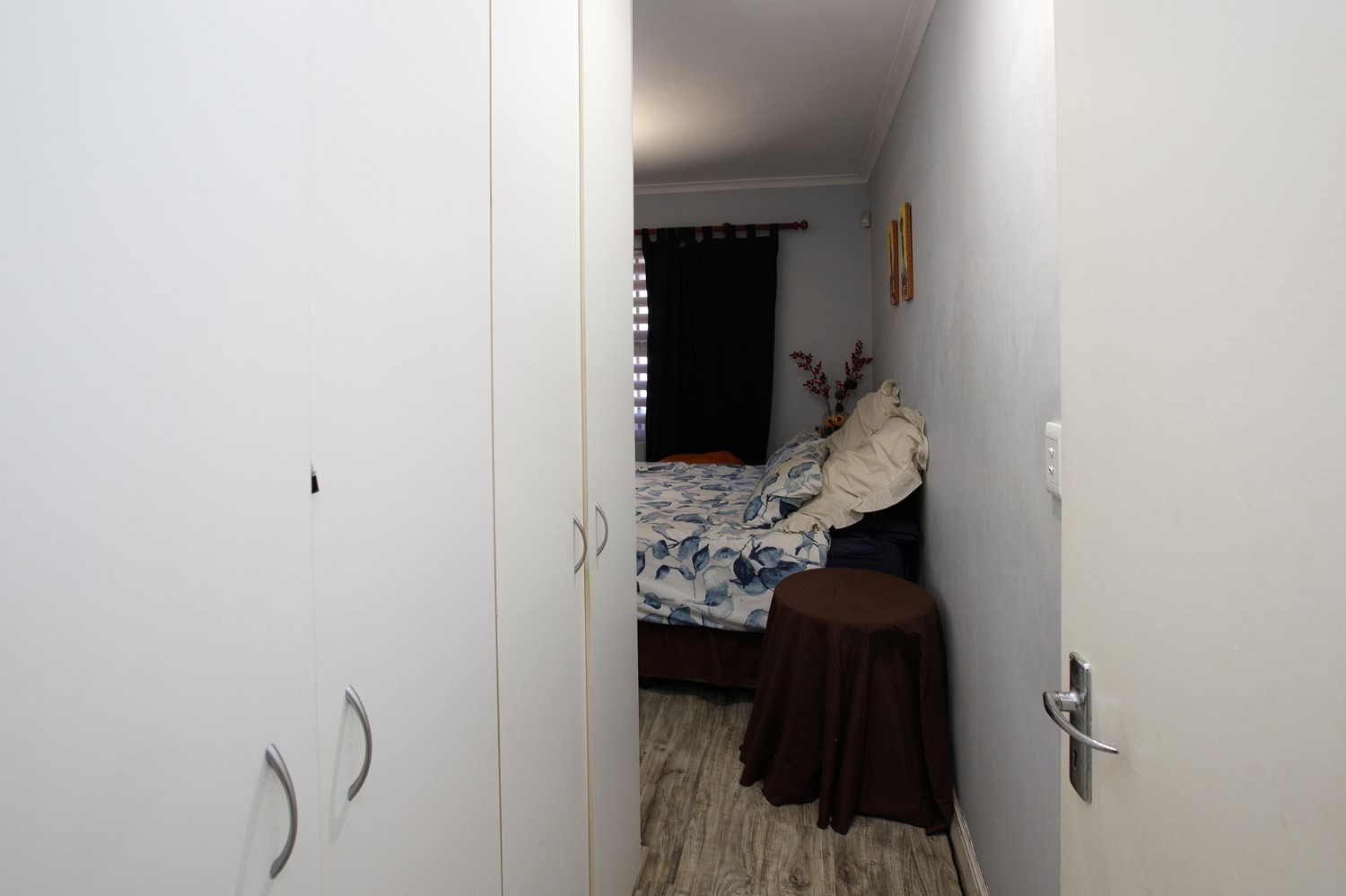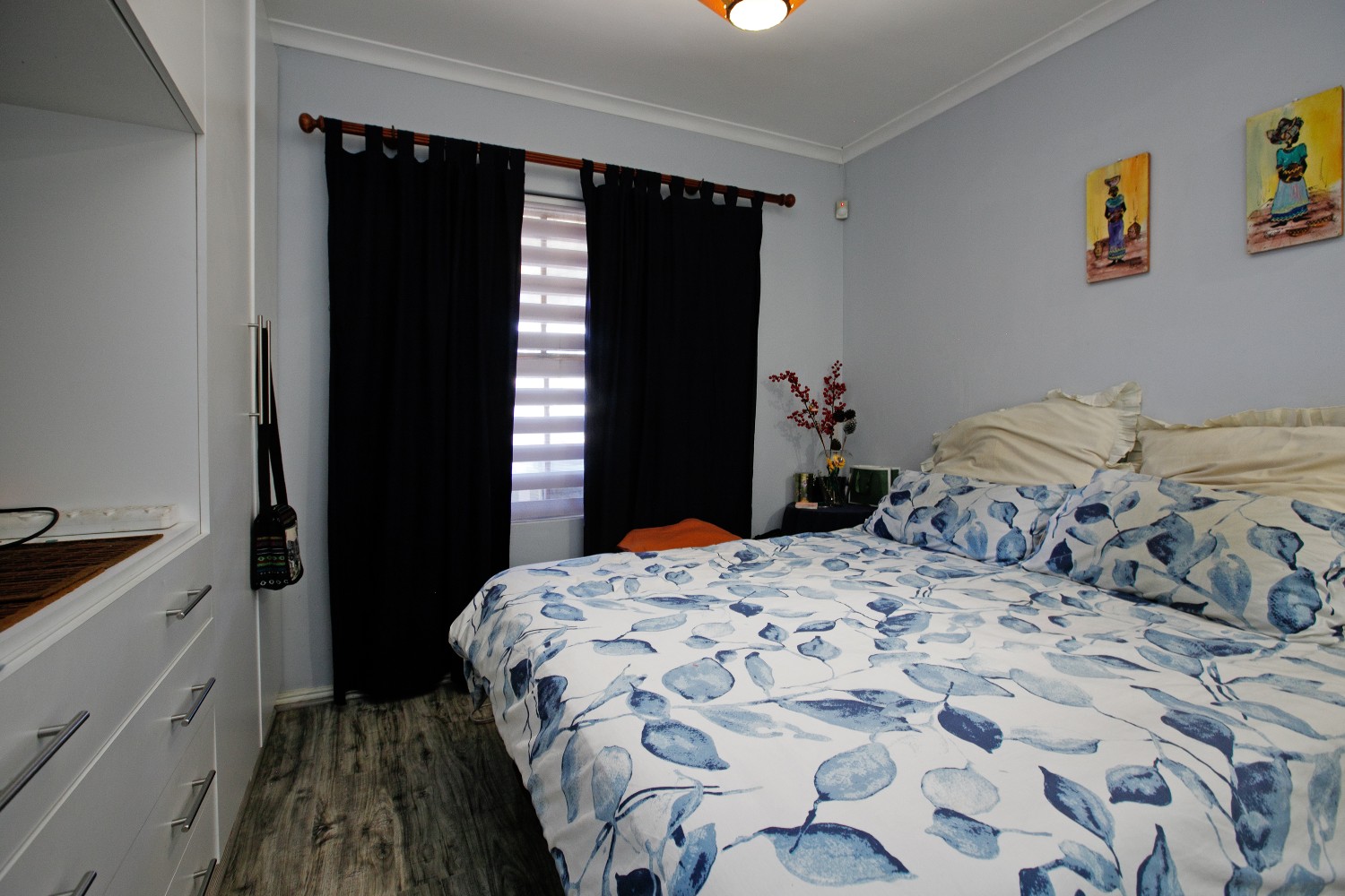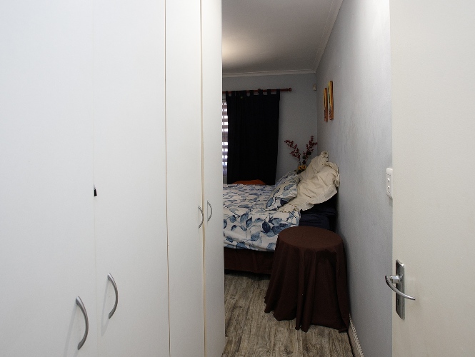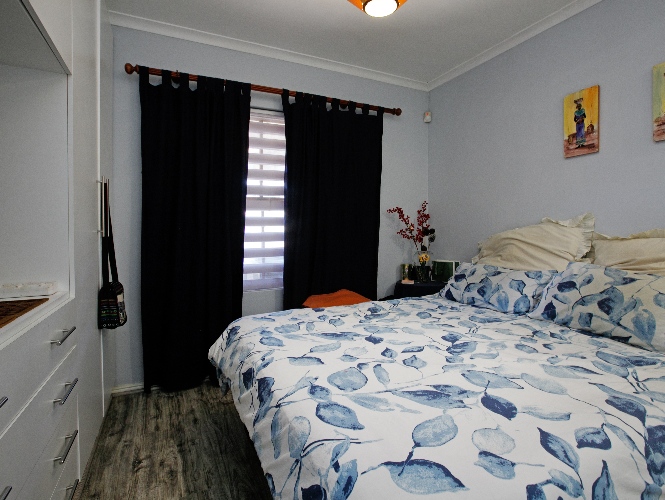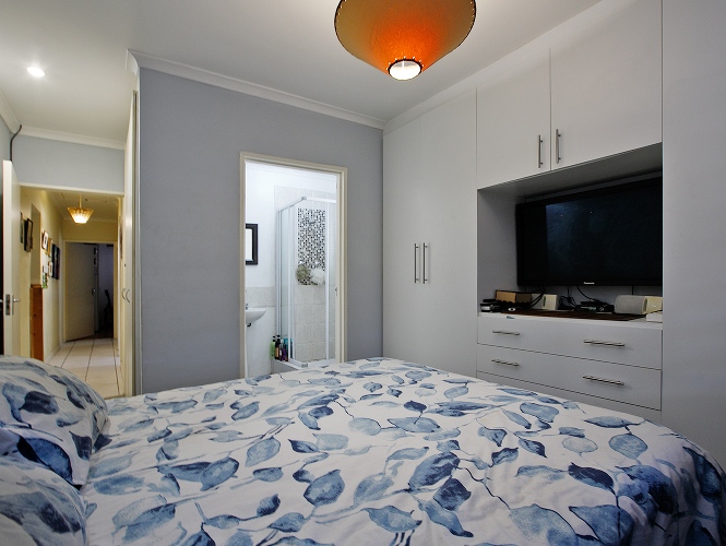 Two additional bedrooms, all bedrooms with built-in cupboards, laminated flooring, blinds, and clear burglar bars.