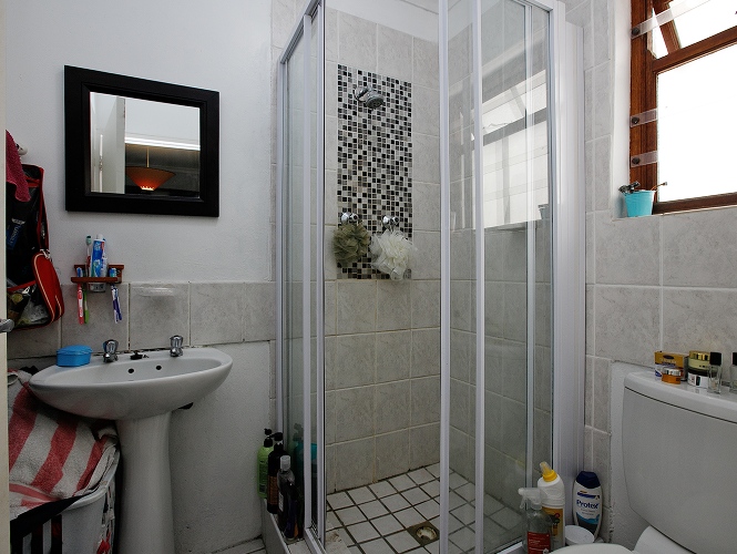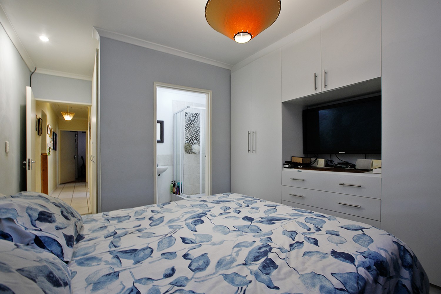 The main bedroom features laminated flooring and an en-suite bathroom with shower, basin, and toilet.