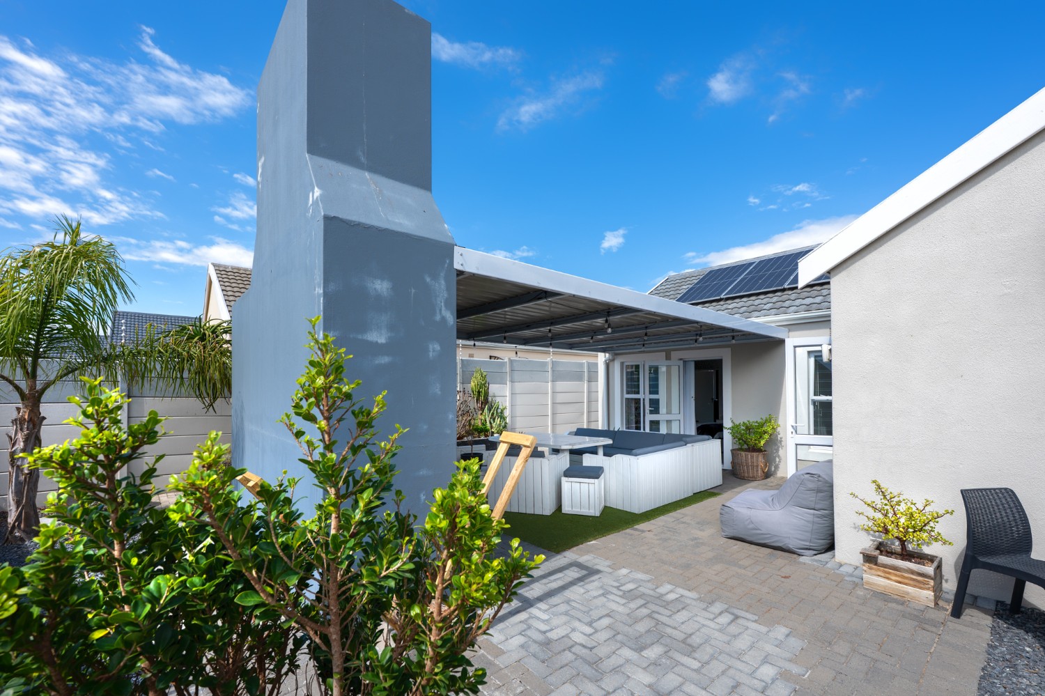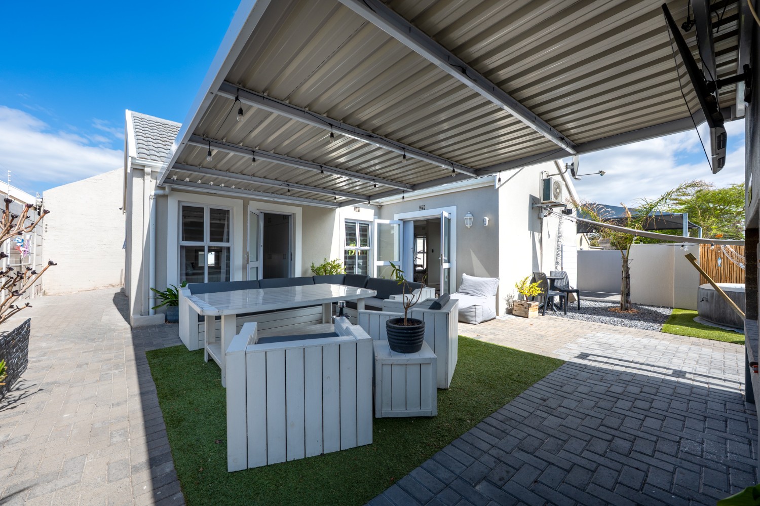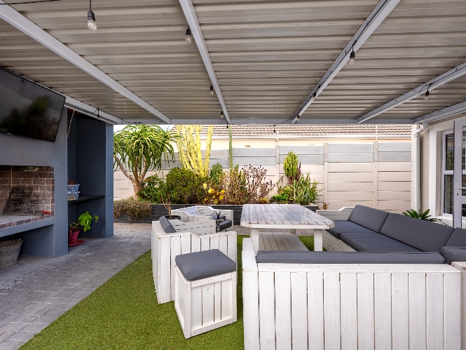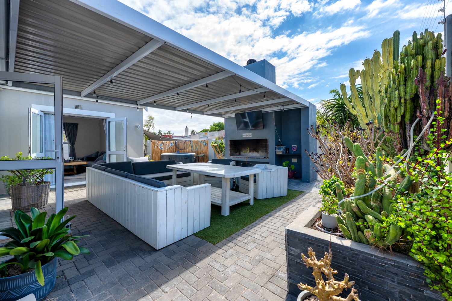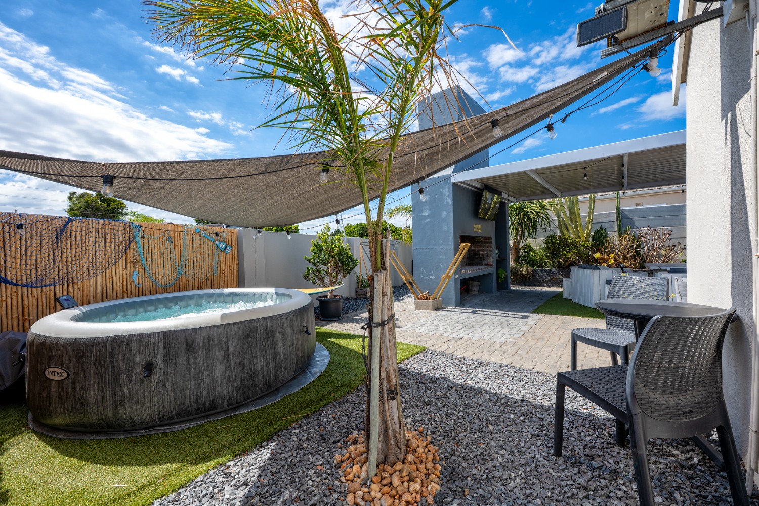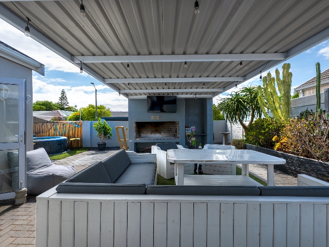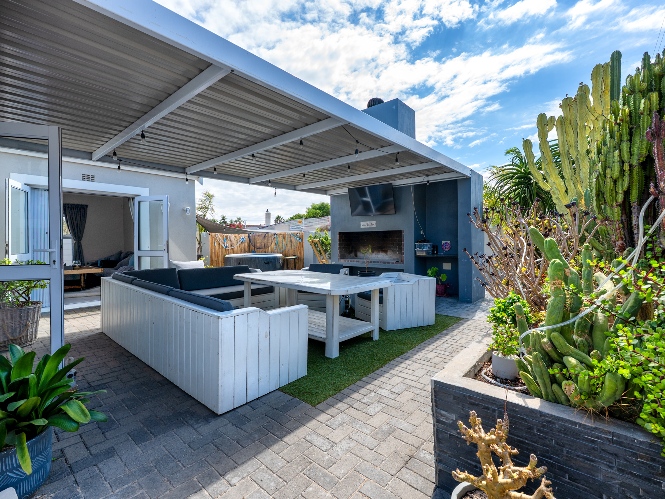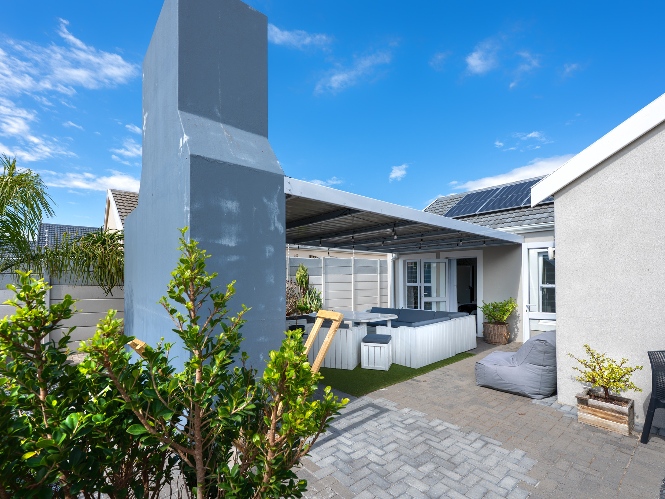 The heart of the home opens onto a stunning, fully paved entertainment area, complete with a covered patio and built-in braai, as well as a portable Intex PureSpa 4-person Deluxe Hot Tub, perfect for relaxed gatherings and year-round enjoyment.