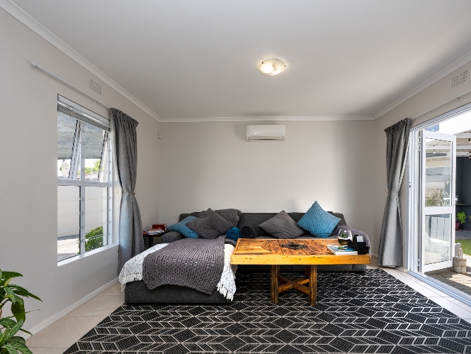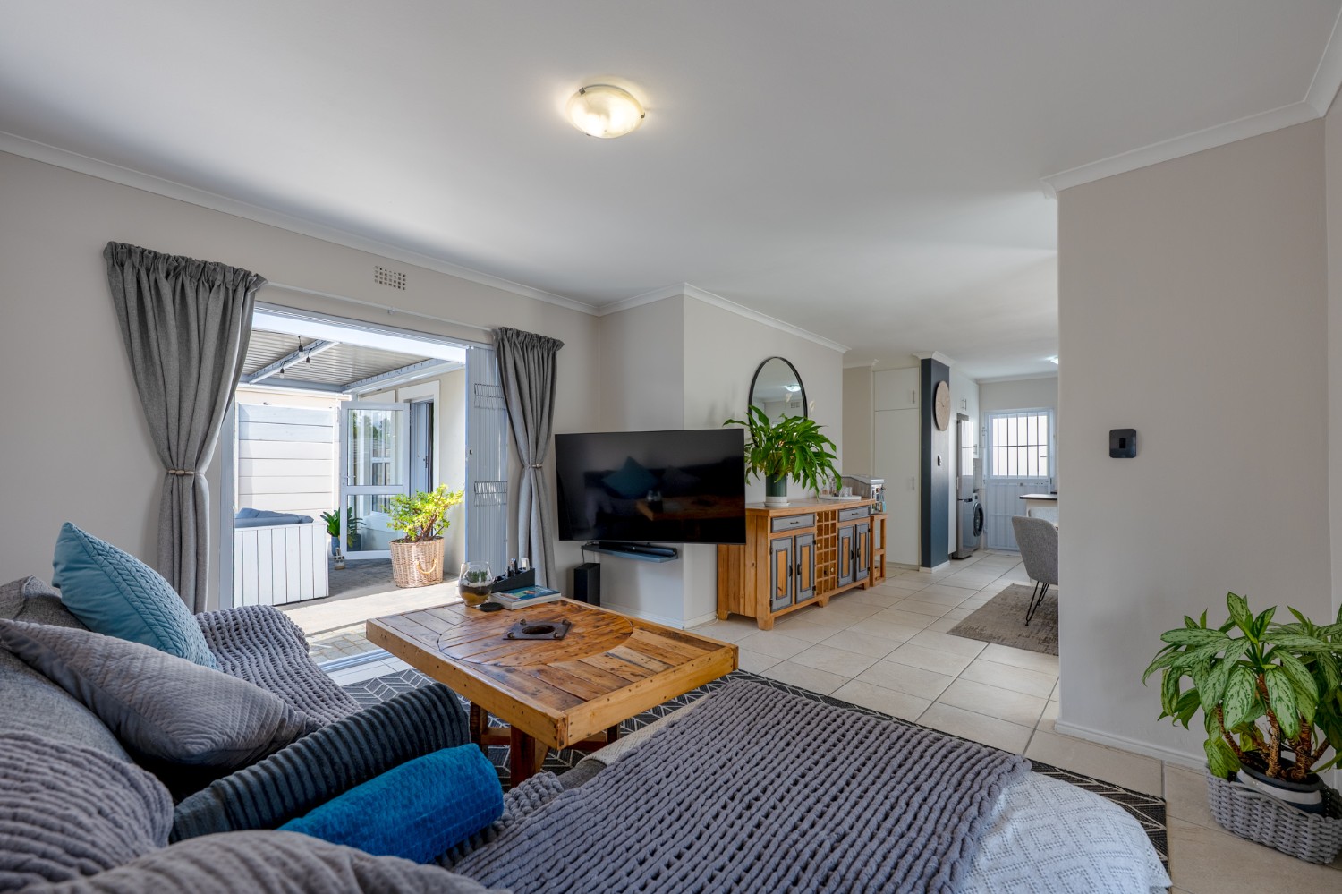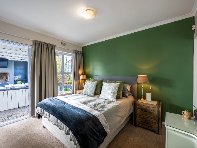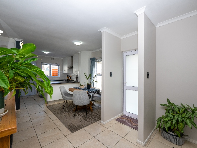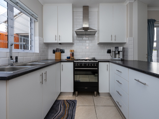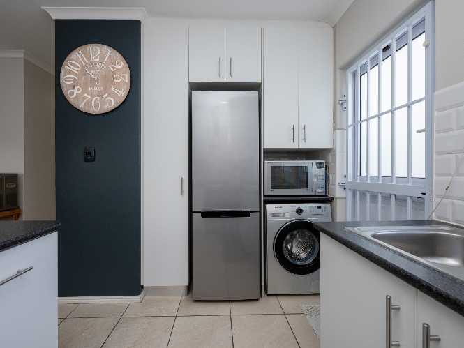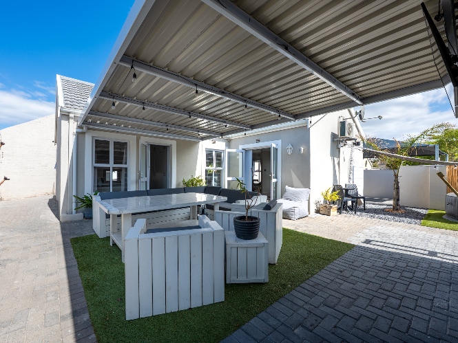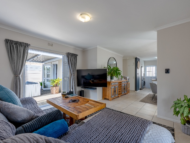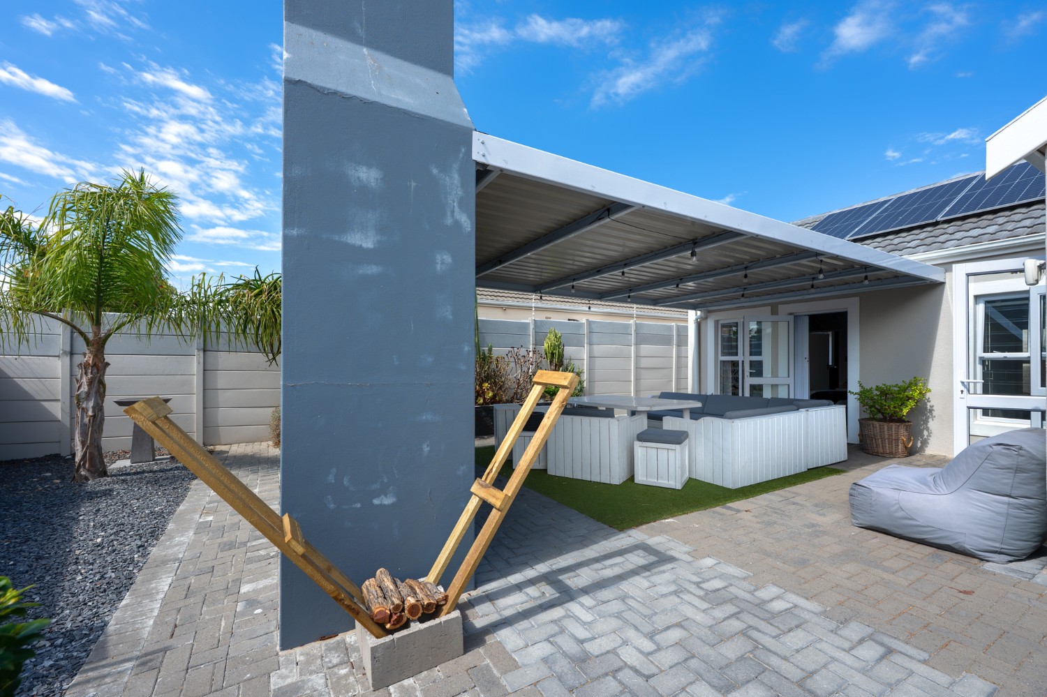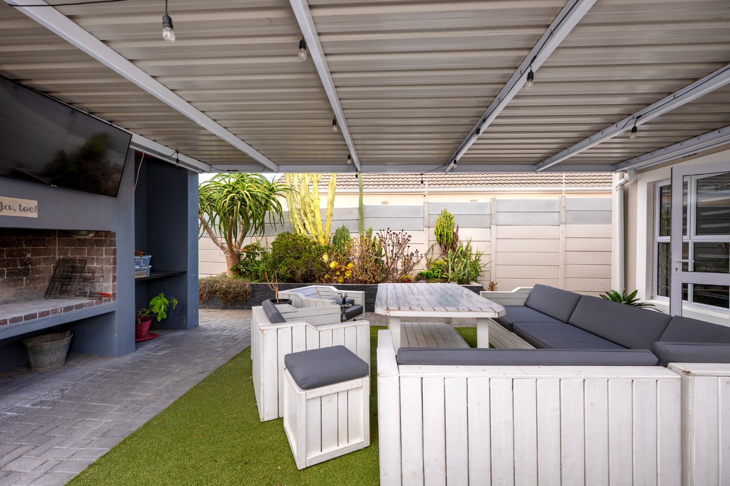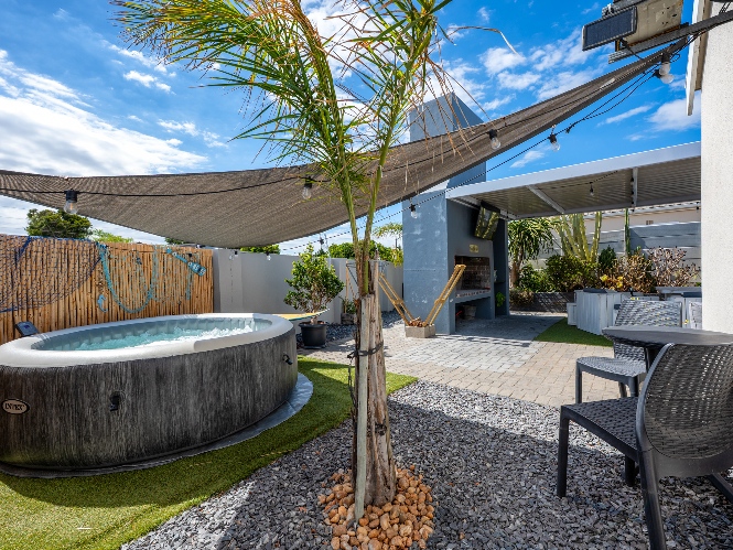 The heart of the home opens onto a stunning, fully paved entertainment area, complete with a covered patio and built-in braai, as well as a portable Intex PureSpa 4-person Deluxe Hot Tub, perfect for relaxed gatherings and year-round enjoyment.