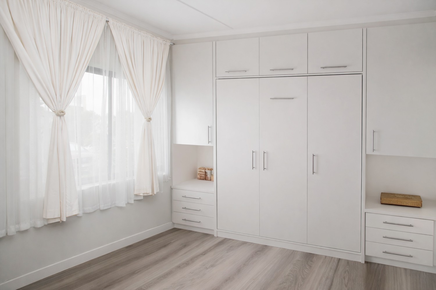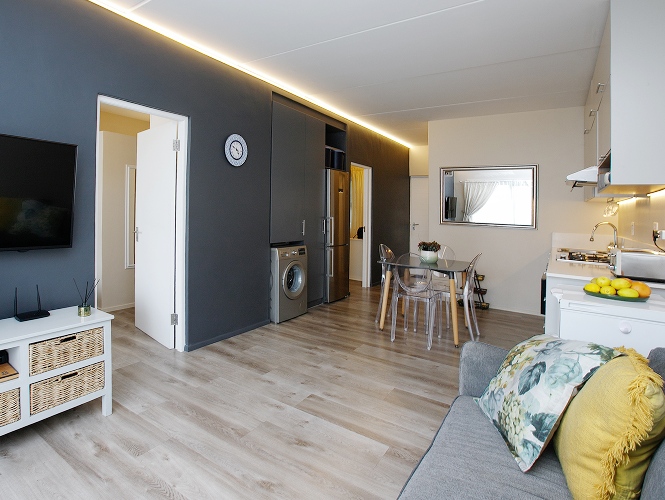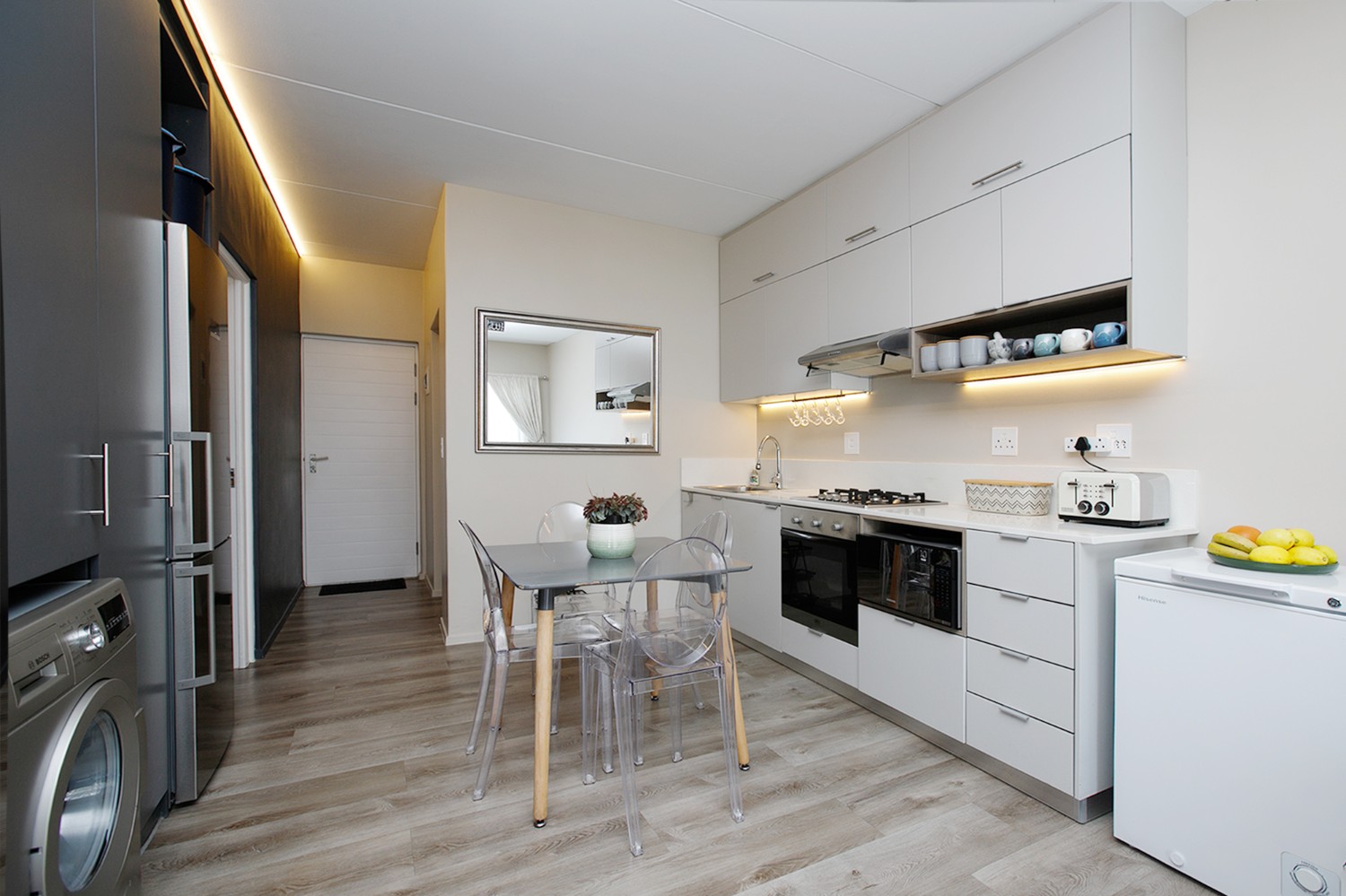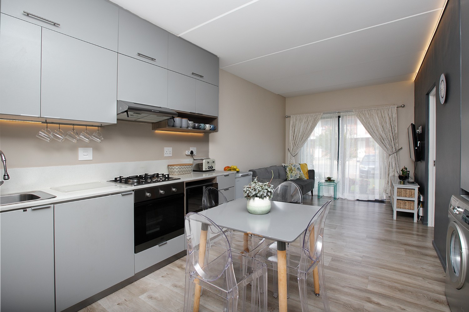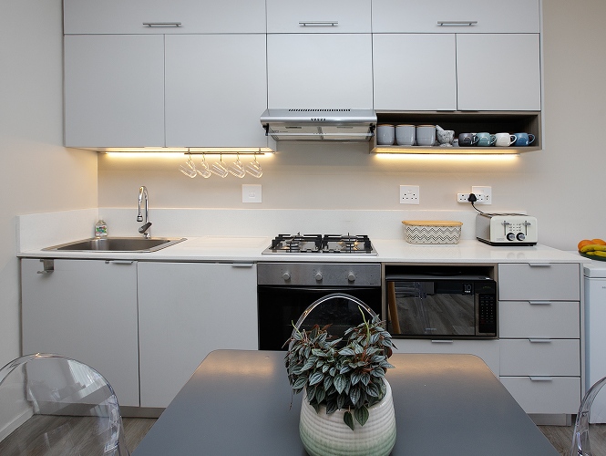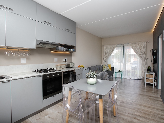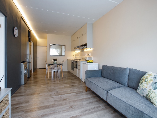 Open-plan kitchen and lounge. Additional cupboards were added in the kitchen.