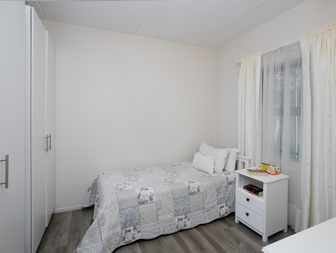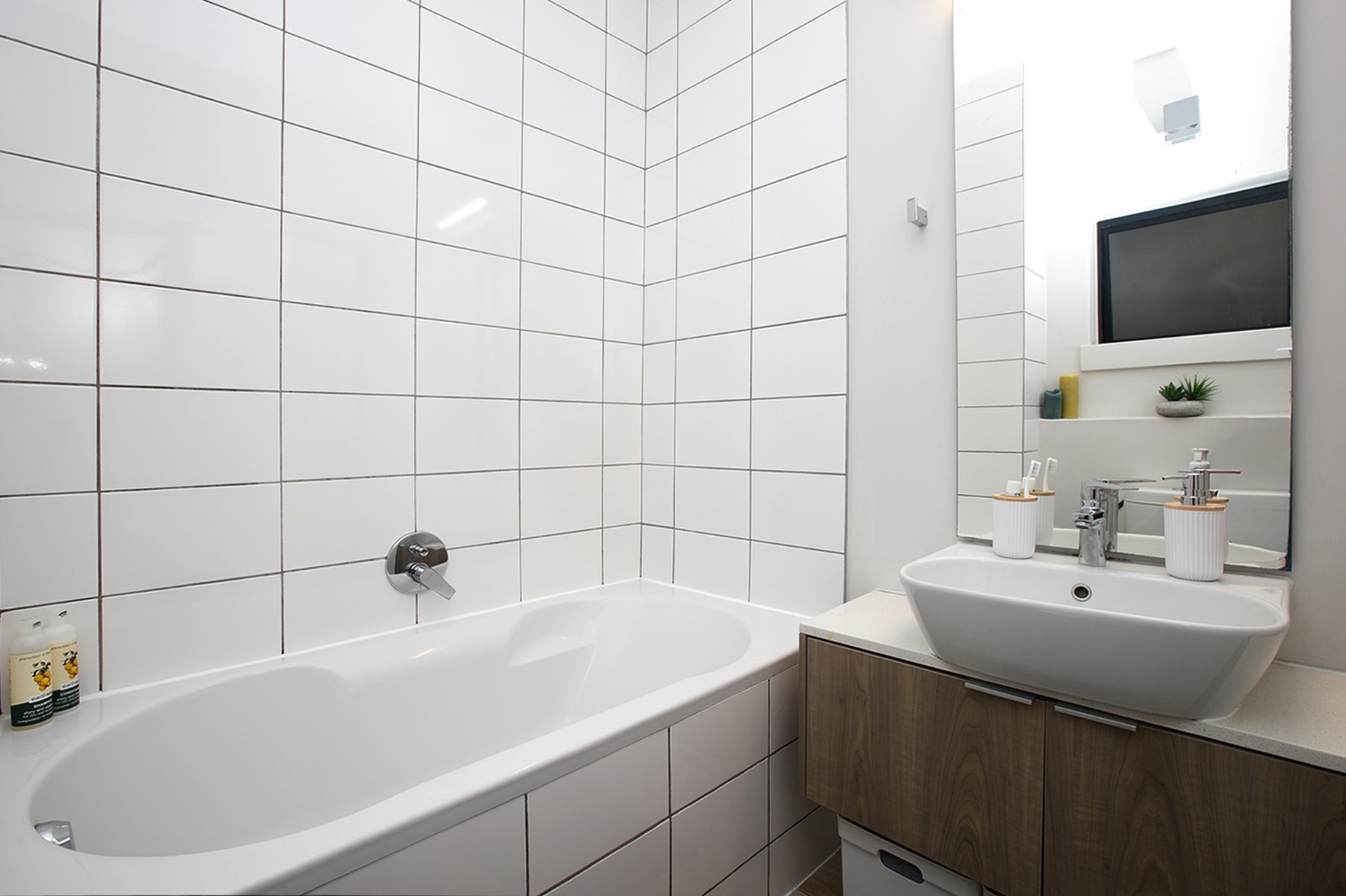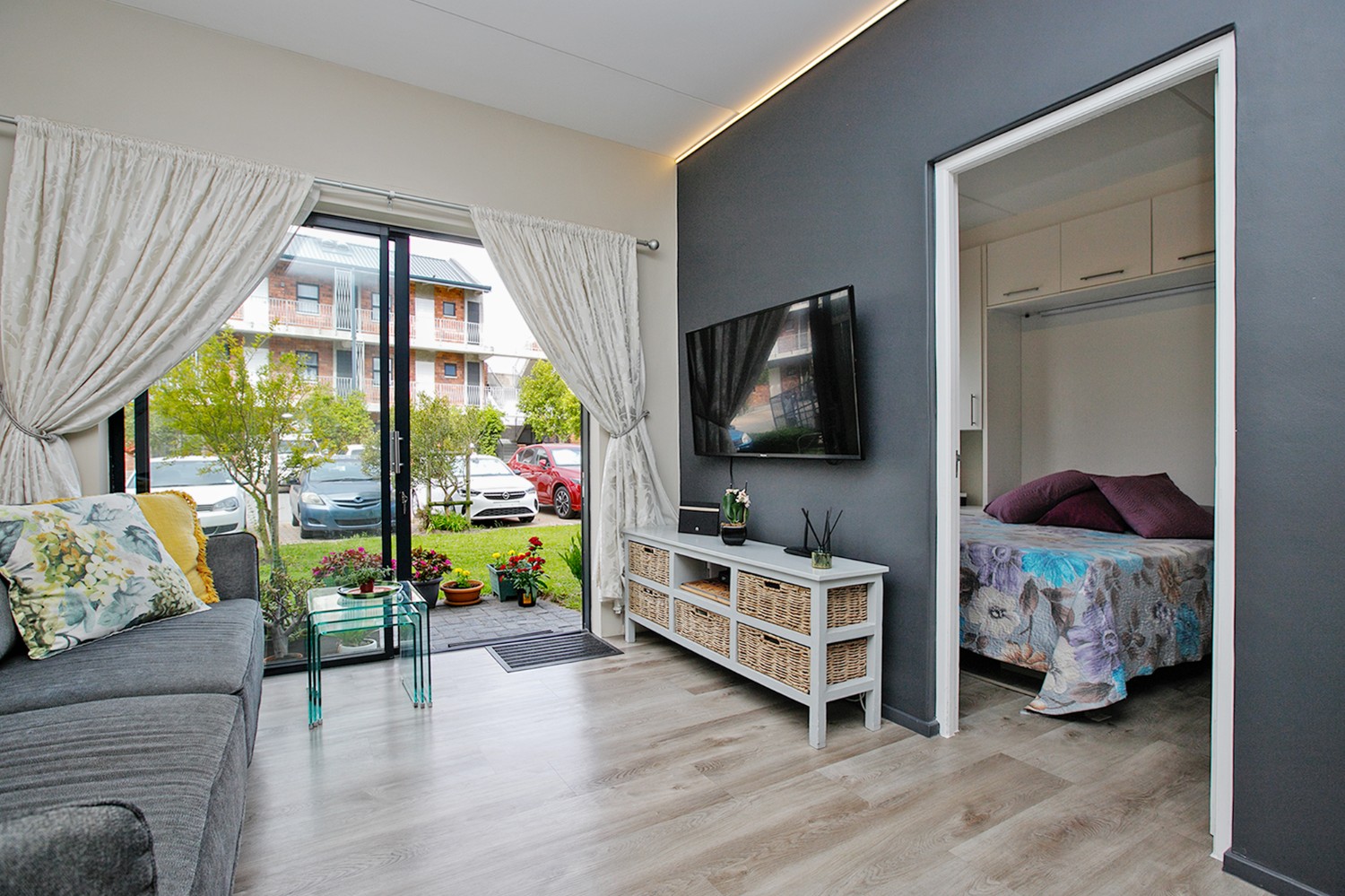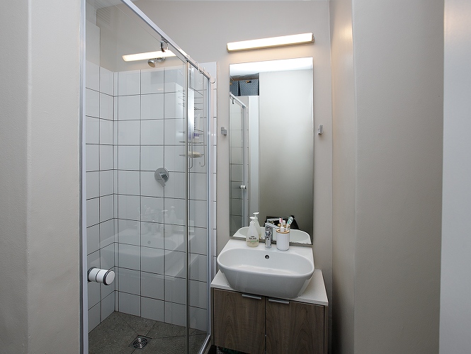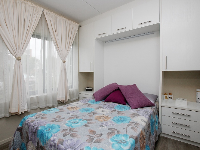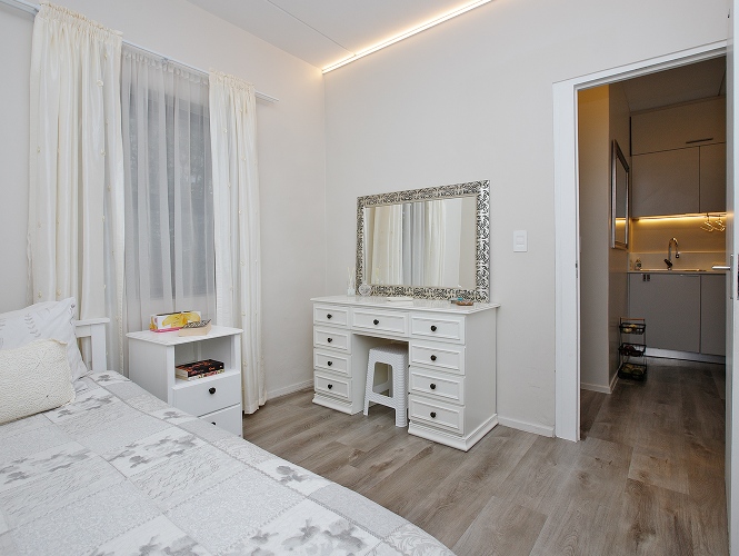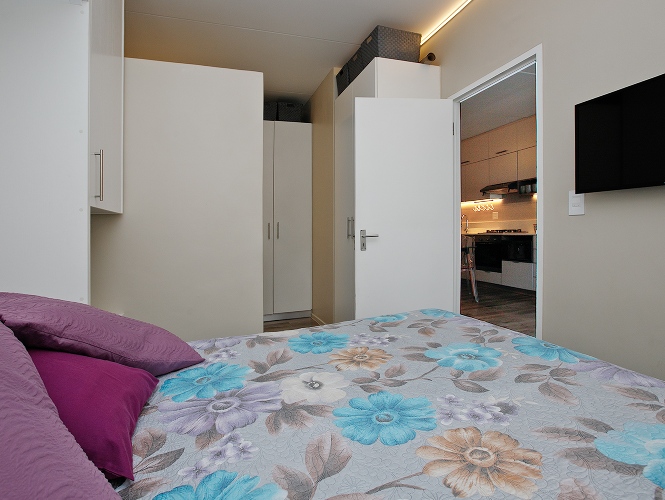 2 bedrooms and 2 stylish bathrooms. A fold-away bed was added to the Main bedroom that folds away for space-saving. This is a fixed feature that is included.