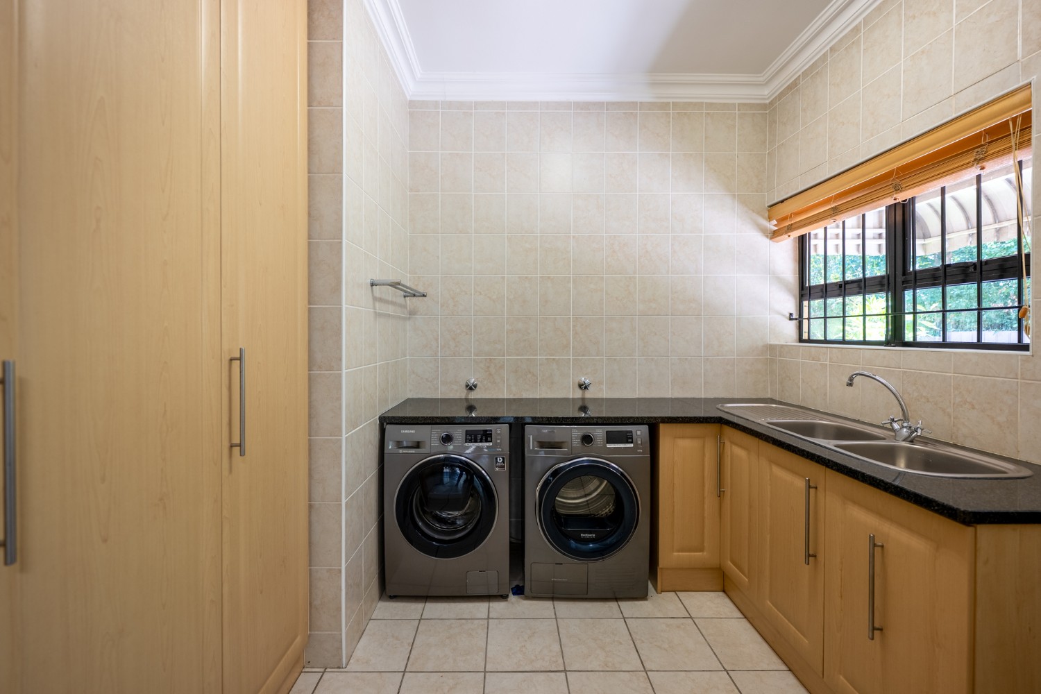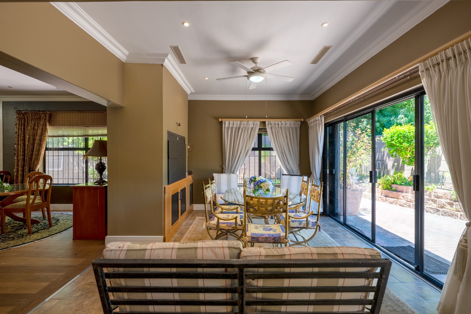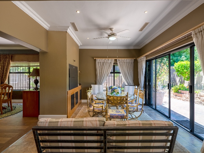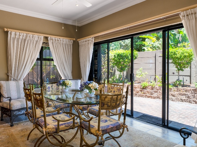 Adjacent to the lounge is an indoor entertainment area complete with a built-in braai and sliding doors that open onto the private yard, creating a seamless indoor-outdoor flow. In addition, there is a guest toilet.