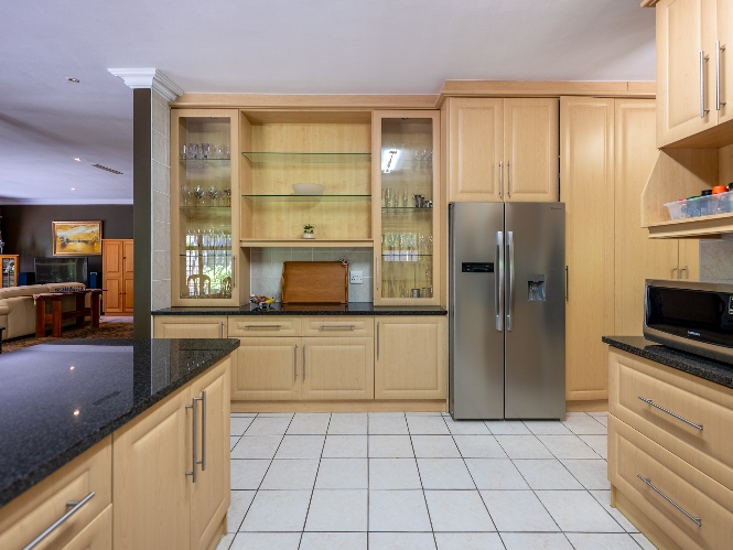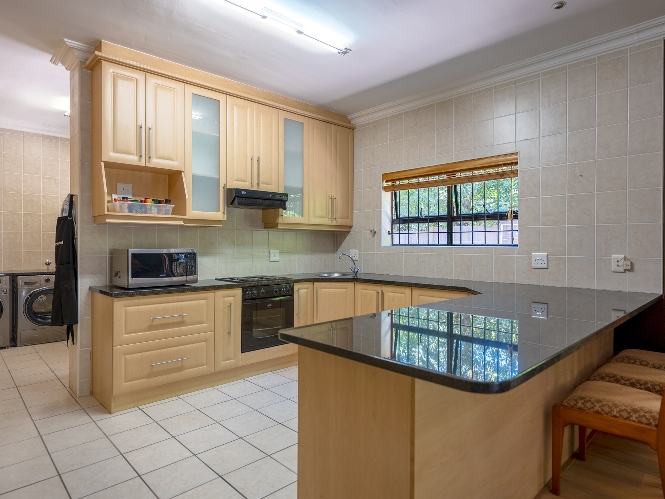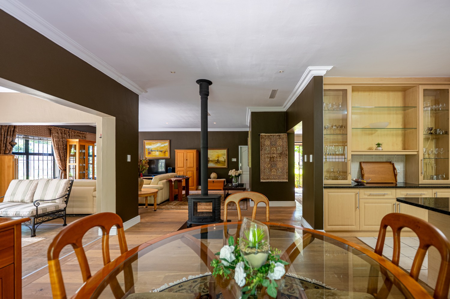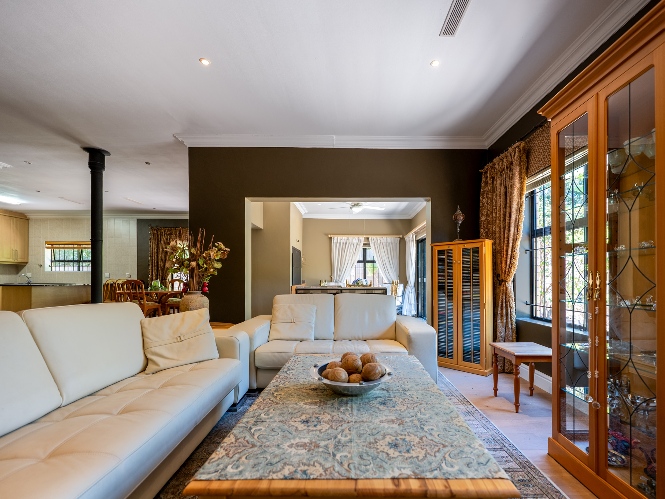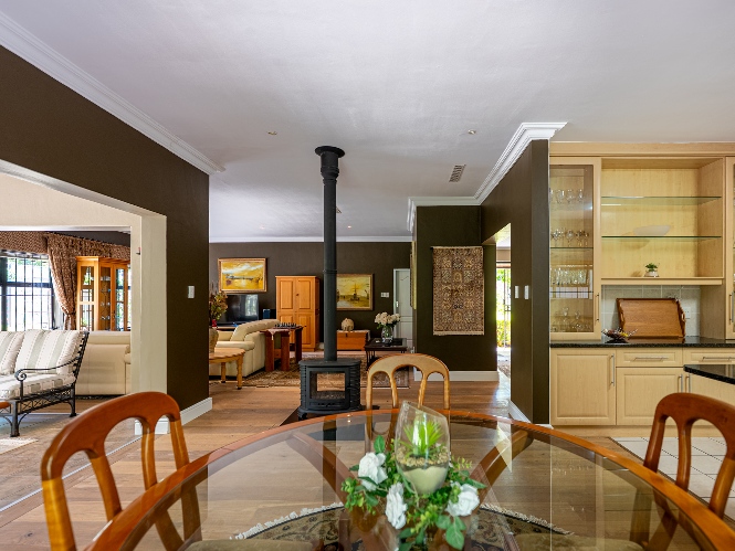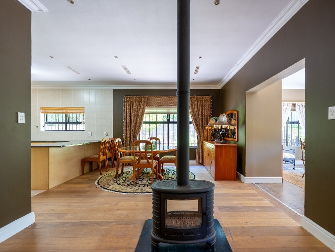 As you enter the home through the entrance hall, you are welcomed by an expansive open-plan lounge and dining area. This inviting living space features beautiful wooden floors, central air-conditioning, and a cosy fireplace ideal for both everyday comfort and entertaining. The fully fitted kitchen is generously sized with ample cupboard space, granite countertops, an under-counter oven and hob, and a separate laundry/scullery equipped with two plumbing points and additional storage space.