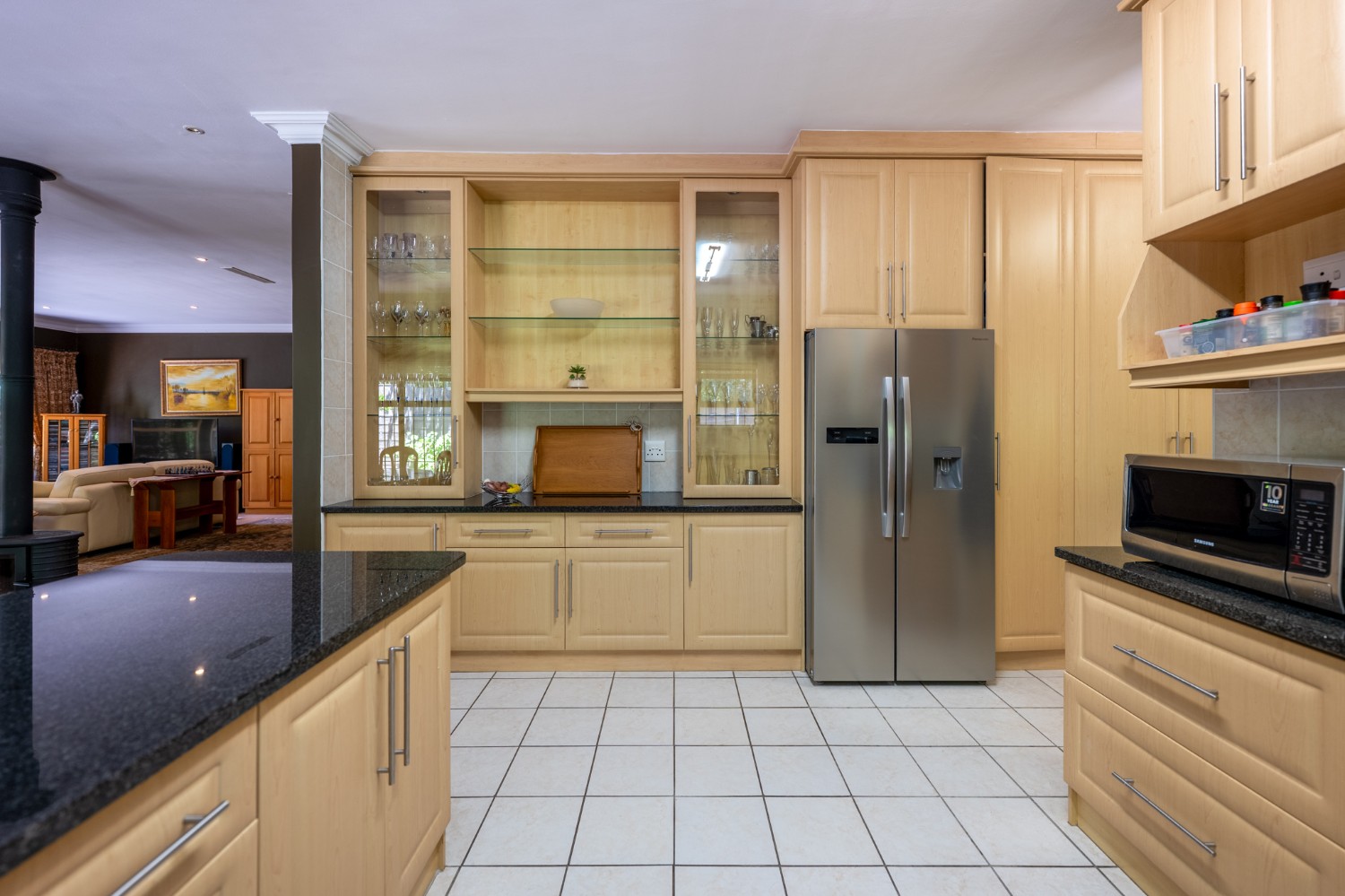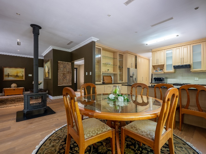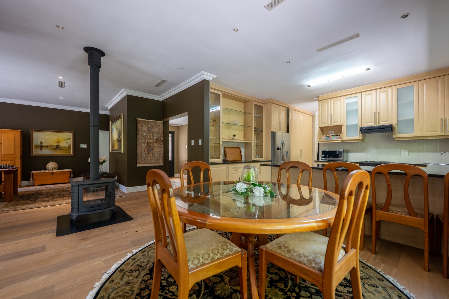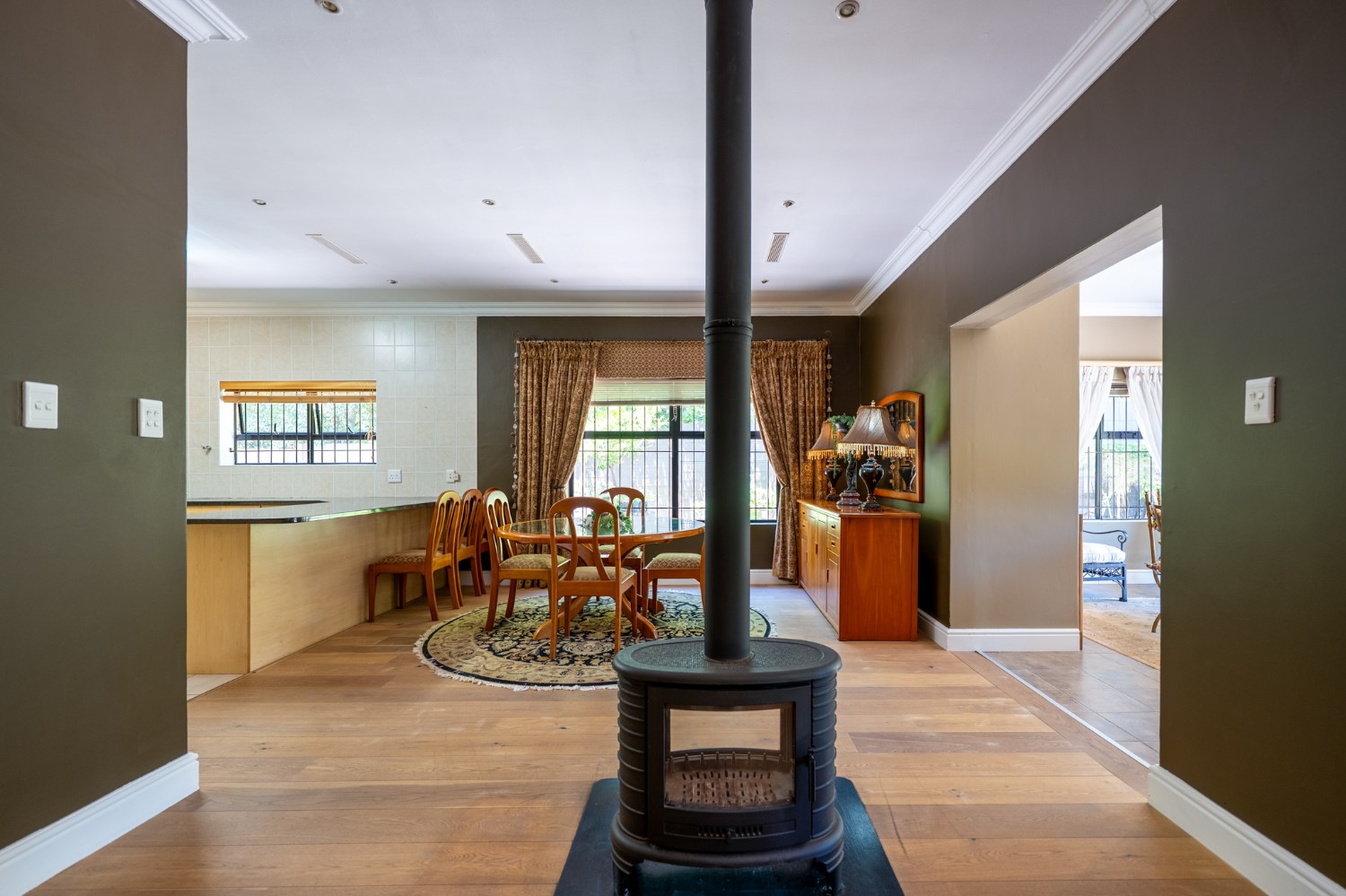 As you enter the home through the entrance hall, you are welcomed by an expansive open-plan lounge and dining area. This inviting living space features beautiful wooden floors, central air-conditioning, and a cosy fireplace ideal for both everyday comfort and entertaining. The fully fitted kitchen is generously sized with ample cupboard space, granite countertops, an under-counter oven and hob, and a separate laundry/scullery equipped with two plumbing points and additional storage space.