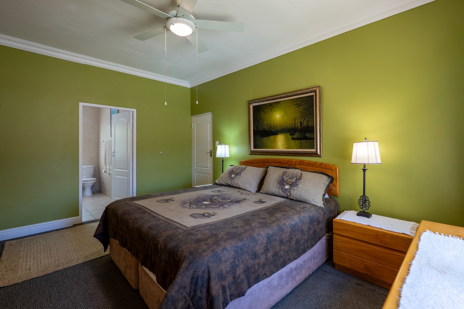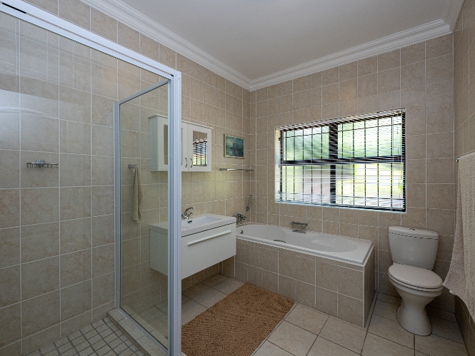 The home offers three spacious bedrooms, all fitted with built-in cupboards. The master bedroom includes air-conditioning and a tastefully tiled en-suite bathroom with a shower, bathtub, basin and toilet. The family bathroom is fitted with a shower, bathtub, basin with a storage cabinet, and toilet.
