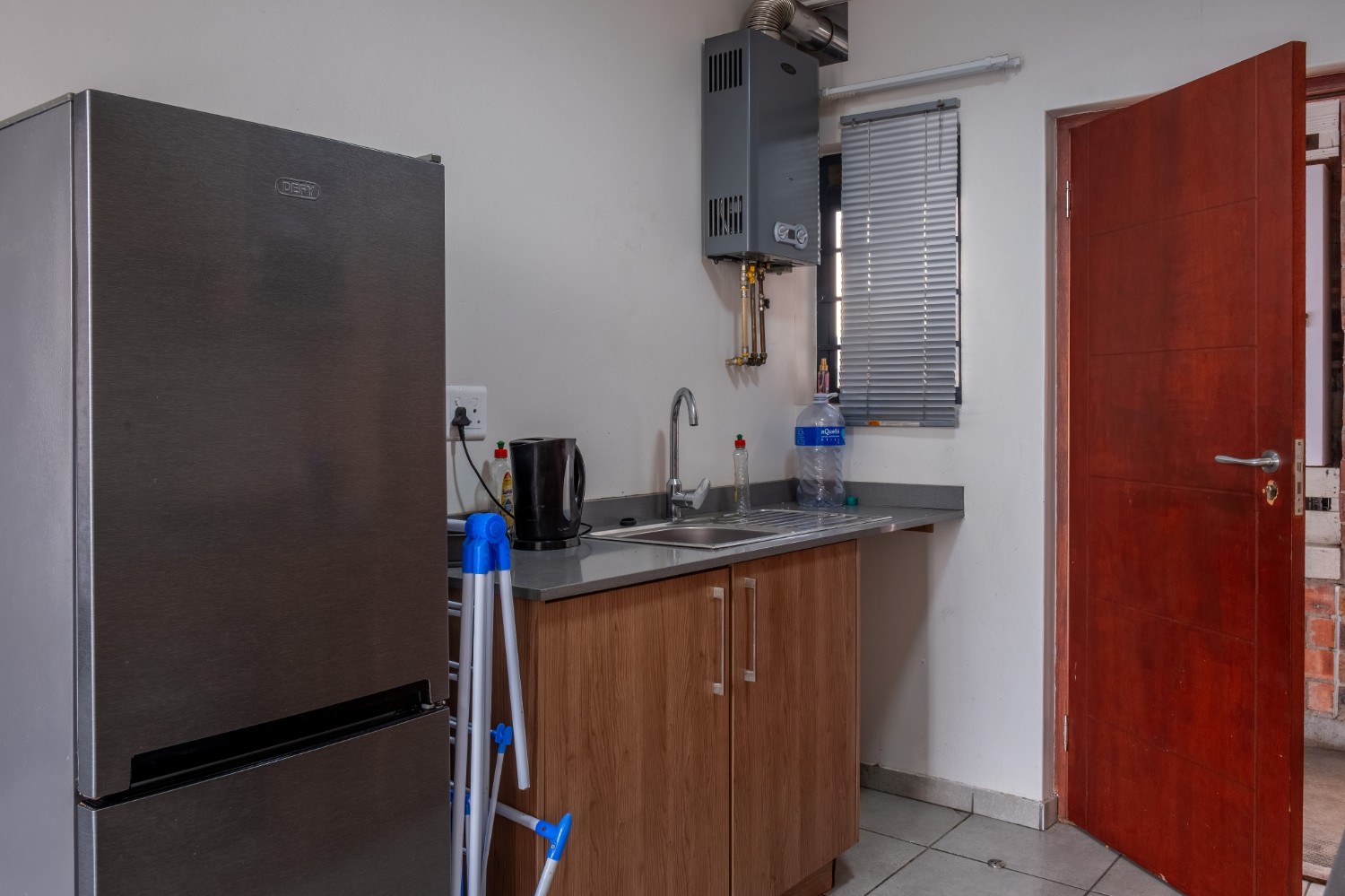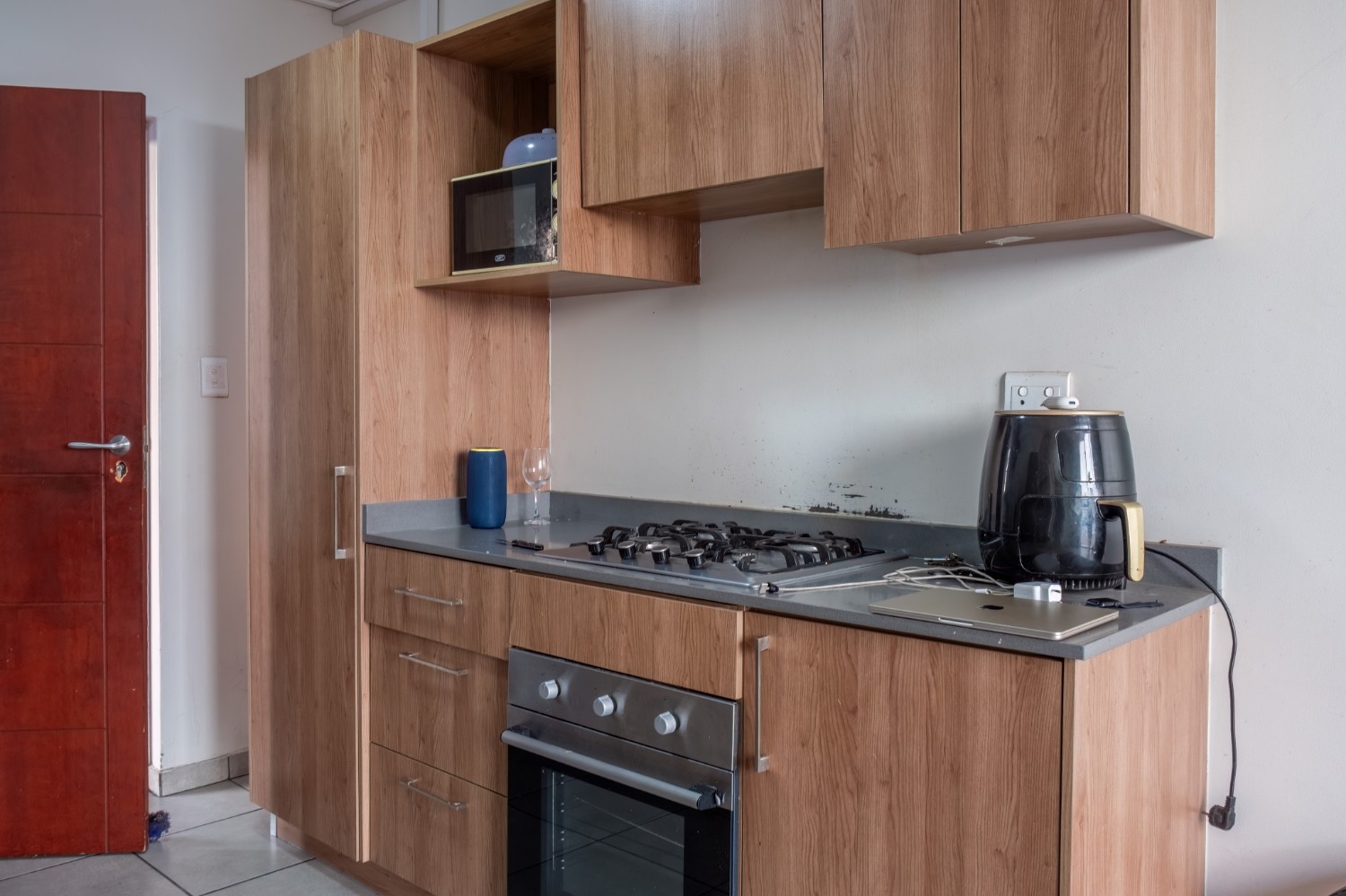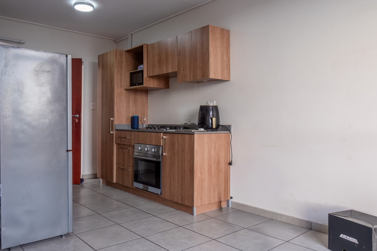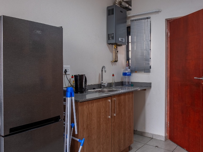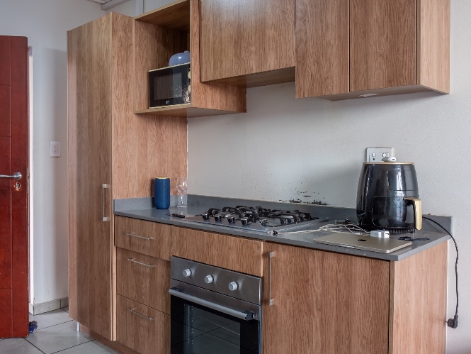 The apartment boasts a well-sized lounge with tiled flooring and large windows that allow for an abundance of natural sunlight, creating a bright and inviting living space. The open-plan kitchen is fitted with light wood cupboards and includes a gas stovetop with an under-counter oven, a plumbing point, and space for a fridge.